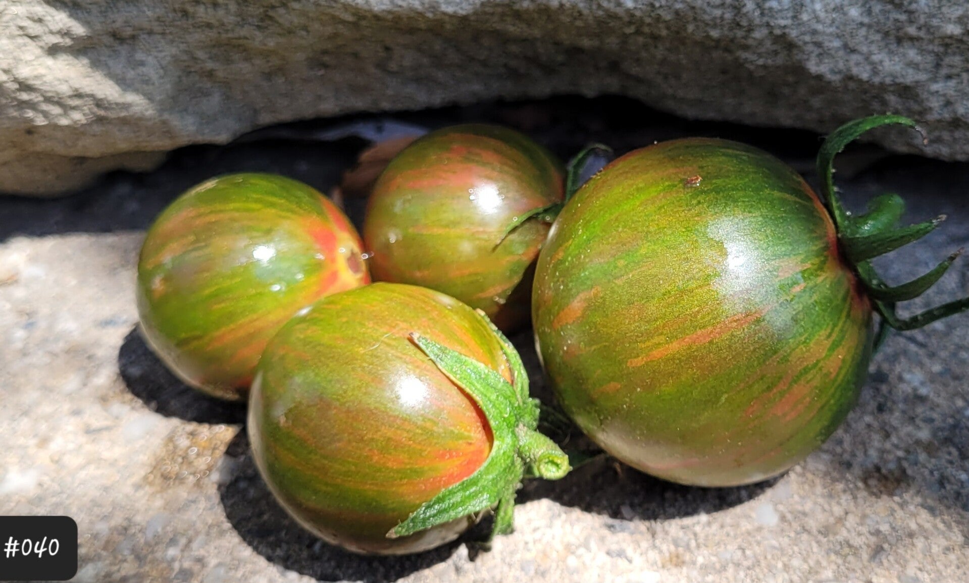 Glänzende runde grüne Früchte mit rosa Streifen auf der ganzen Oberfläche. Das Fruchtfleisch ist mehrfarbig, von burgunderrot bis rosa. Es ist sehr weich und saftig und schmeckt ausgezeichnet aromatisch.