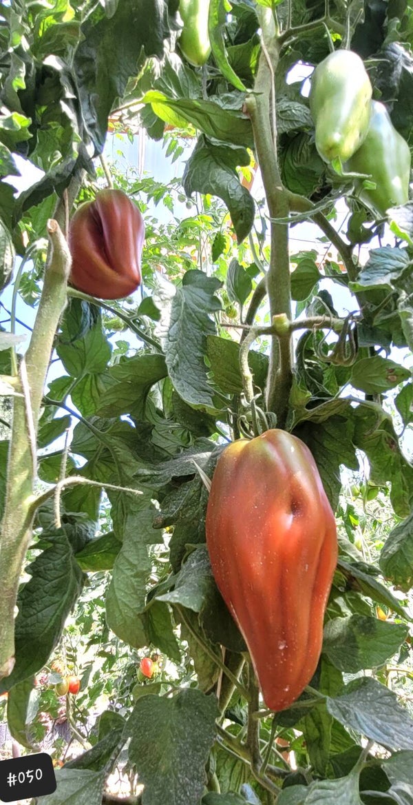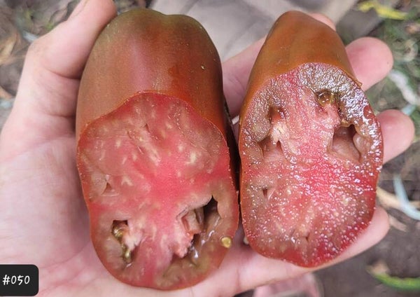 Die Früchte sind ocker, länglich, groß, mit dichtem Fruchtfleisch. Sie hat kaum Flüssigkeit und Kerne, und im Querschnitt sieht sie spektakulär dicht aus. Auch der Geschmack ist toll, ausgewocgen fruchtig tomatig und etwas würzig, wie für dunkle Tomaten typisch.