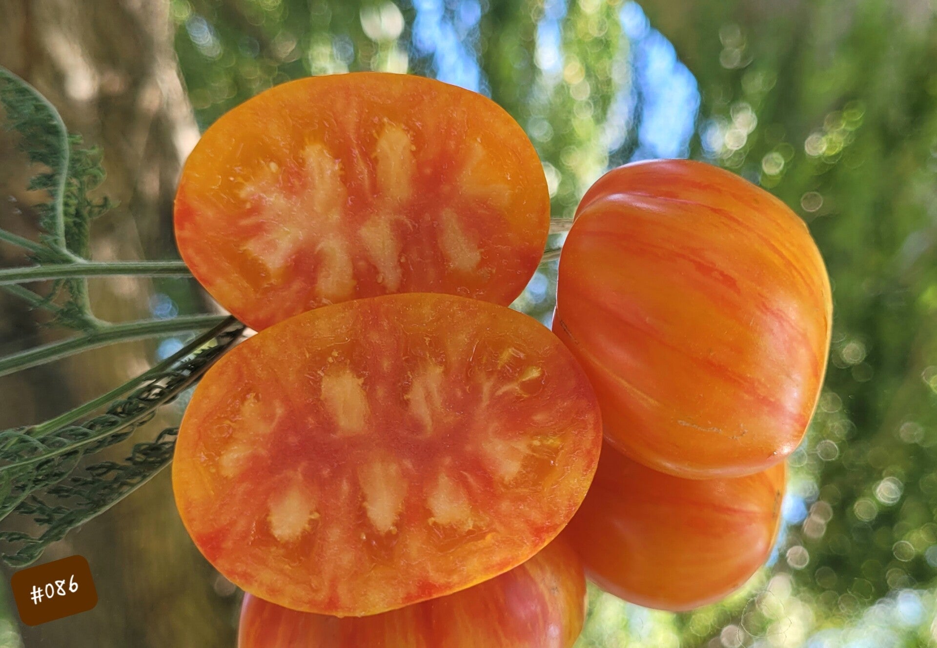 Äußerst produktive Multiflora-Sorte mit pflaumen- bis birnenförmigen Früchten. Die Früchte sind verschiedengroß. Sie schmecken sehr fruchtig und süß. Die Schale ist sehenswert orange, pink und gelb gestreift. Die riesigen Blütenstände bilden mehrere Dutzend Tomaten zum Ernten.