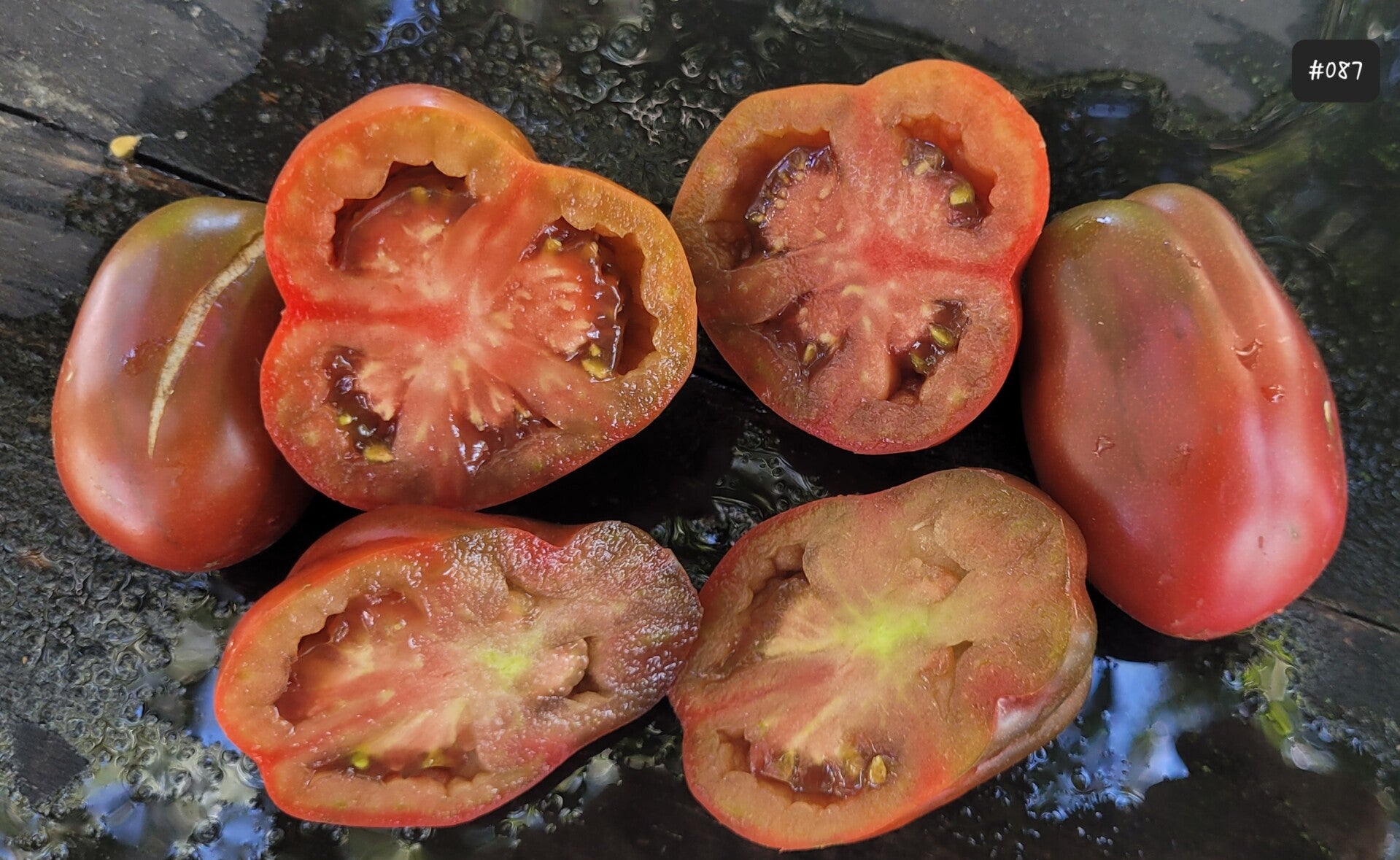 Eine sehr interessante und leckere Sorte mit hübschen Früchte. Diese sind verschieden geformt, allgemein beutelförmig, teilweise tief gerippt, manchmal aber auch oval oder herzförmig. Sie sind dunkel mit olivfarbener Schulter. Sie schmecken sehr aromatisch, süß mit guter Säure. Sie haben wenig Gallerte und manchmal findet man im Inneren auch kleine Hohlräume.