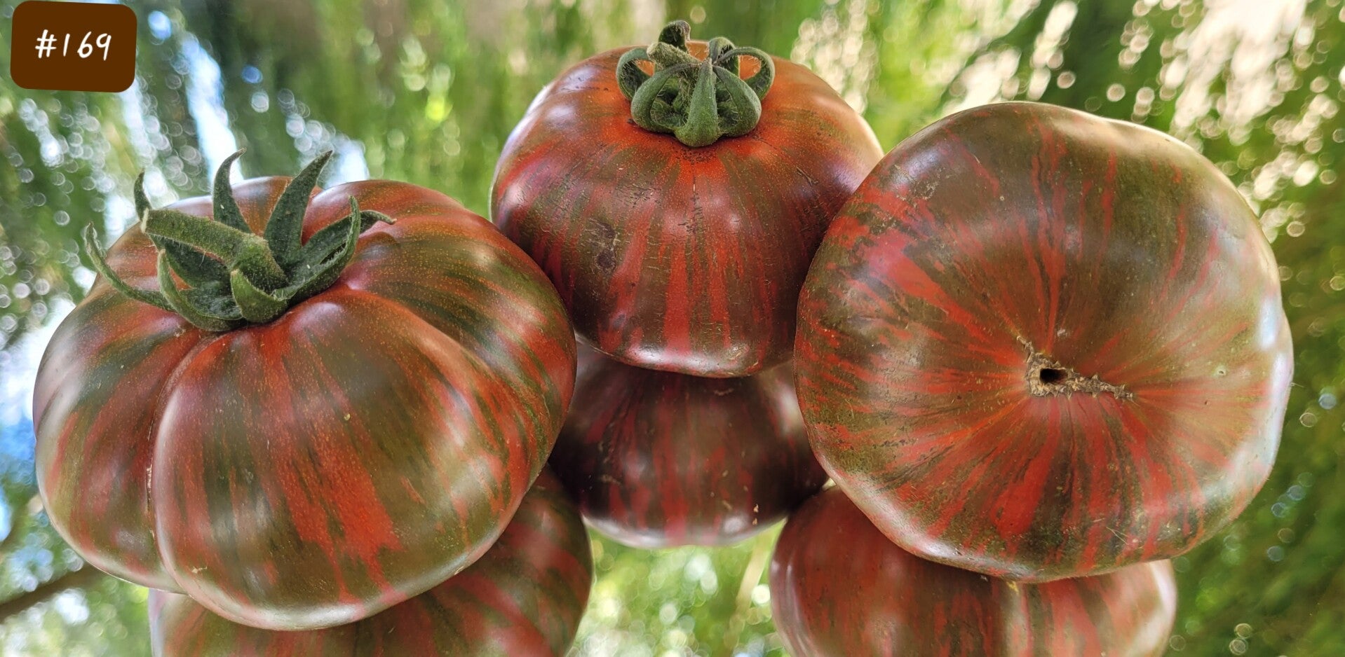 Eine wunderschöne kräftig dunkelrote Frucht mir grünen Streifen. Die Tomate glänzt dadurch förmlich. Sie hat saftiges Fruchtfleisch, dunkelrot mit rot-rosa Adern und grüner Gallerte. Der Geschmack ist sehr gut, sehr aromatisch intesiv und vorallem würzig mit einer feinen Süße.