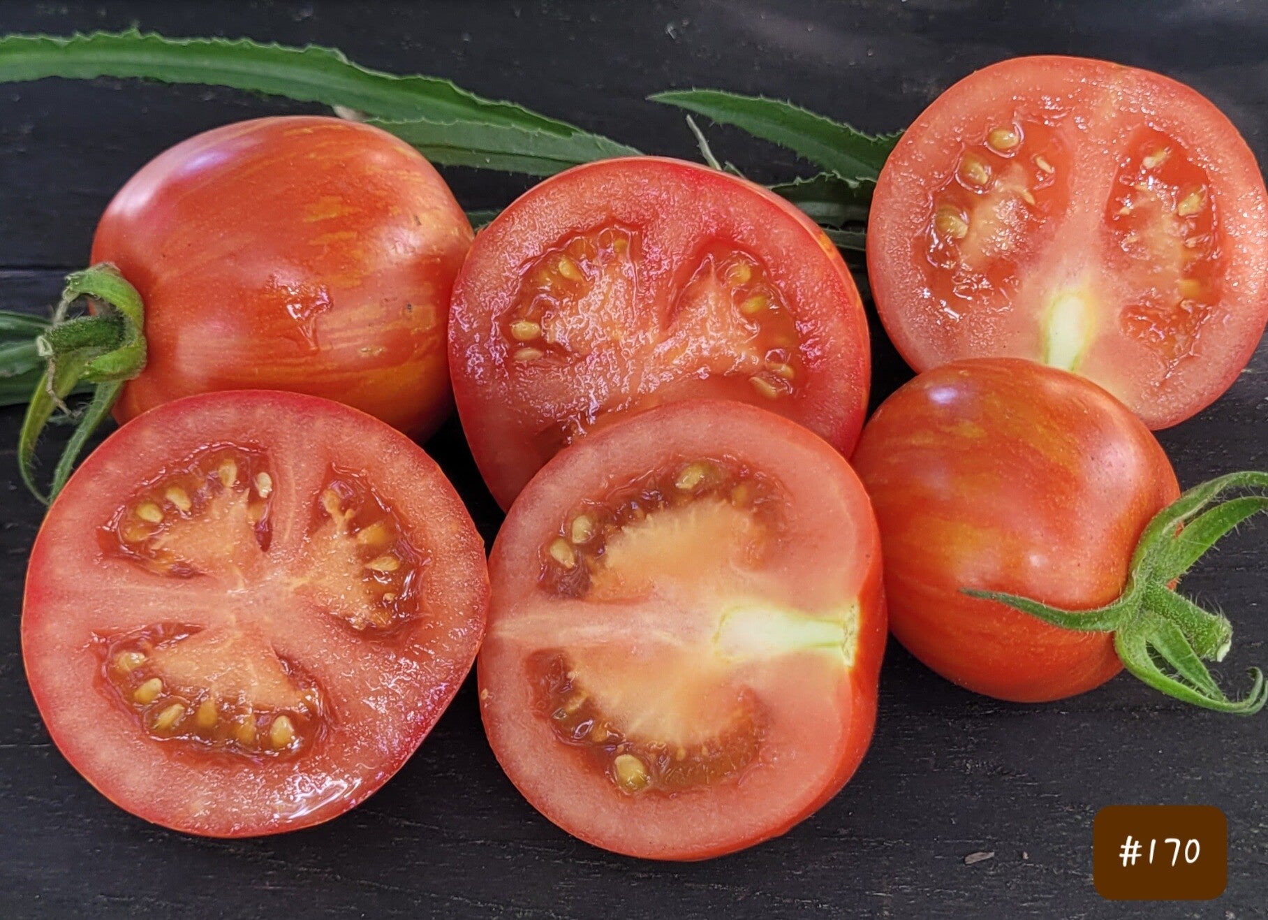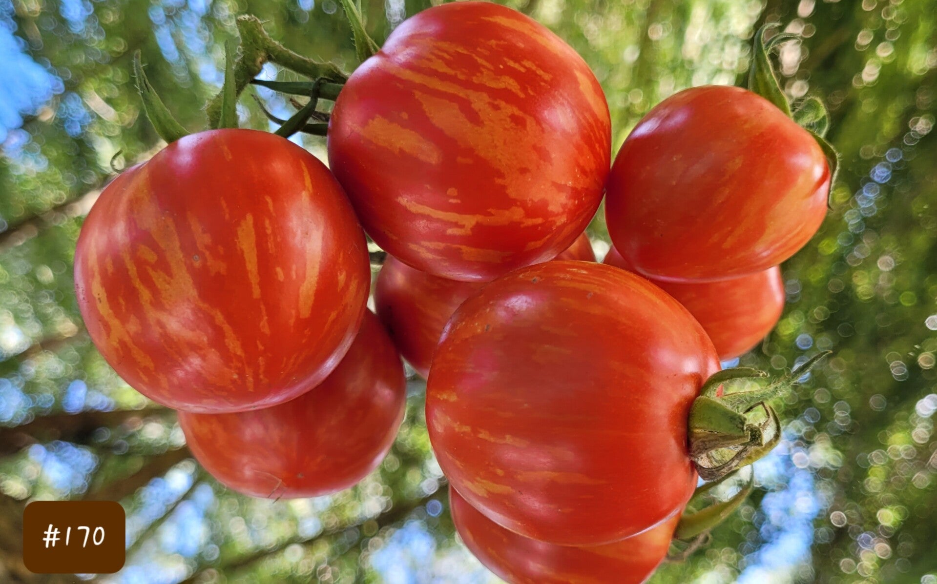 Die kartoffelblättrigen Pflanzen sind panaschiert, aber nur am Anfang der Entwicklung der Pflanze. Sobald Früchte angesetzt werden, verliert sich die Weißfärbung. Der Ertrag ist sehr gut.