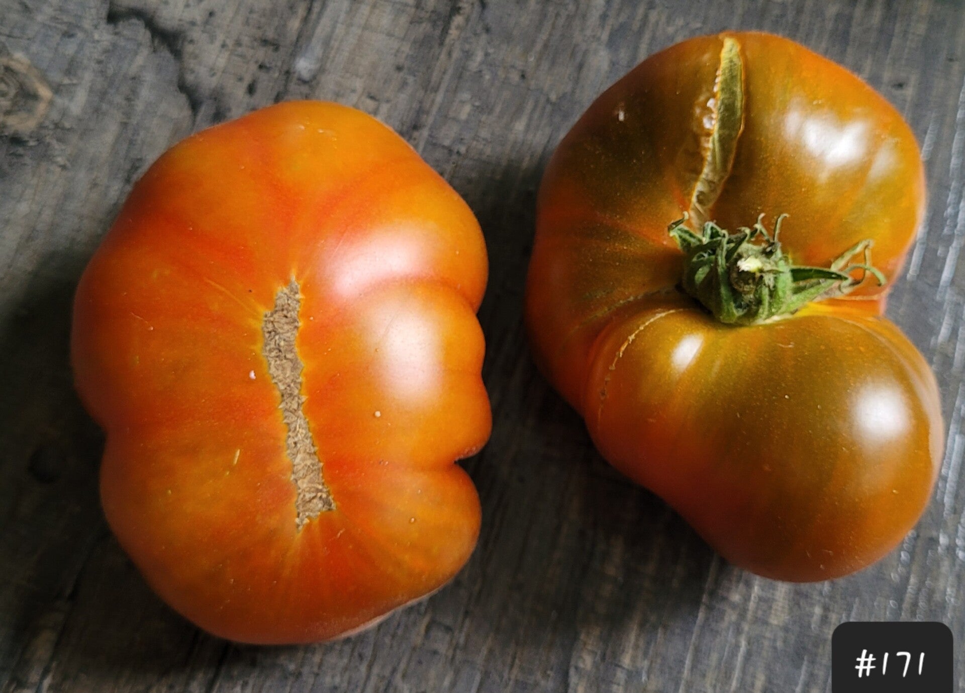 Ein kräftiger Busch mit dunkelgrünem, kräftigen Laubwerk. Dazwischen funkeln die strahlend ocker-orangefarbenen Früchte hervor. Diese sind verschieden geformt, meist plattrund und etwas gerippt. Im Inneren verbrigt sich mehrfarbiges, sehr saftiges Fruchtfleisch, von grün-gelb bis hin zu orange. Der Geschmack ist intensiv mit einem hoher Zuckergehalt.