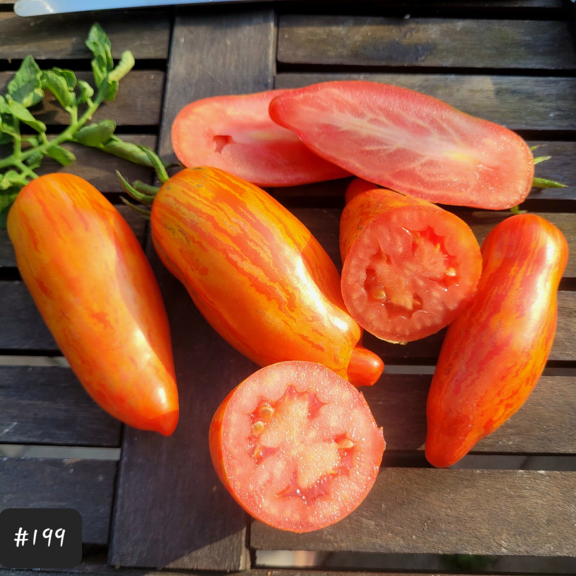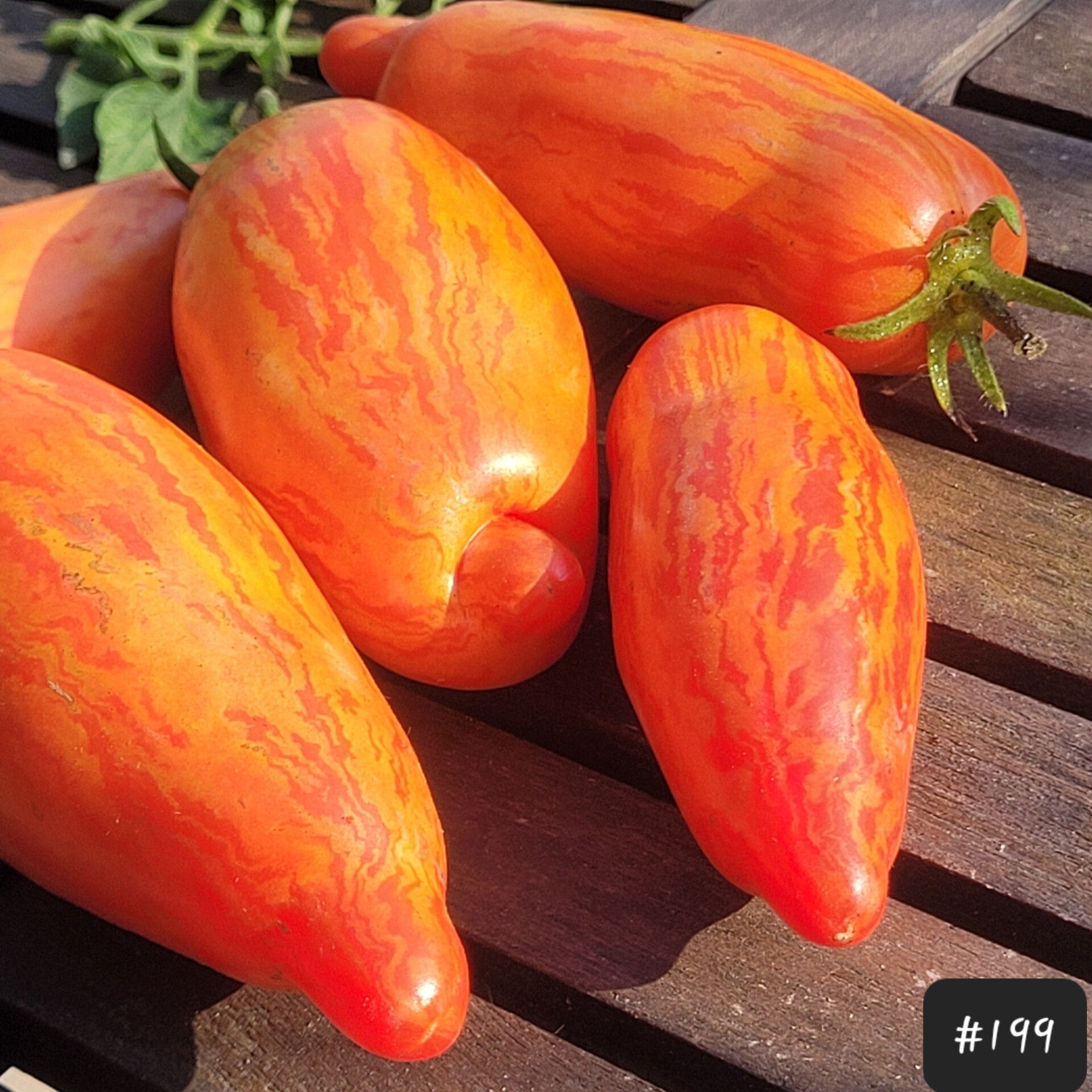 Eine wunderschöne Tomate mit einem hochkomplizierten Namen. Übersetzt bedeutet der Name so viel wie „Gestreifter Pfeffer“. Eine Art Roma-Tomate, rot mit gelben Streifen.