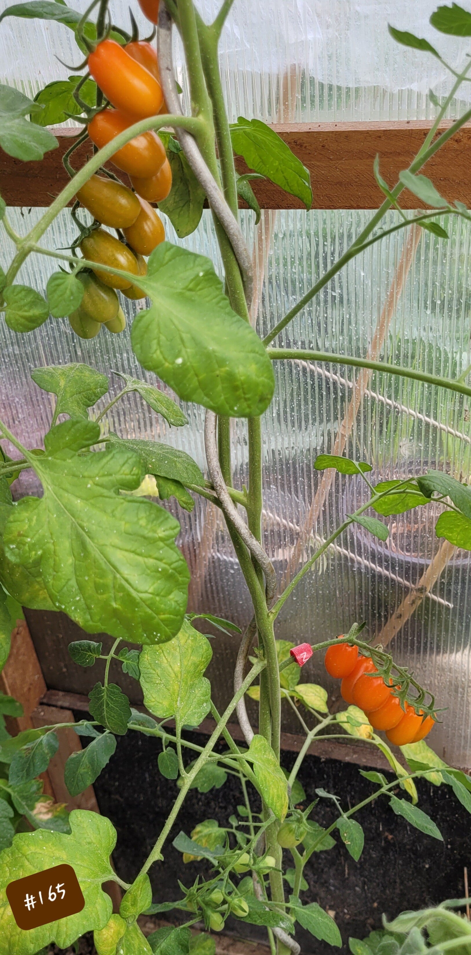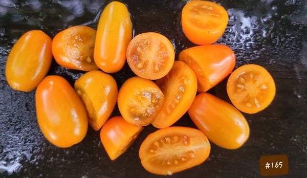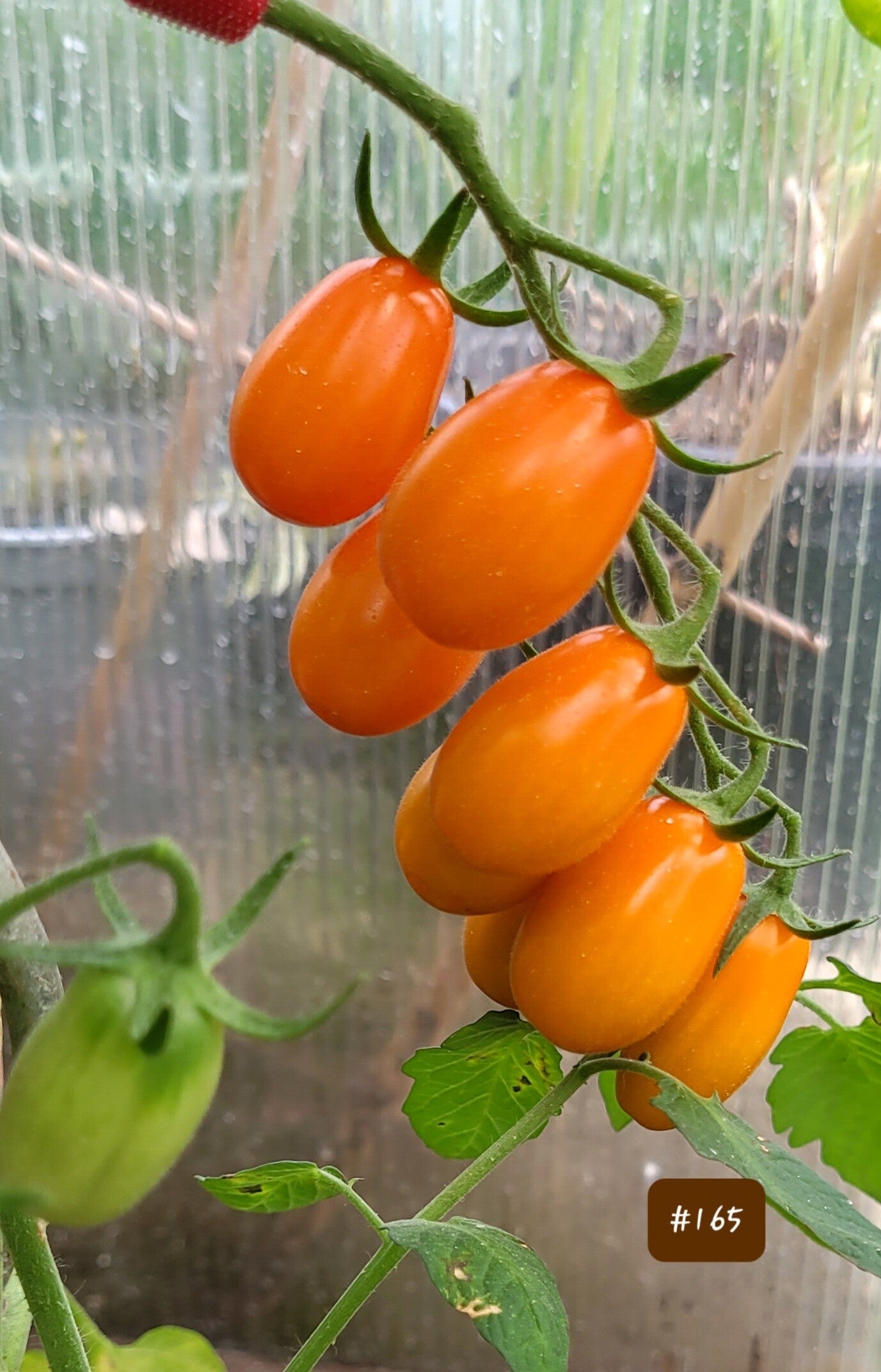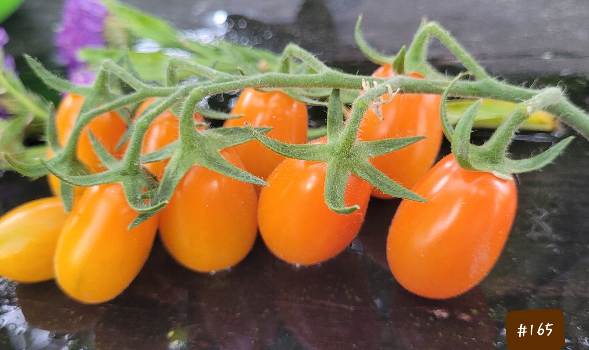 Eine orange Kirschtomate in Birnenform. Sie hat viele Rispen, an der sich die kleinen leichtenden Früchte aufreihen wie eine Lichterkette, sehr sehenswert. Man kann eine Rispe vollkommen ausreifen lassen und dann komplett ernten.