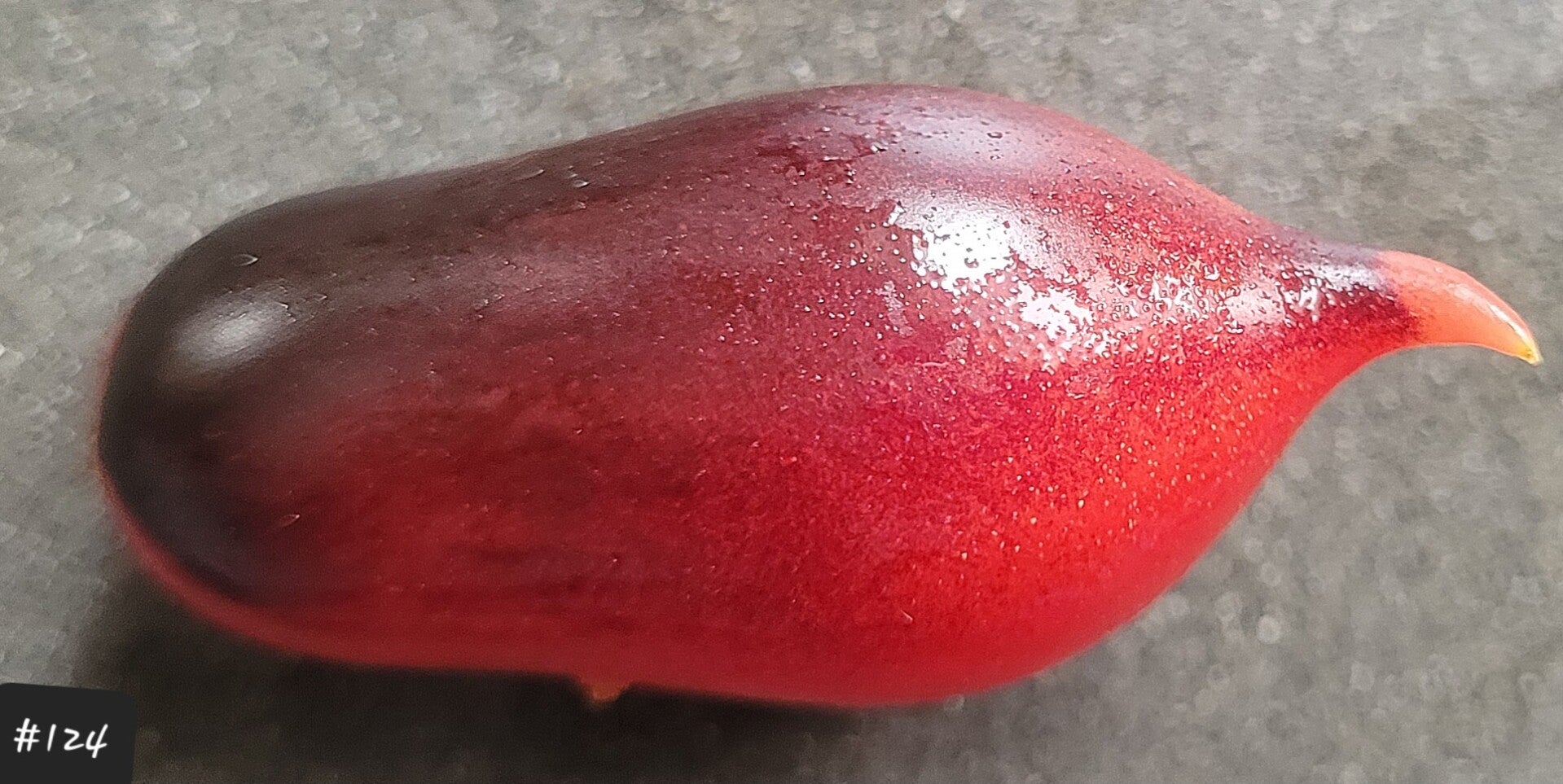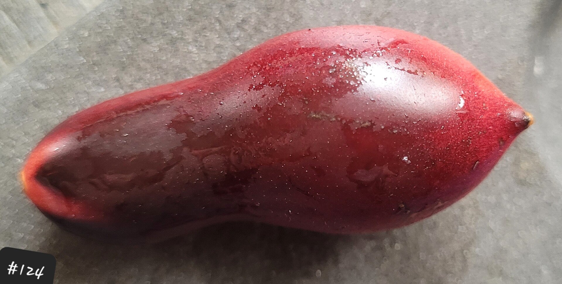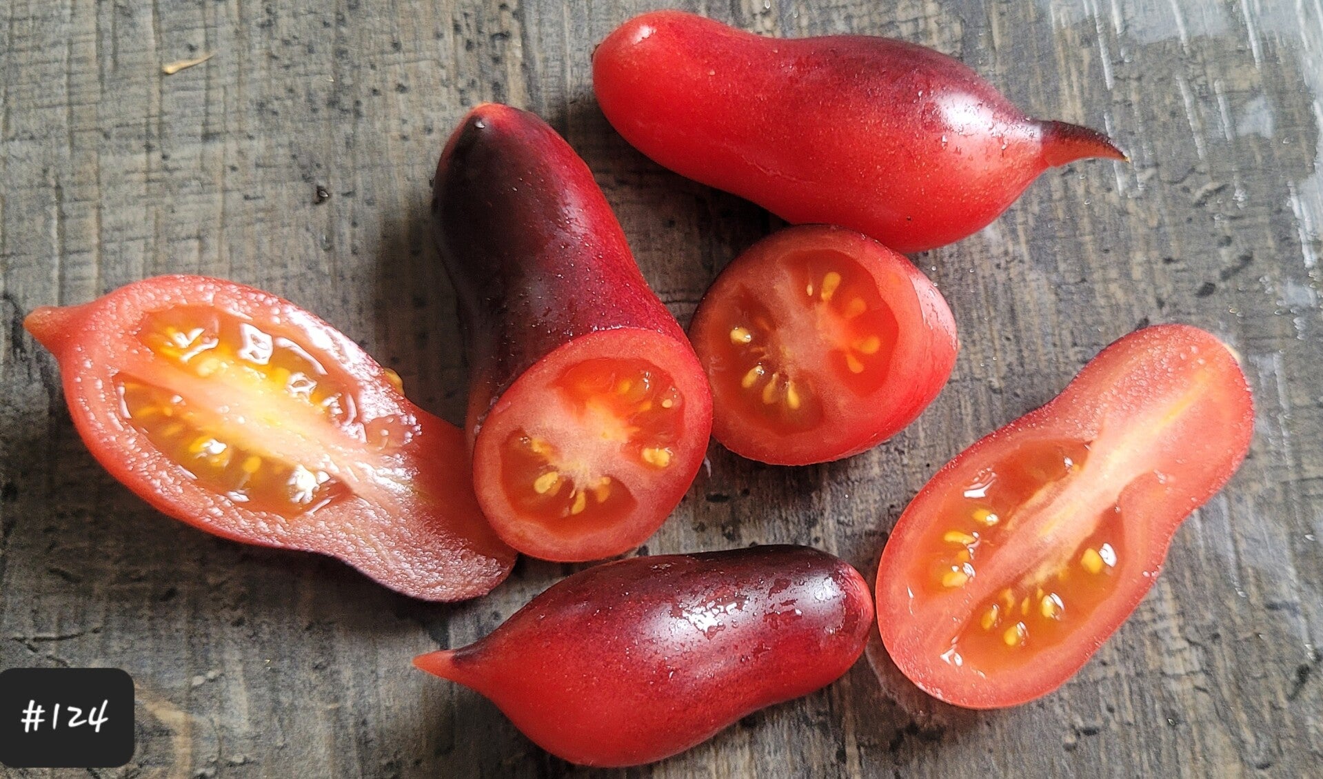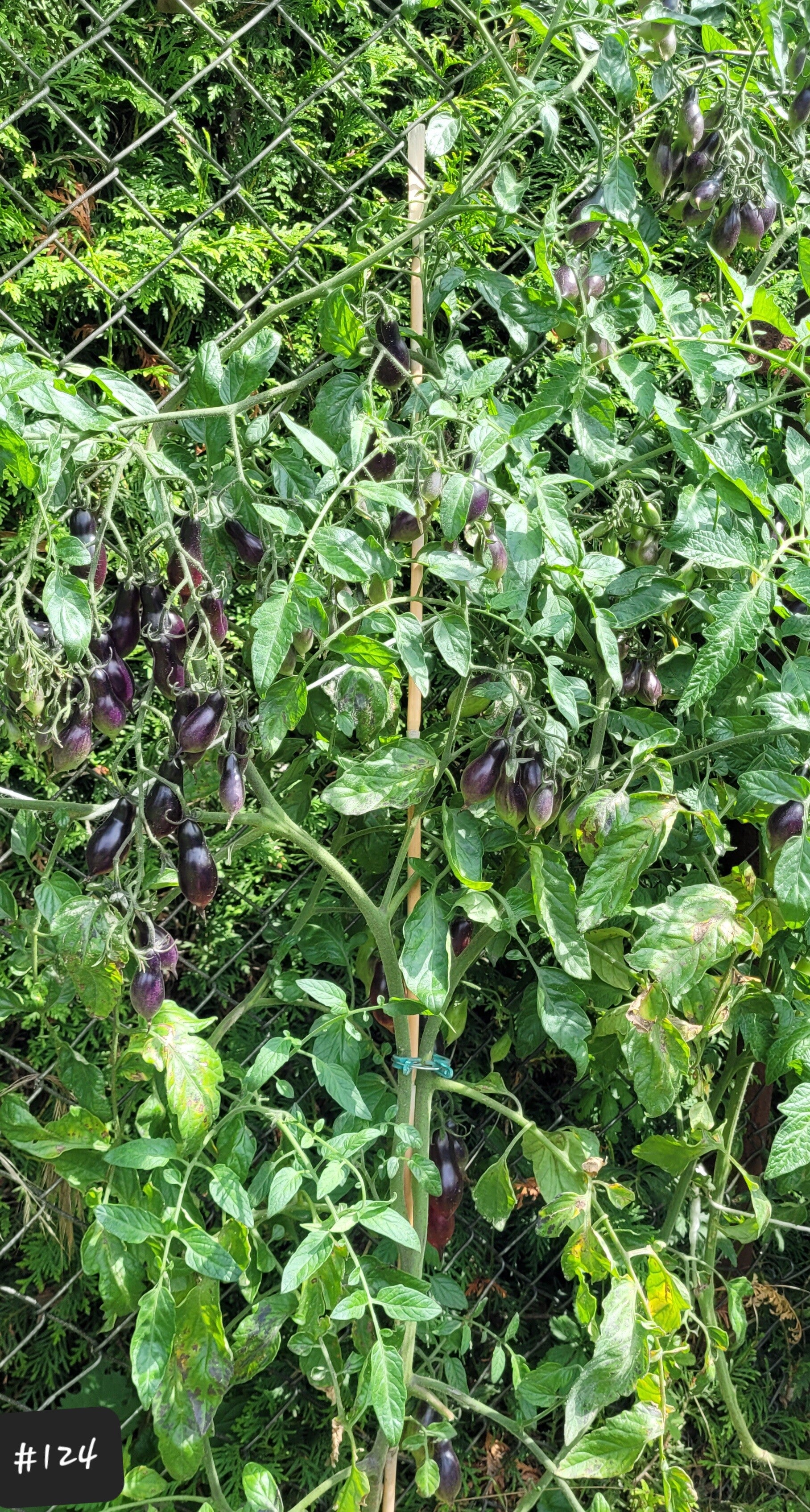 Die wunderschönen Früchte sehen aus wie mini Marzano-Tomaten mit einer dunklen Anthohaube und einer kleinen Spitze. Die Pflanze ist enorm wüchsig, sie muss nicht ausgegeizt werden, entwickelt viele Triebe mit unzähligen Rispen und Früchten. Das Laub ist eher zart. Dadurch kann viel direktes Sonnenlicht die Früchte anstrahlen und sie färben sich besonders dunkel.