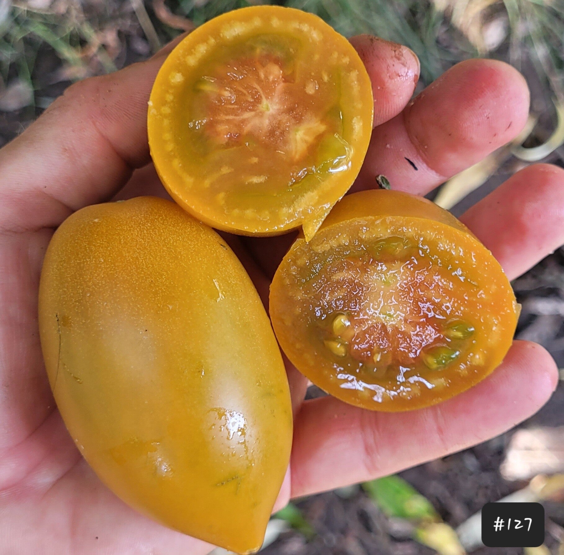 Die Früchte sind ungewöhnlich orange, zartrosa und olivgrün, marmoriert und pastös. Sie schmecken spektakulär tropisch. Wirklich einzigartig. Eine kompakte, aber produktive Pflanze mit wunderschönen Rispen.