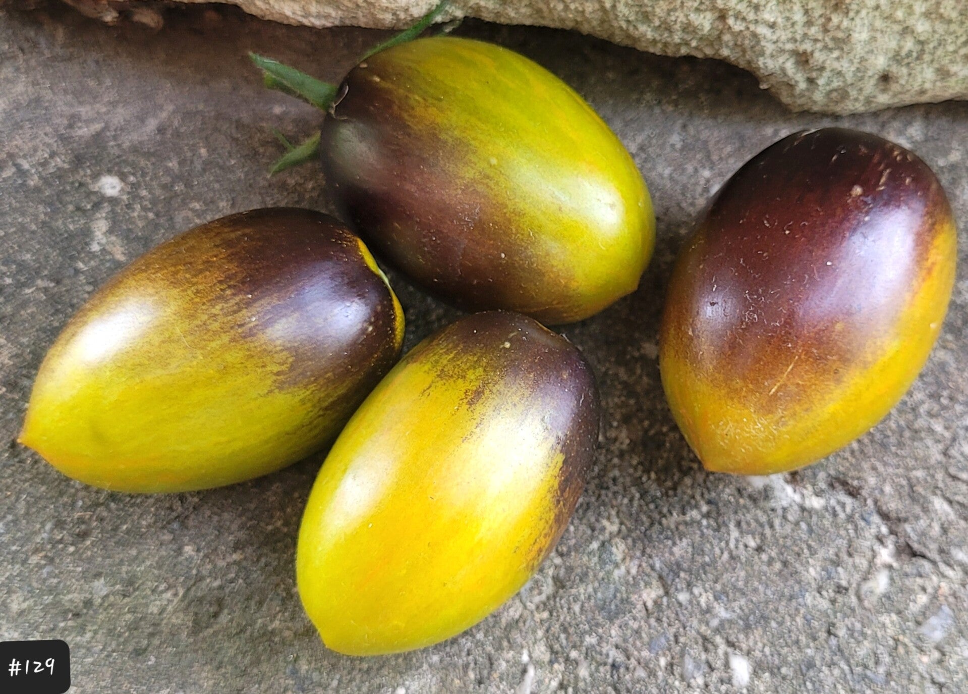 Die glänzenden länglichen Früchte haben ein großes Farbspektrum zu bieten: gelb-oliv mit leichen rote-orange-violette Streifen. Die Schultern sind dunkel. Außerdem haben sie ein festes Fruchtfleisch und einen sehr fruchtig-süßen Geschmack mit feiner Säure. Die Pflanze kann mehrtriebig gezogen werden und ist prima für Kübelbepflanzung geeignet.