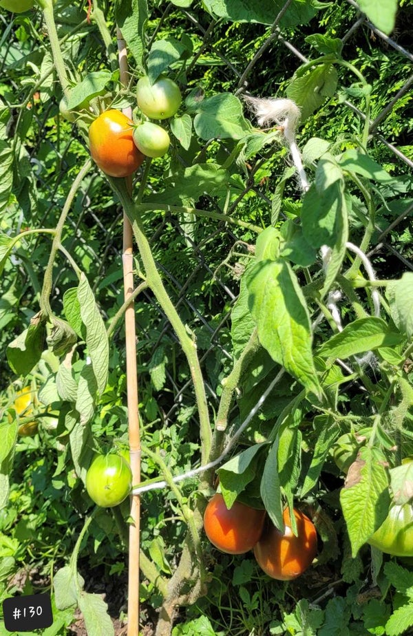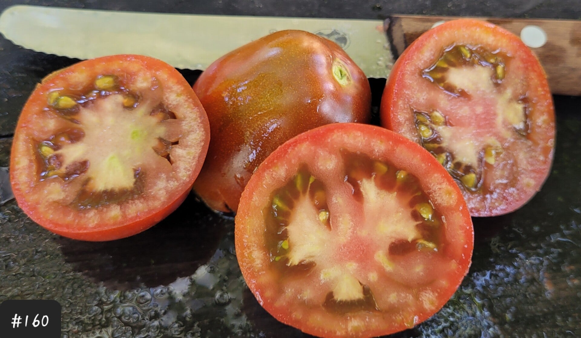 Eine beutelförmige Frucht, die schön glänzend dunkelbraun aussieht und teilweise grünliche Schultern hat. Das Fruchtfleisch ist dunkelrot, schnittfest und hat ein mildes und süßes Aroma. Diese Sorte ist sehr robust, kommt auch mit schlechtem Wetter gut zurecht.