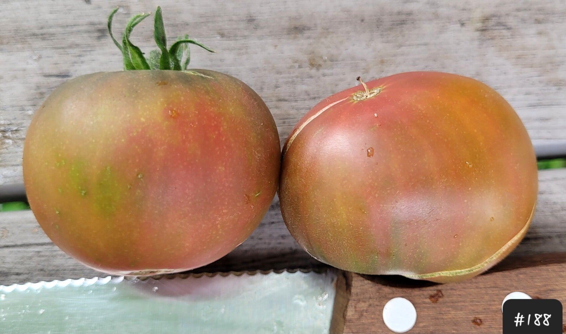 Eine große mehrfarbige Fleischtomate, die unglaublich lecker schmeckt. Sie ist saftig, hat wenig Kerne und Gallerte und schmeckt fruchtig würzig. Die Frucht ist olivfarben und bekommt bei der Reifung eine kastanienrote Marmorierung.