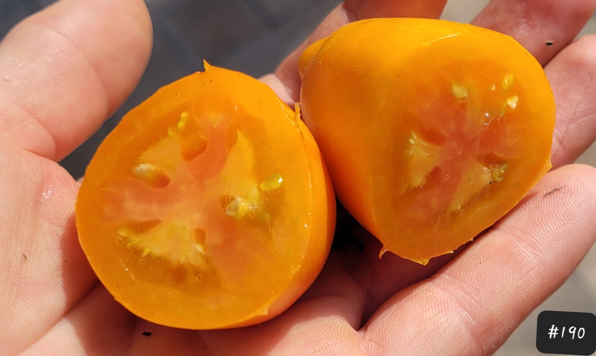 Eine Stabtomate, an der leuchtend orangene Roma-Tomaten wachsen. Richtig ausgereift können sie auch rötlicher werden. Diese haben eine feste Schale und recht festes Fleisch, daher sind sie gut lagerbar. Sie schmecken eher mild und haben nur wenig Säure.