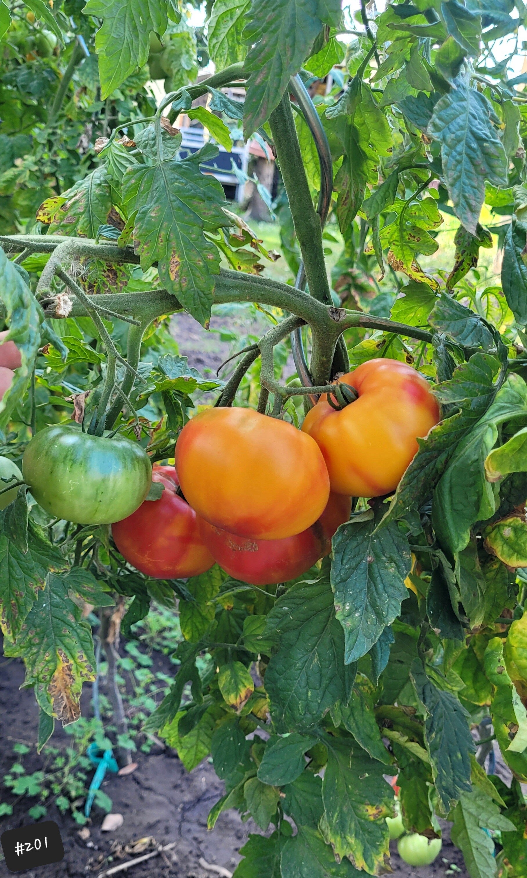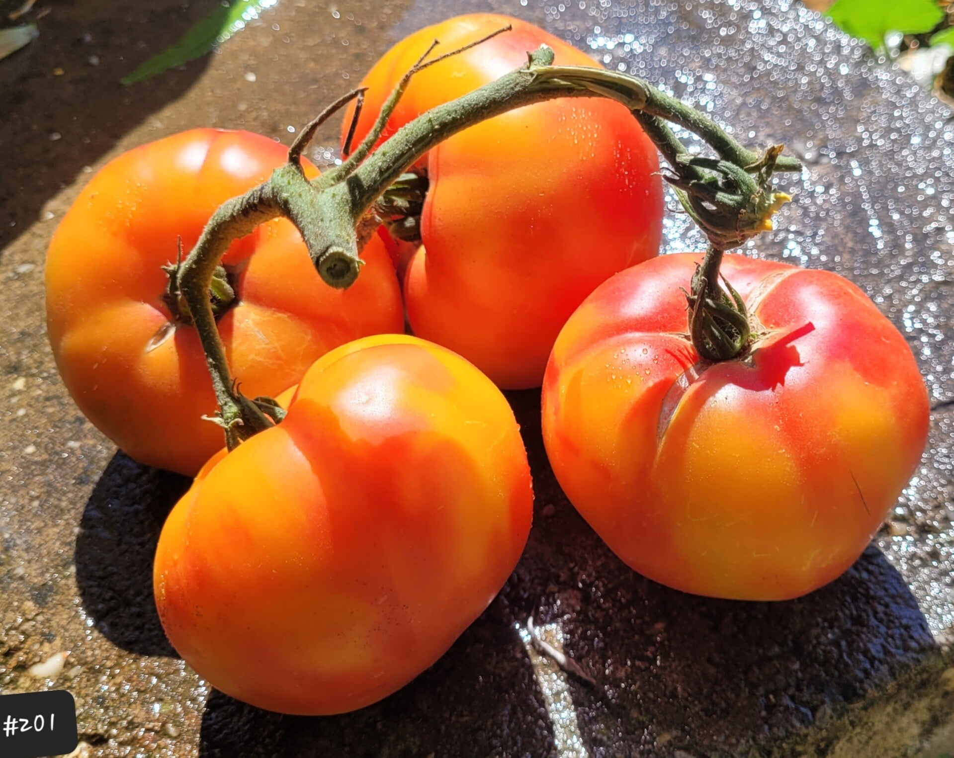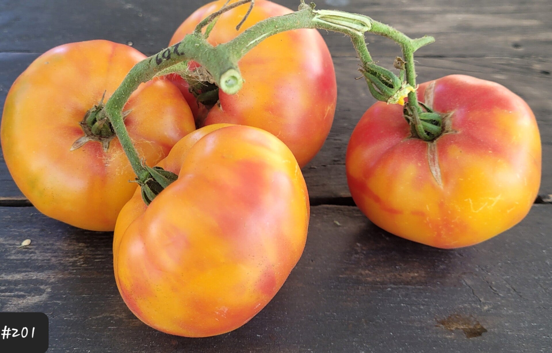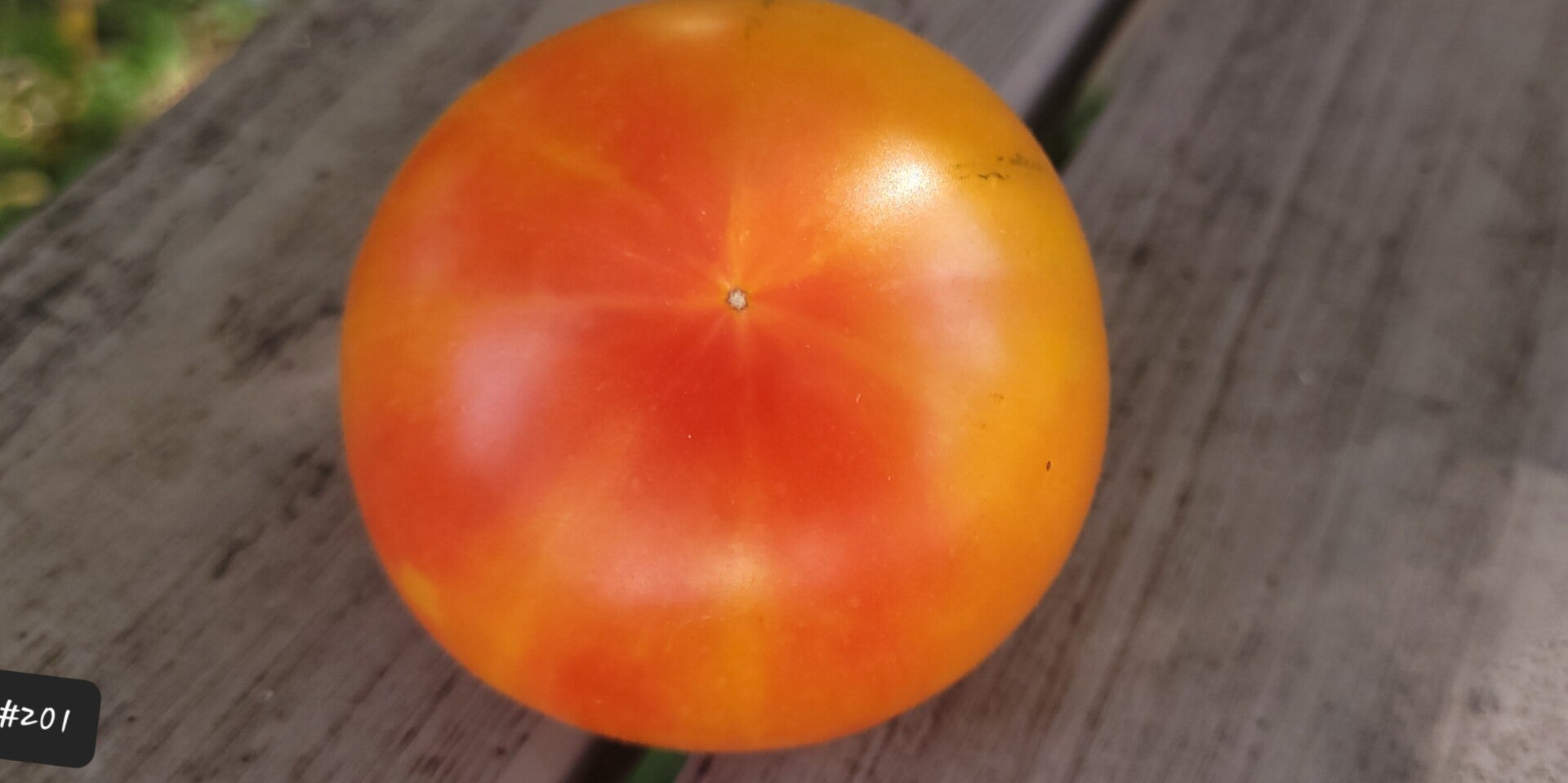 Diese Frucht sieht wirklich ungewöhnlich aus. Man könnte denken, sie will nicht richtig ausreifen, aber das muss so sein. Rot mit gelb-orangenen Flecken und Marmorierung. Die großen Fleischtomaten sind schön saftig und schmecken tropisch frisch und süß.