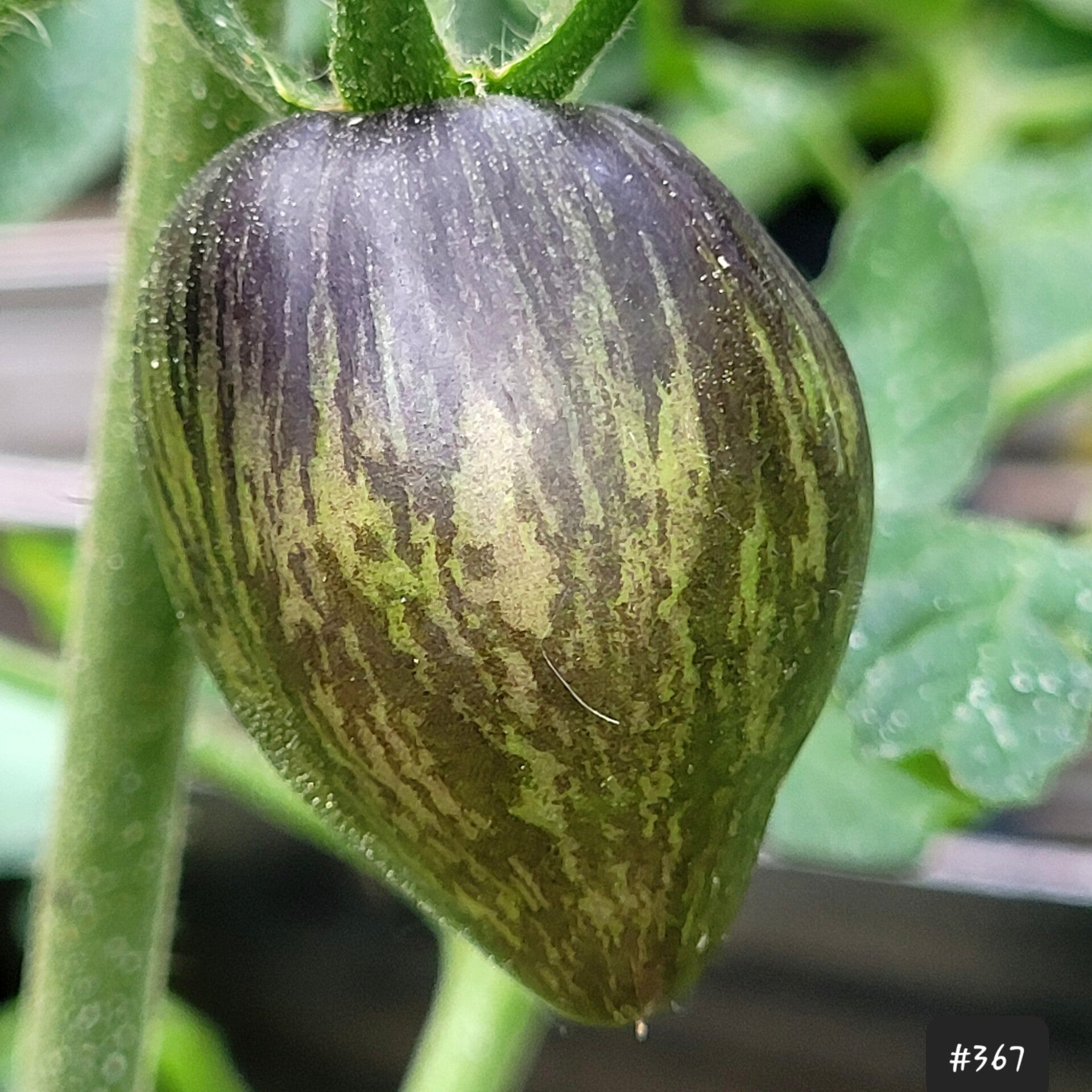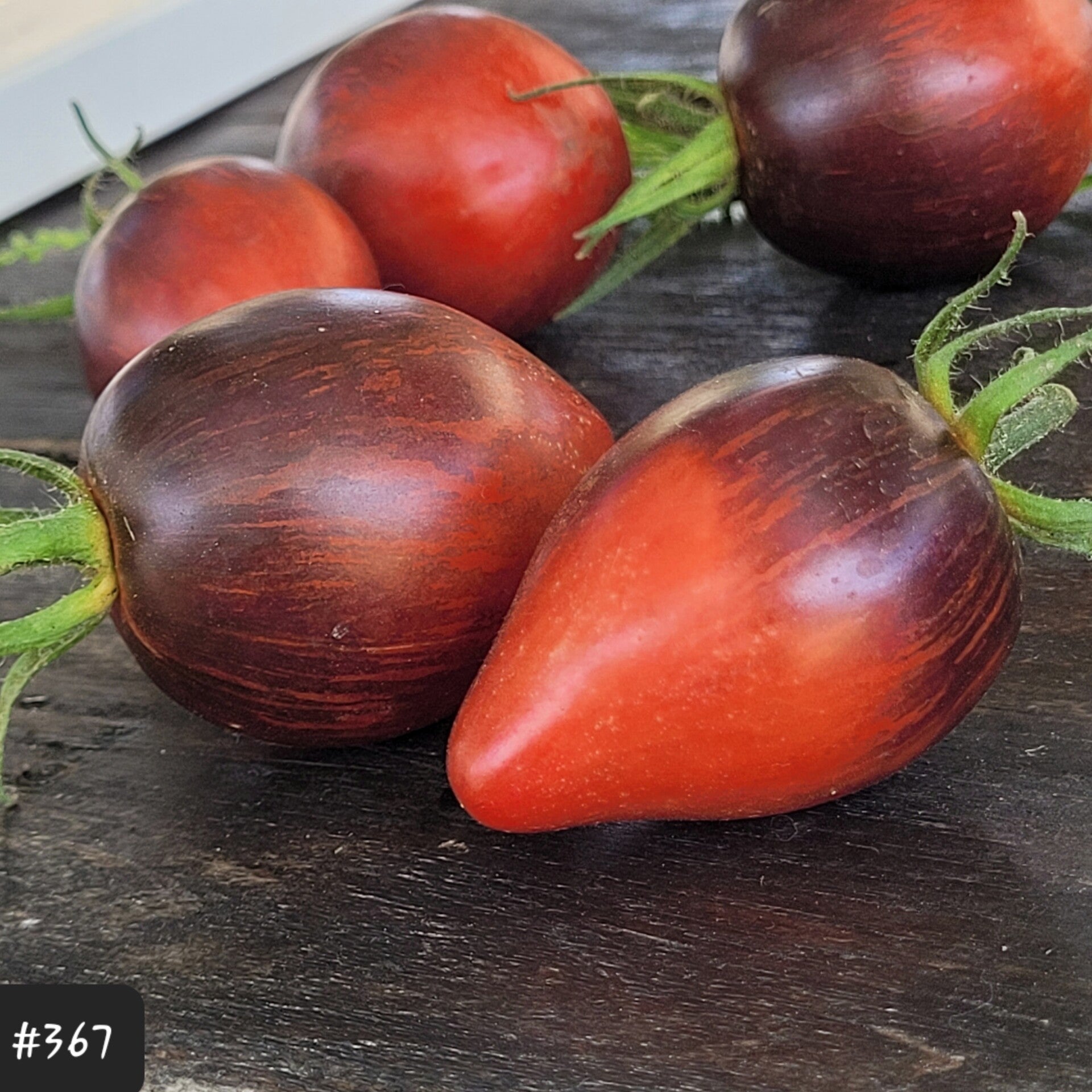 Eine neue Züchtung von Tatiana Nagle aus Lettland. Eine sehr dekorative Fleischtomate in Herzform, die durch einen hohen Anthocyan-Gehalt eine dunkle Schulter hat, welche in Streifen nach unten verlaufen.