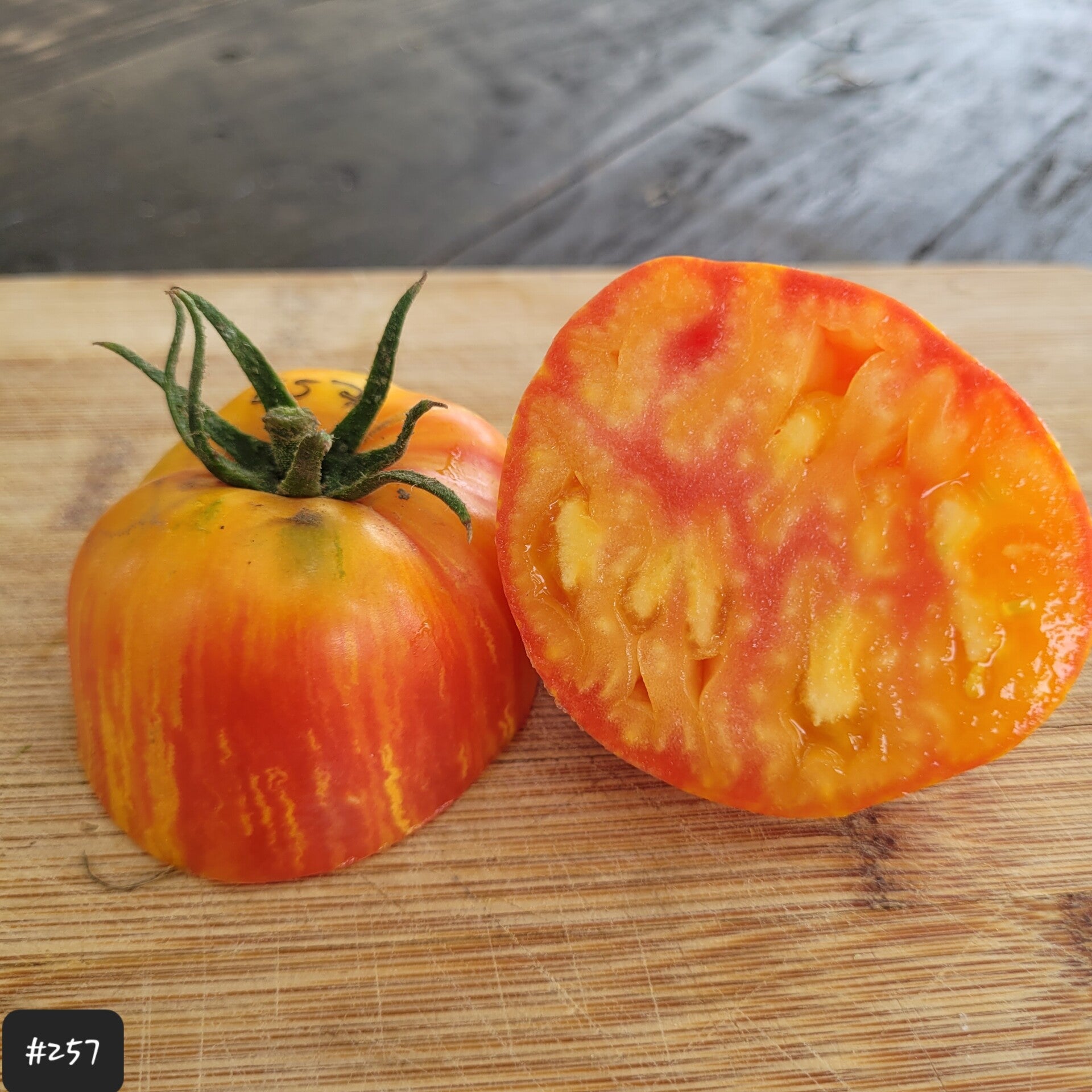 Eine hübsche Fleischtomate mit einer tollen Färbung. Nicht nur die Haut ist rot-gelb gestreift, auch das Fruchtfleisch ist mehrfarbig.