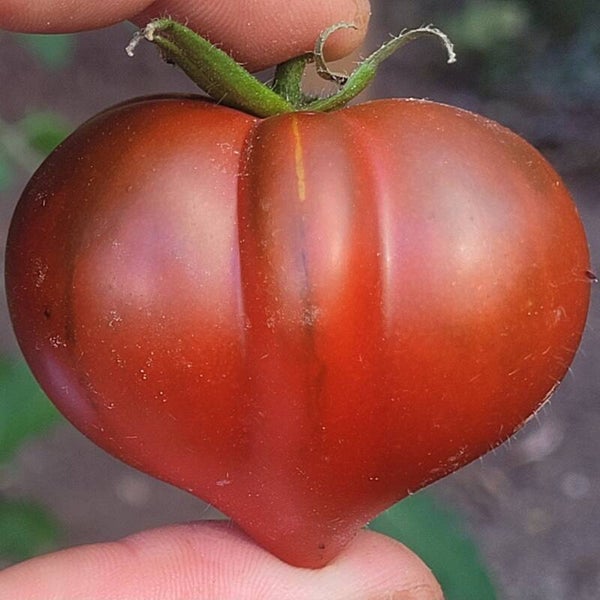 Diese herzförmige Fleischtomate ist ist dunkelrot bis braun und hat eine dunkelgrüne Schulter. Sie ist wunderschön geformt und dabei auch im Freiland platzfest mit einer festen Schale. Das dunkelrote Fruchtfleisch hat einen lila Schimmer und ist weich und saftig.