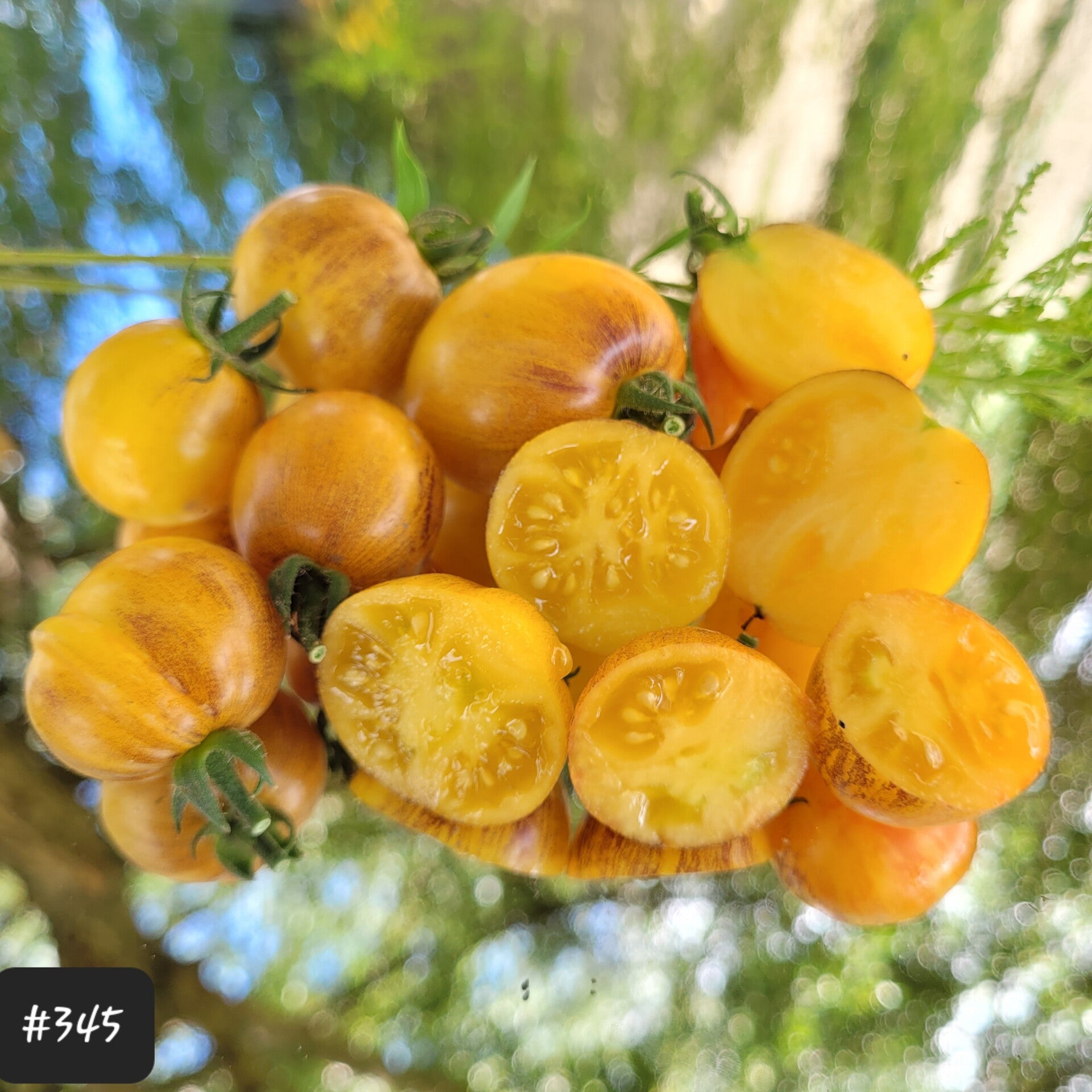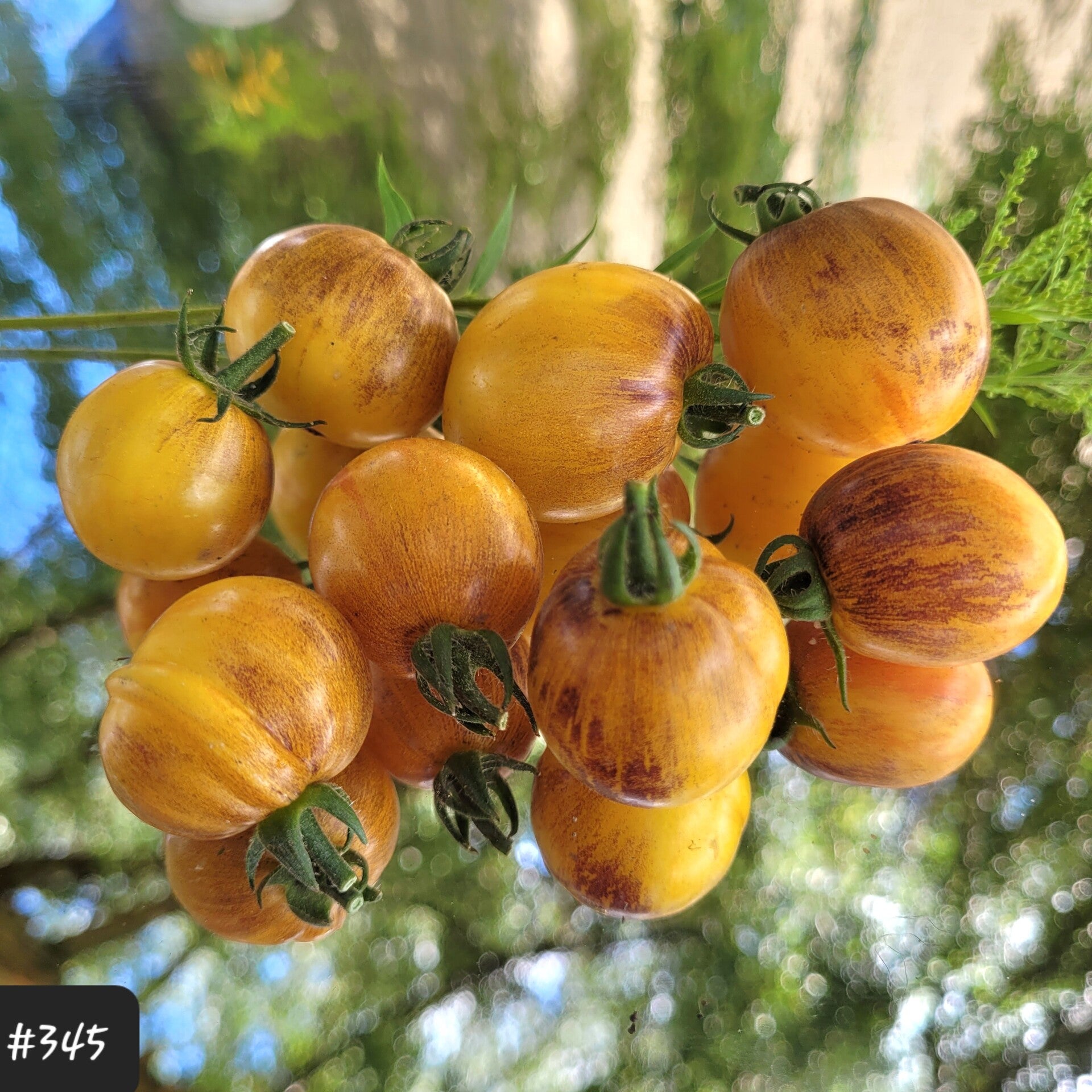 Diese Zwerg-Buschtomate trägt sehenswerte außergewöhnliche kleine Früchte. Die Tomaten sind gelb und haben eine dunkle Schulter, die in Streifen von oben nach unten verlaufen. Bei Vollreife bekommen sie am Boden einen rot-rosa Schimmer. Sie sind gerippt und oval, bzw. beutelförmig.