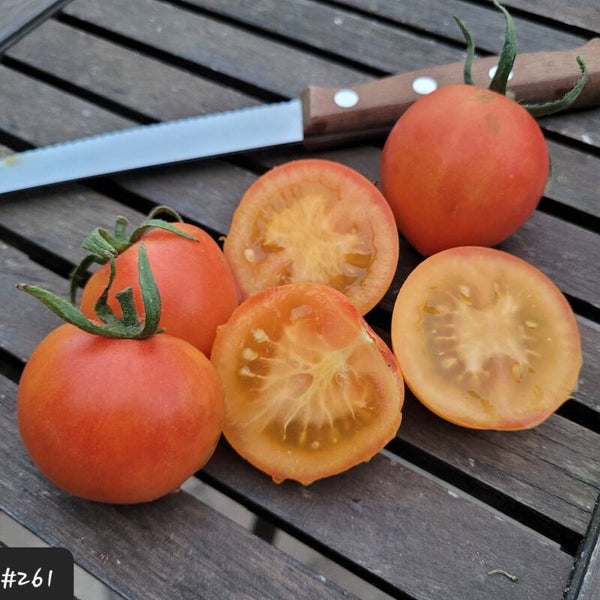 Eine Salattomate mit dem Look einer Ananastomate. Sie ist gelb-orange marmoriert, hat helles oragenes Fruchtfleisch und wiegt um die 50g.