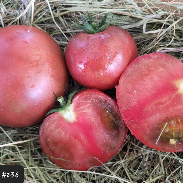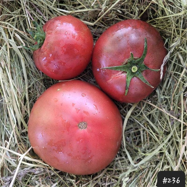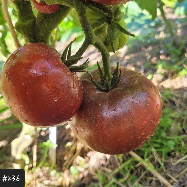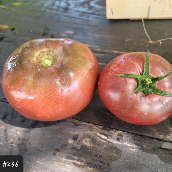 Eine große Fleischtomate mit einer weinroten Farbe und einer dunklren Färbung auf der Schulter. Die Tomaten sind flachrund und manchmal leicht gerippt.