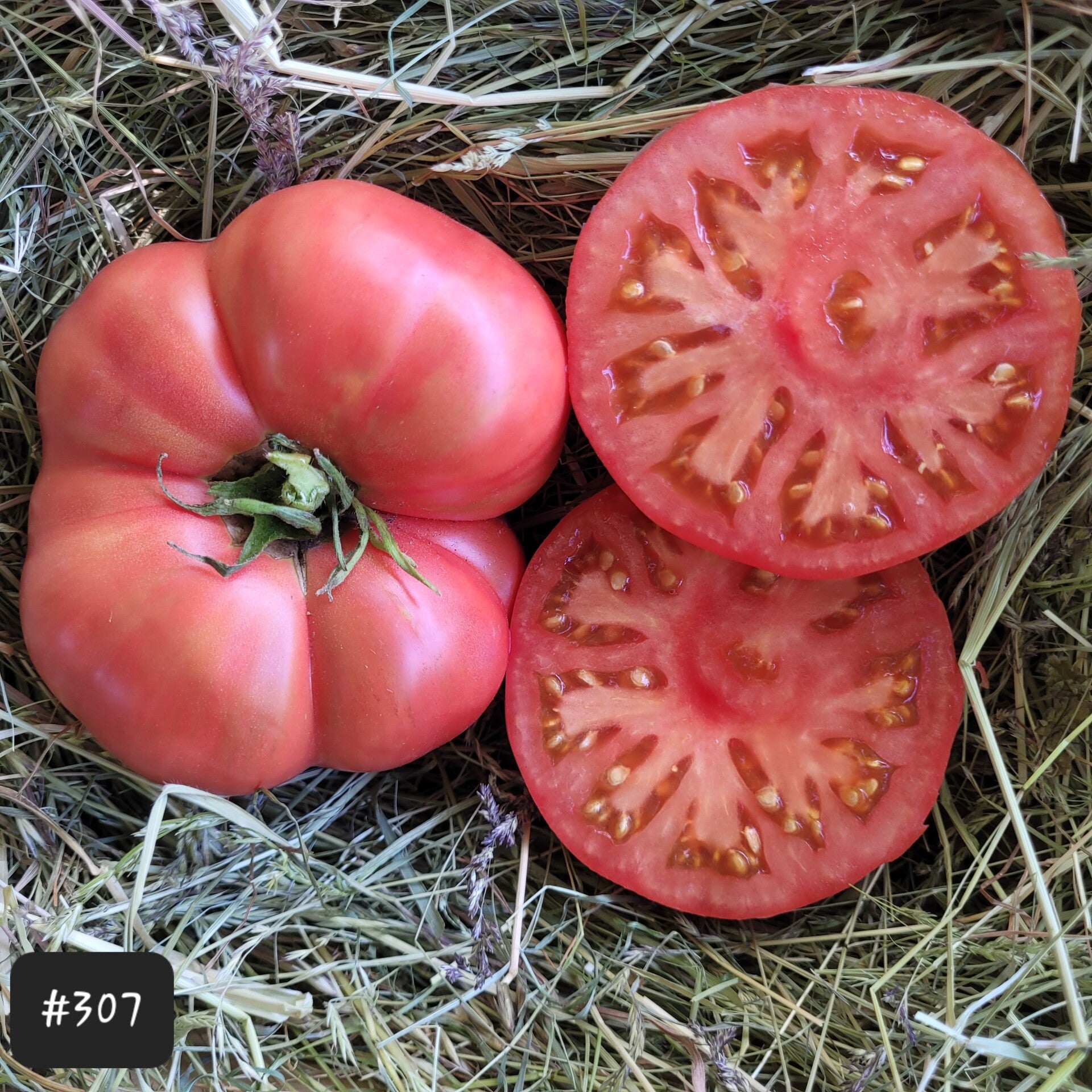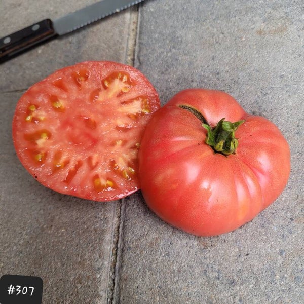 Eine große rosa rötliche Fleischtomate. Die Tomaten sind festfleischig und trotzdem saftig. Sie sind schnittfest und neigen auch nicht zum Aufplatzen. Sie sind rund, abgeflacht und leicht gerippt