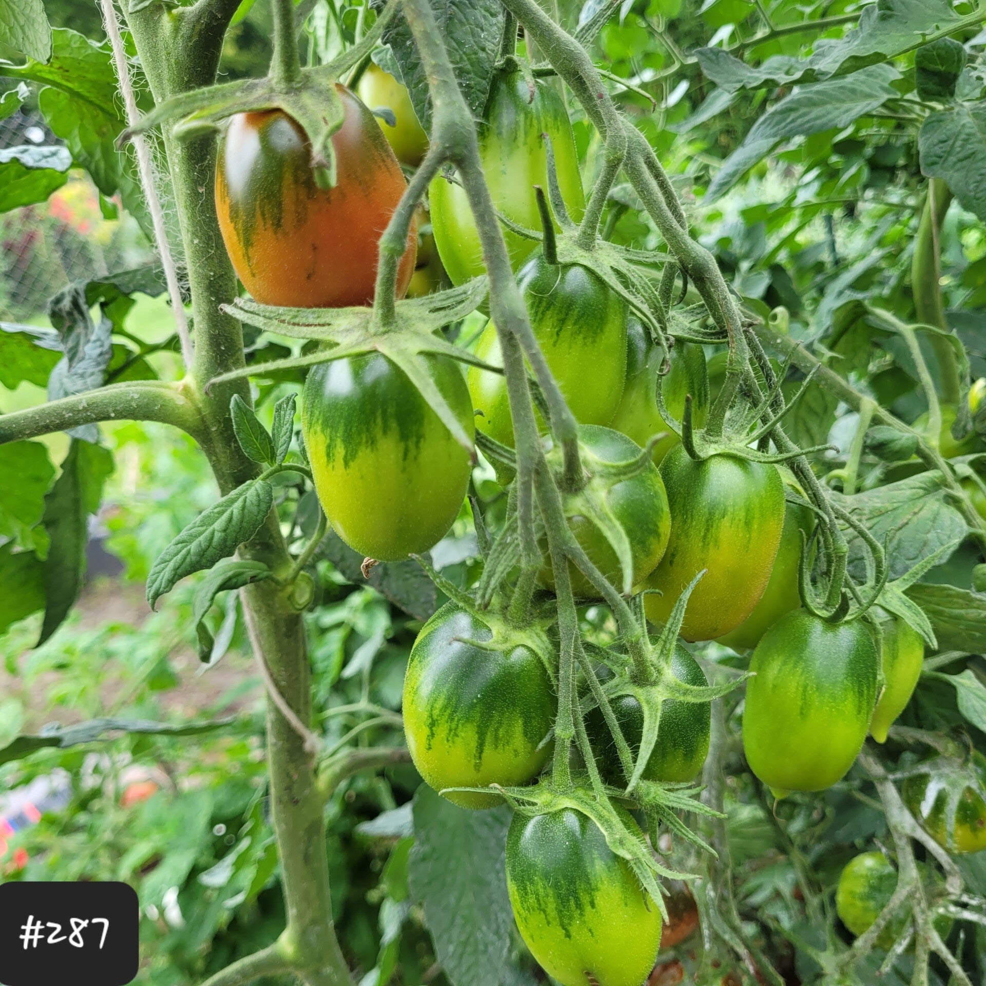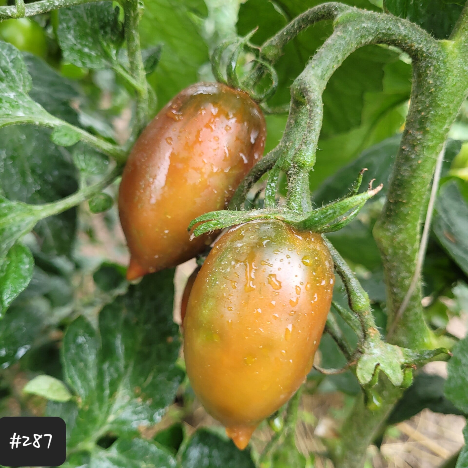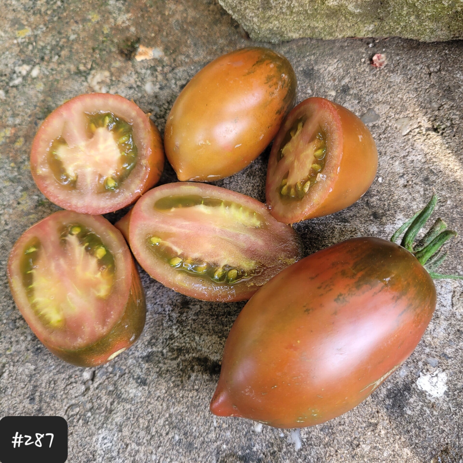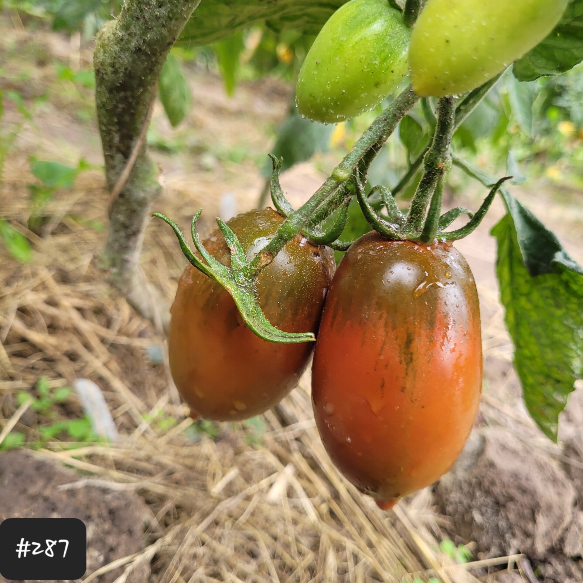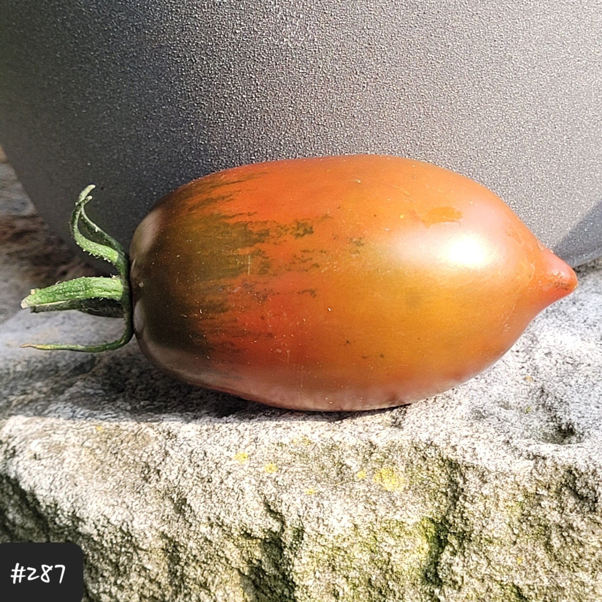 Eine leckere dunkle Fleischtomate in Zapfenform mit einer kleinen Spitze. Die fleischigen rotbraunen Früchte wiegen bis zu 100g, sie sind saftig und schmecken aromatisch mit einer guten Portion Säure. Die Früchte sind platzfest. Sie wachsen an einer sehr wüchsigen starken hohen Pflanze mit robustem Tomatenlaub.