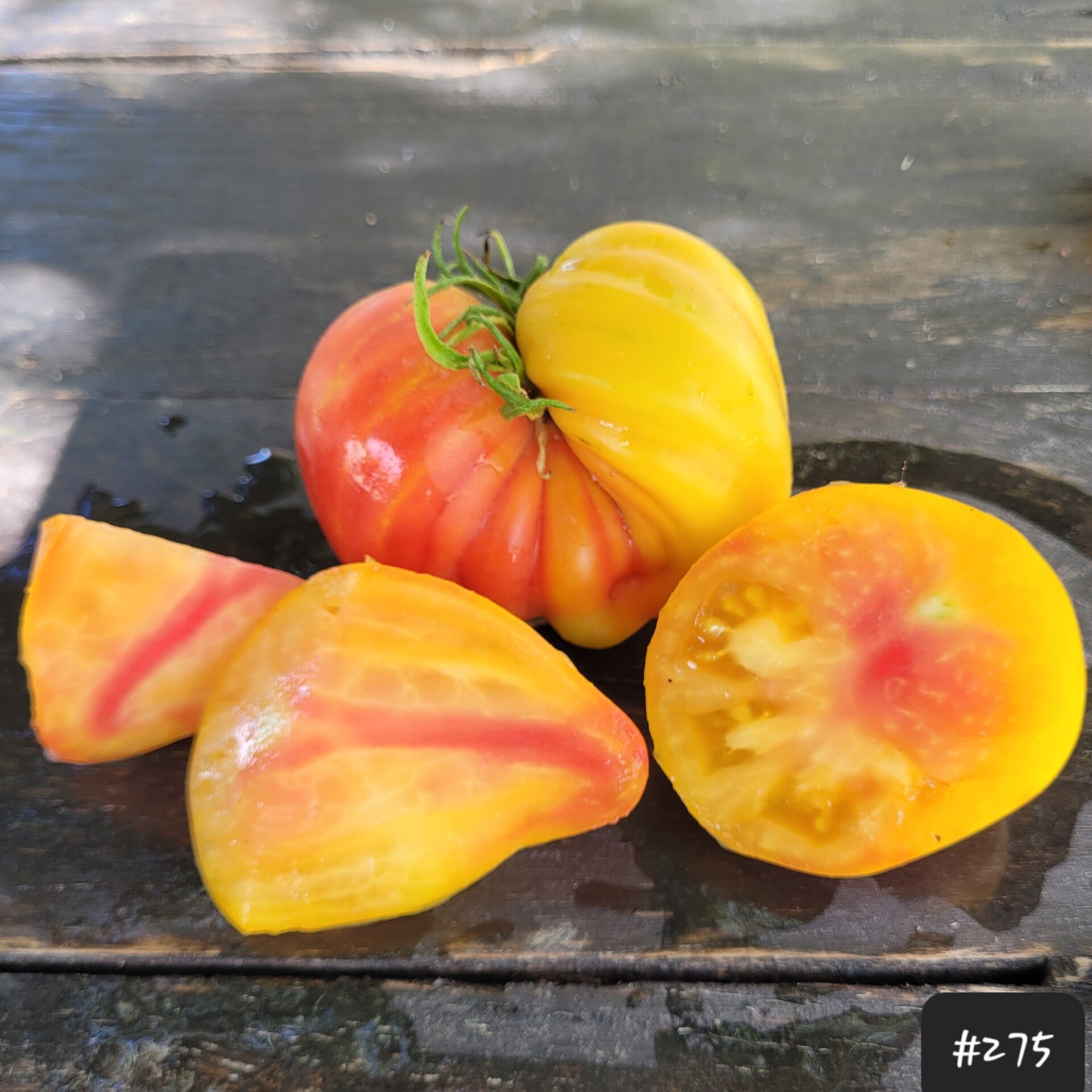 Die Kozula 156 von der Züchterin Anna Jankowski ist eine wunderschöne herzförmige Fleischtomate mit einer tollen Färbung. Manche Früchte sind gelb mit einer zarten rosa-Durchfärbung im Innere, manche sind stärker mit rot durchzogen.