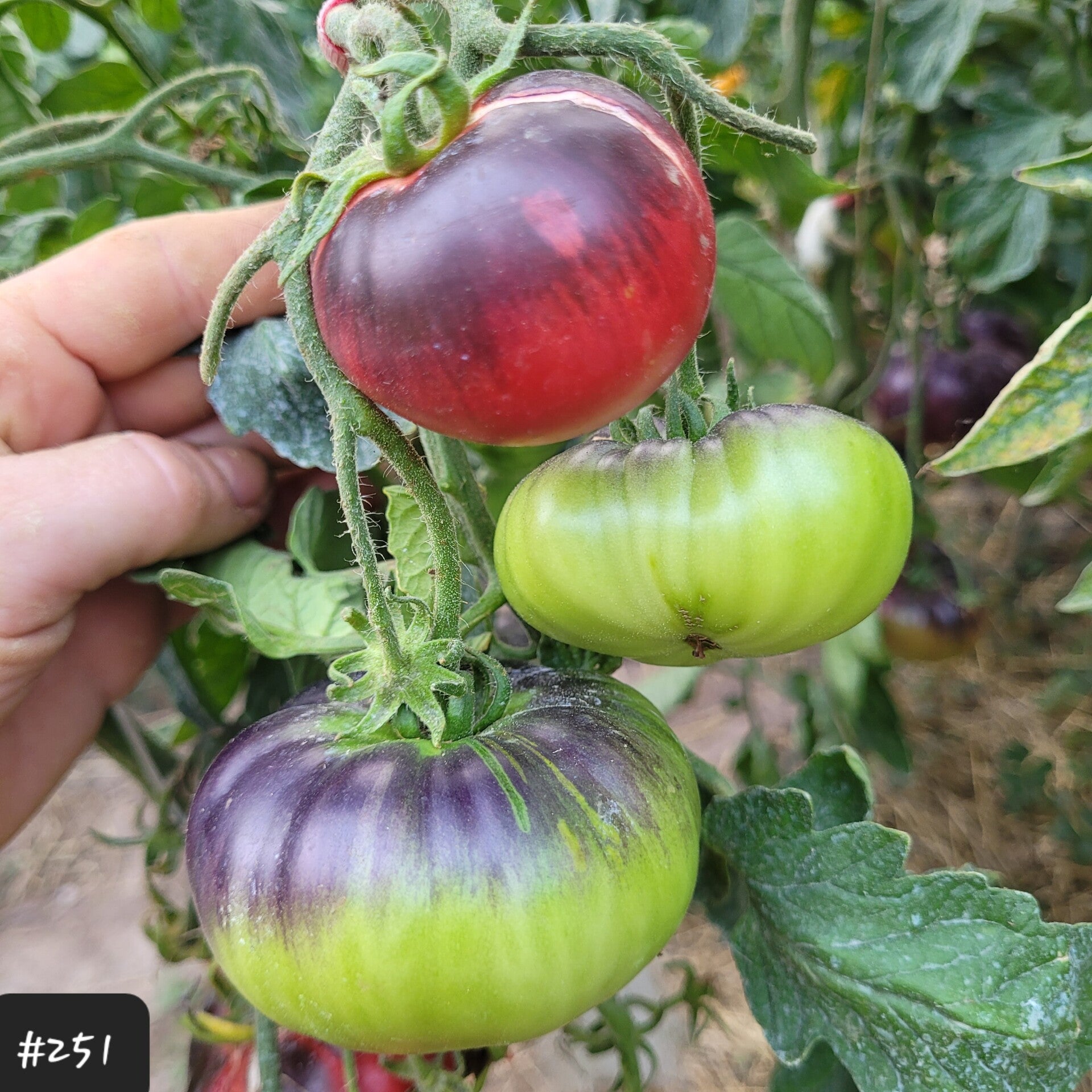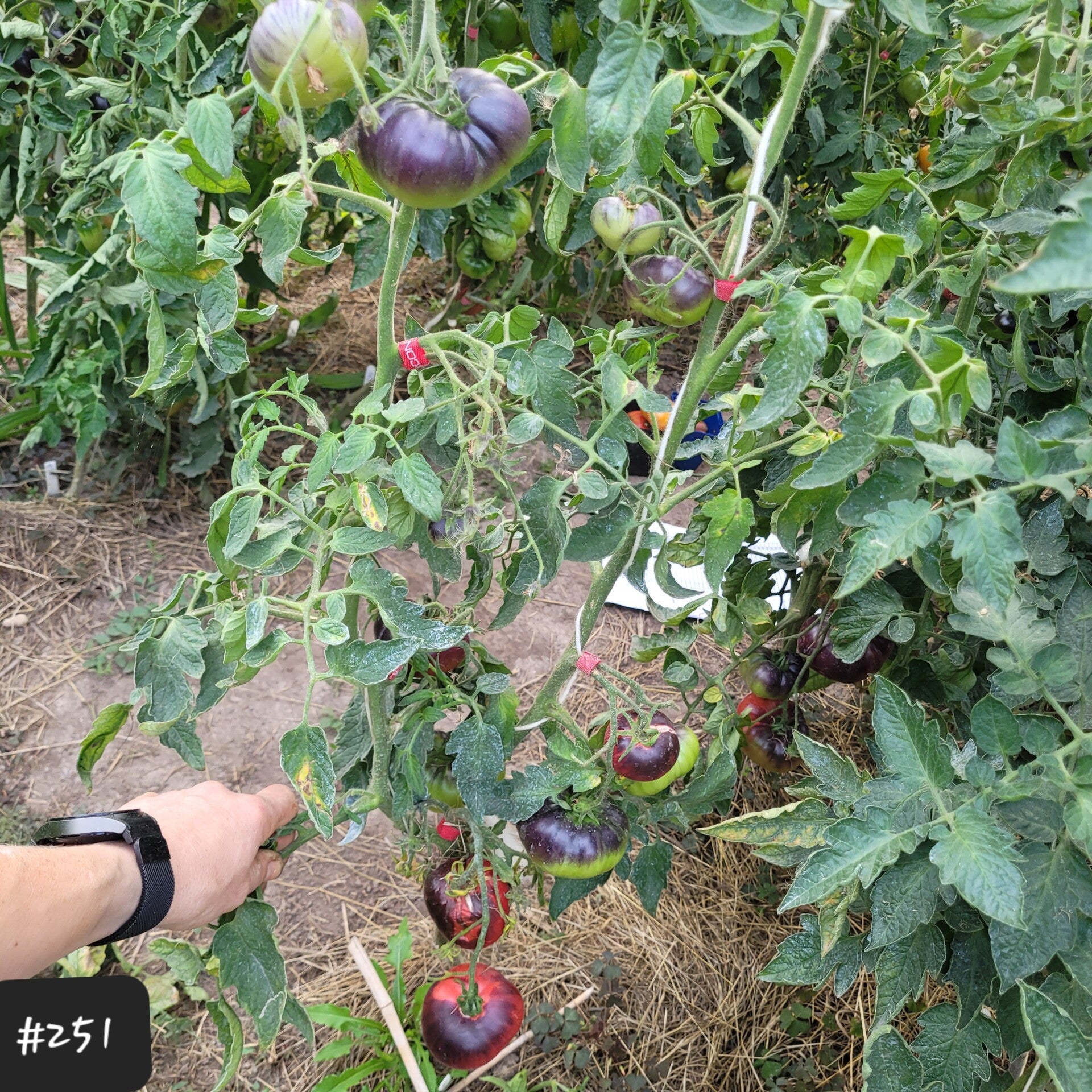Die "blaue Schöne" ist eine Fleischtomate, flachrund und mit einer schönen Anthocyan-Schulter. Diese ist dunkellila-bläulich und um so ausgeprägter, um so mehr direkte Sonne die Tomaten abbekommen.
