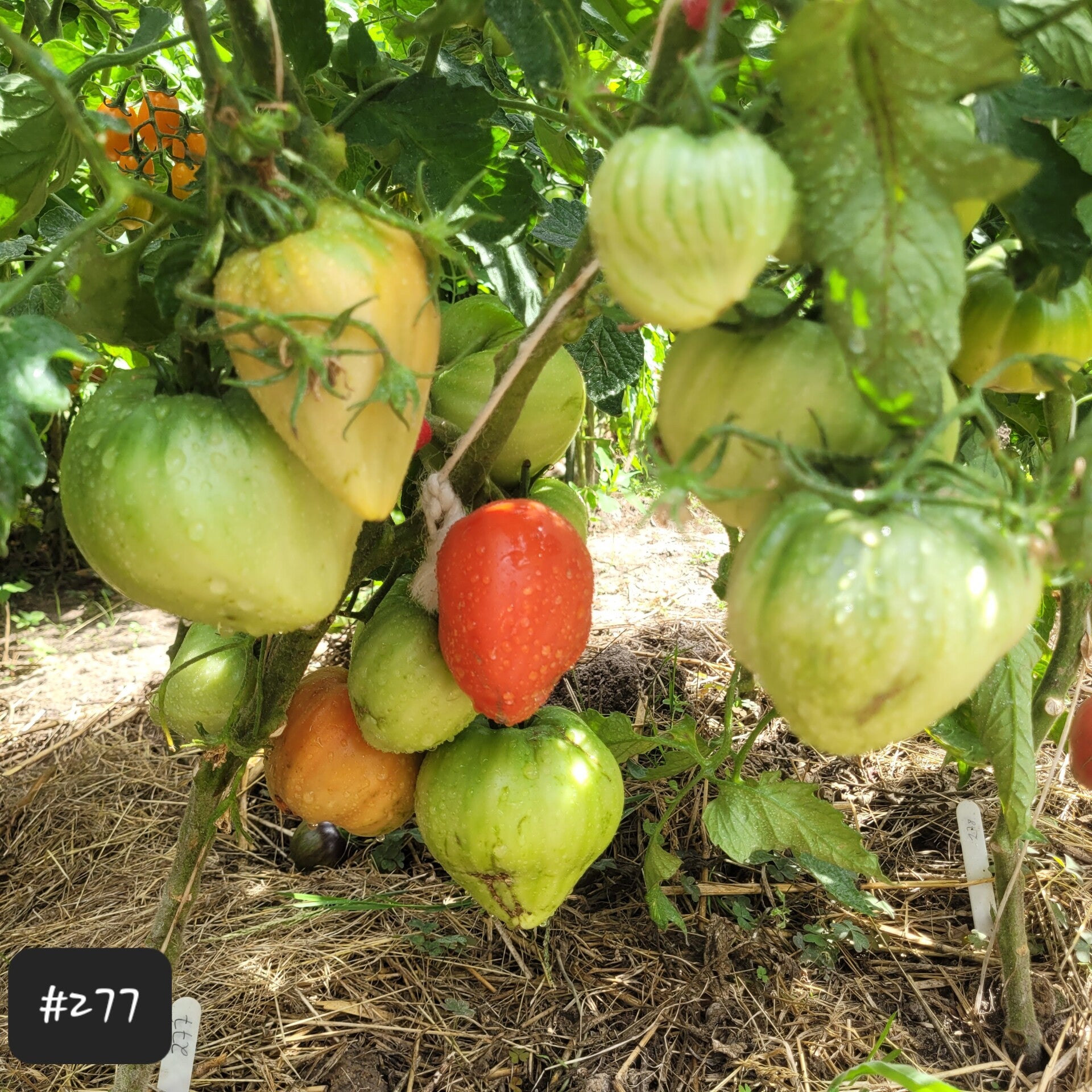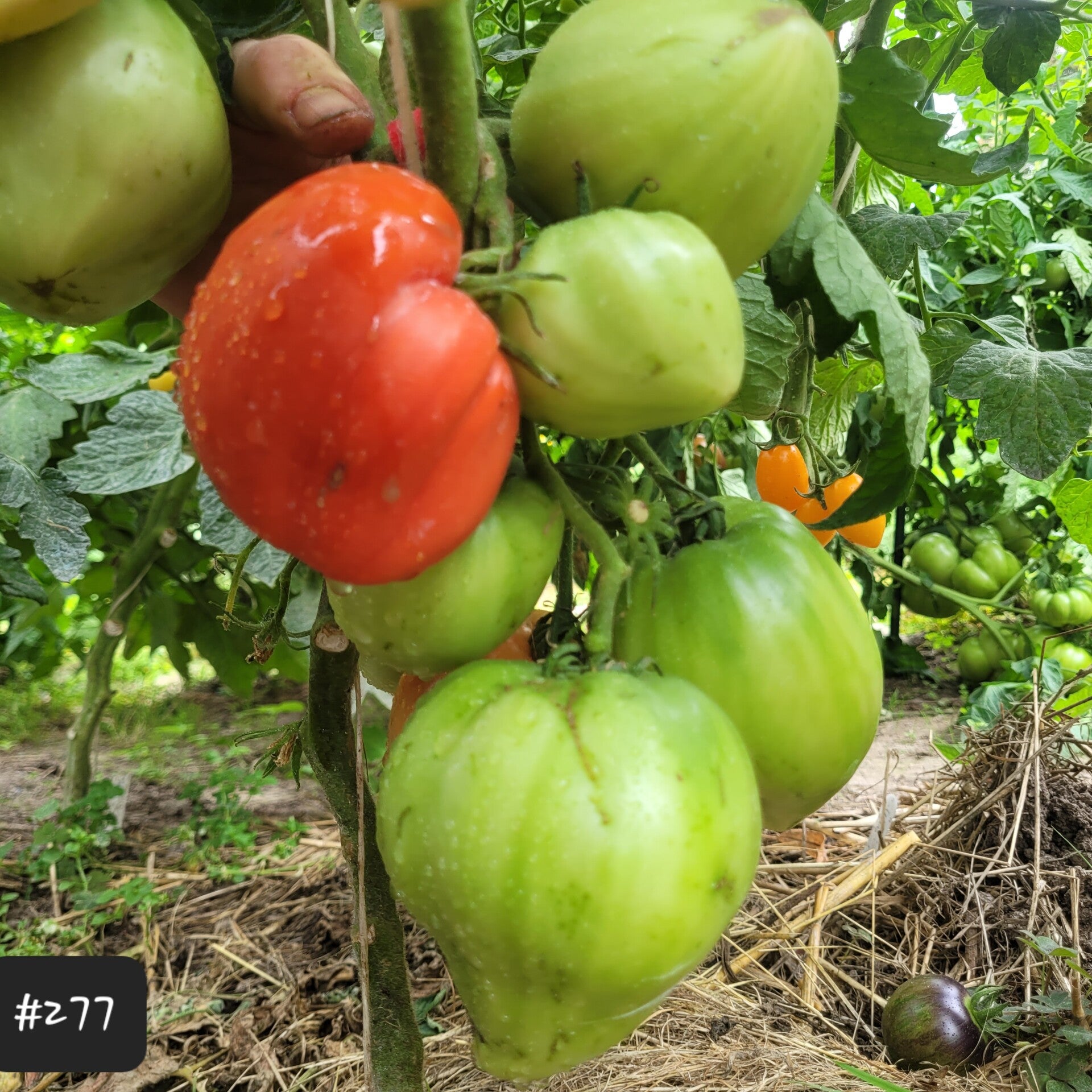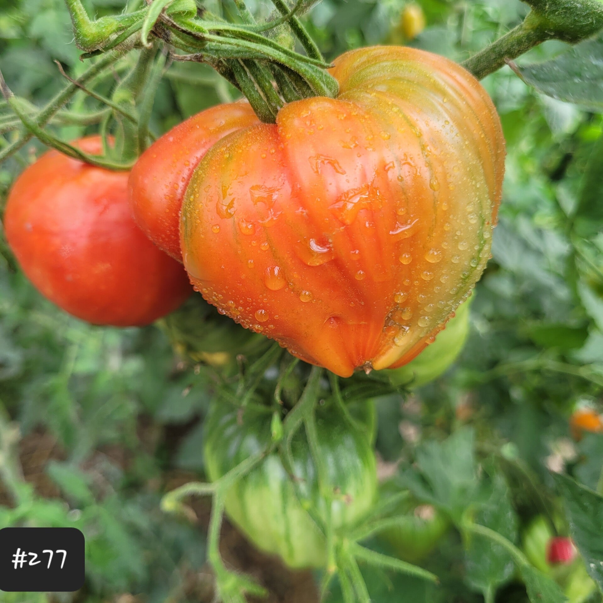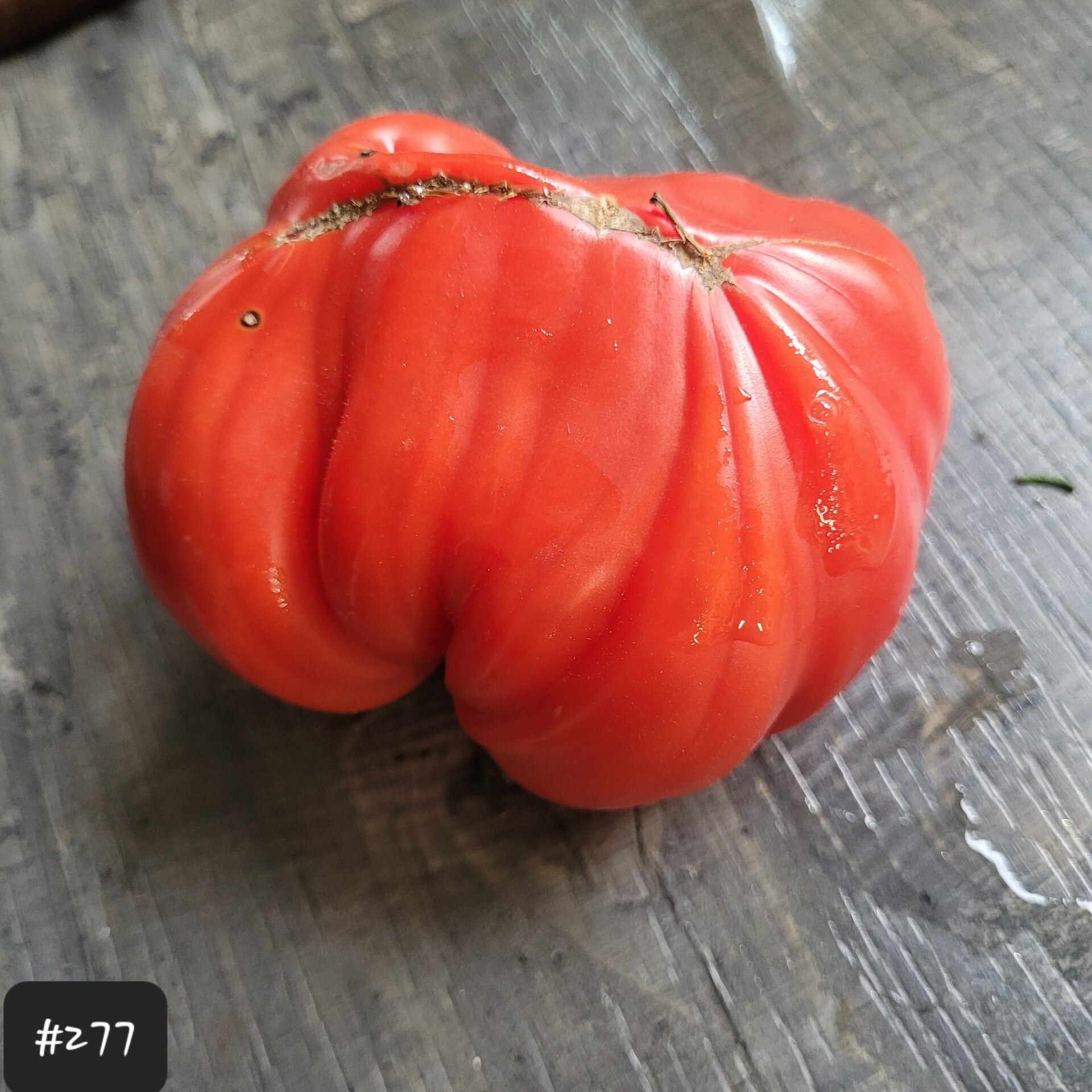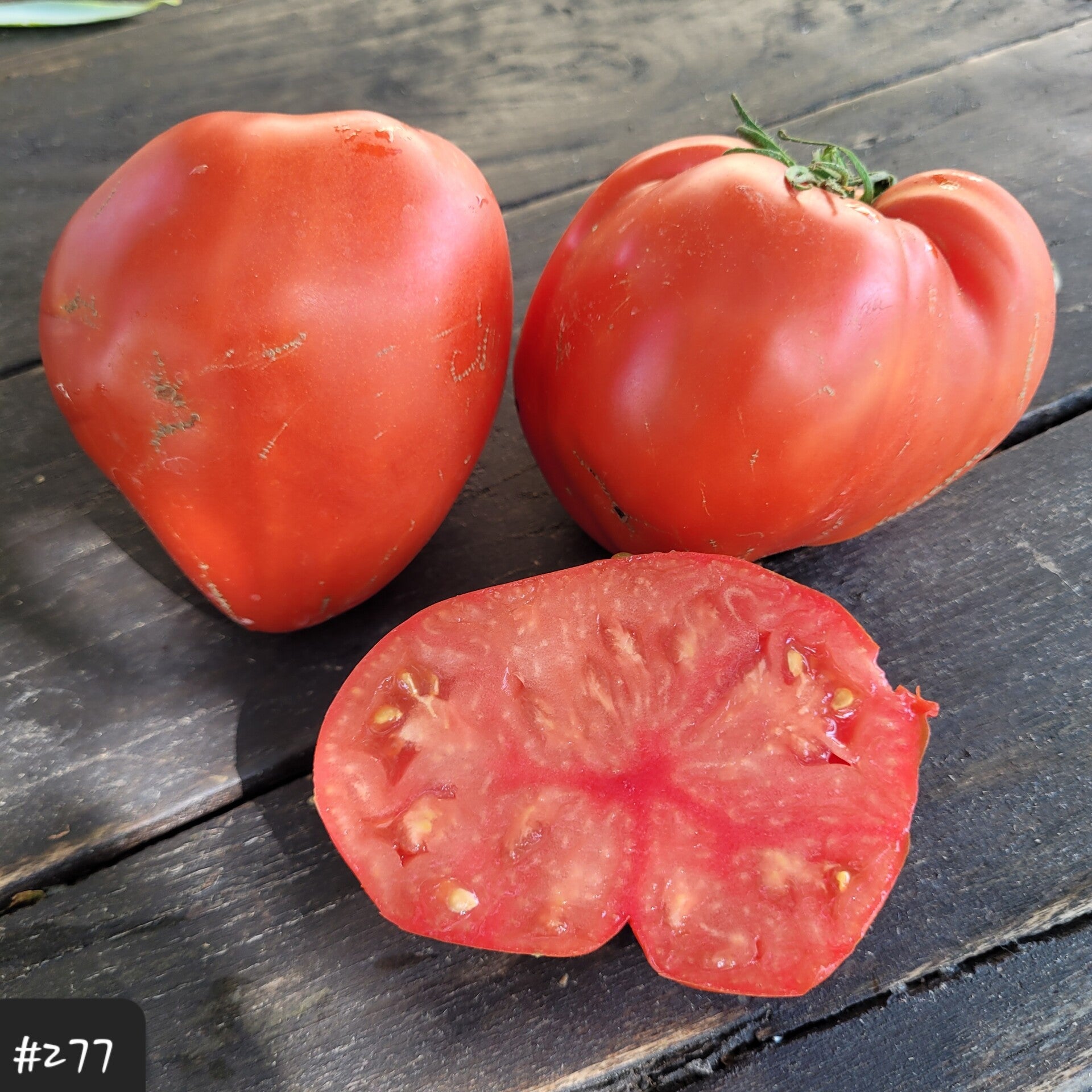 Eine große rote Fleischtomate, teilweise mit leichtem Orange-Schimmer. Die Herzen sind sehr fleischig und haben wenig Gallerte. Sie schmecken ausgewogen süß und aromatisch mit einer feinen Säure.
