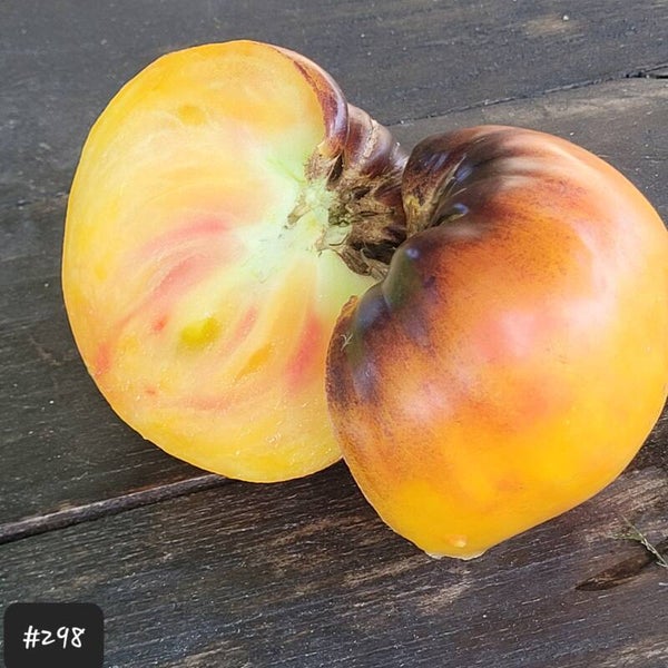 Ein großes mehrfarbiges Herz, zum großen Teil gelb, teilweise von oben her rotlich eingefärbt und mit einer Anthocyan-Schulter. Auch das Fruchtfleisch ist mehrfarbir durchzogen.