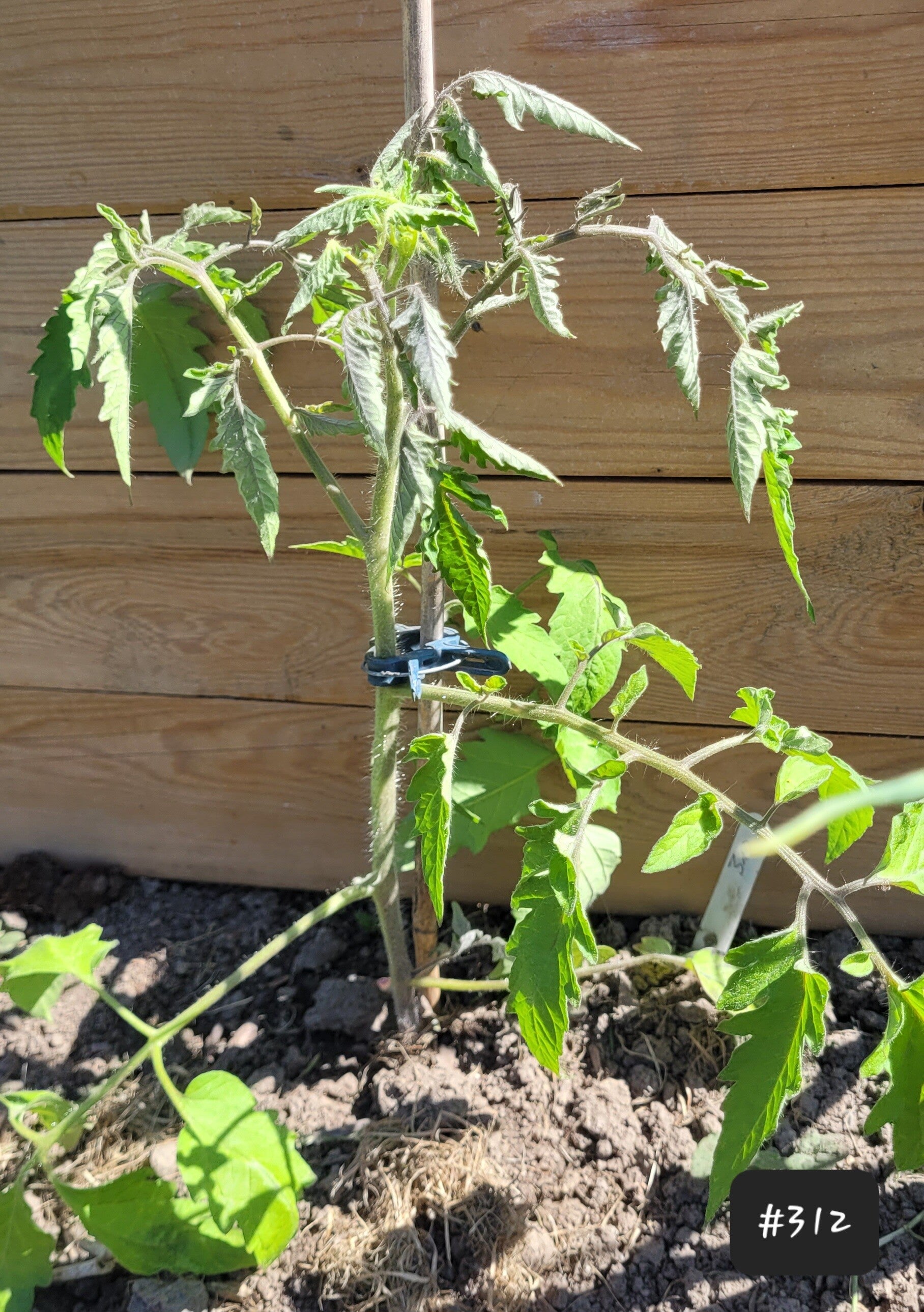 Der Busch muss nicht ausgegeizt werden, die Triebe werden durch die Tomaten jedoch nach unten gezogen, daher hatte ich sie zusammengebunden. Der Busch hat zartes Laub.