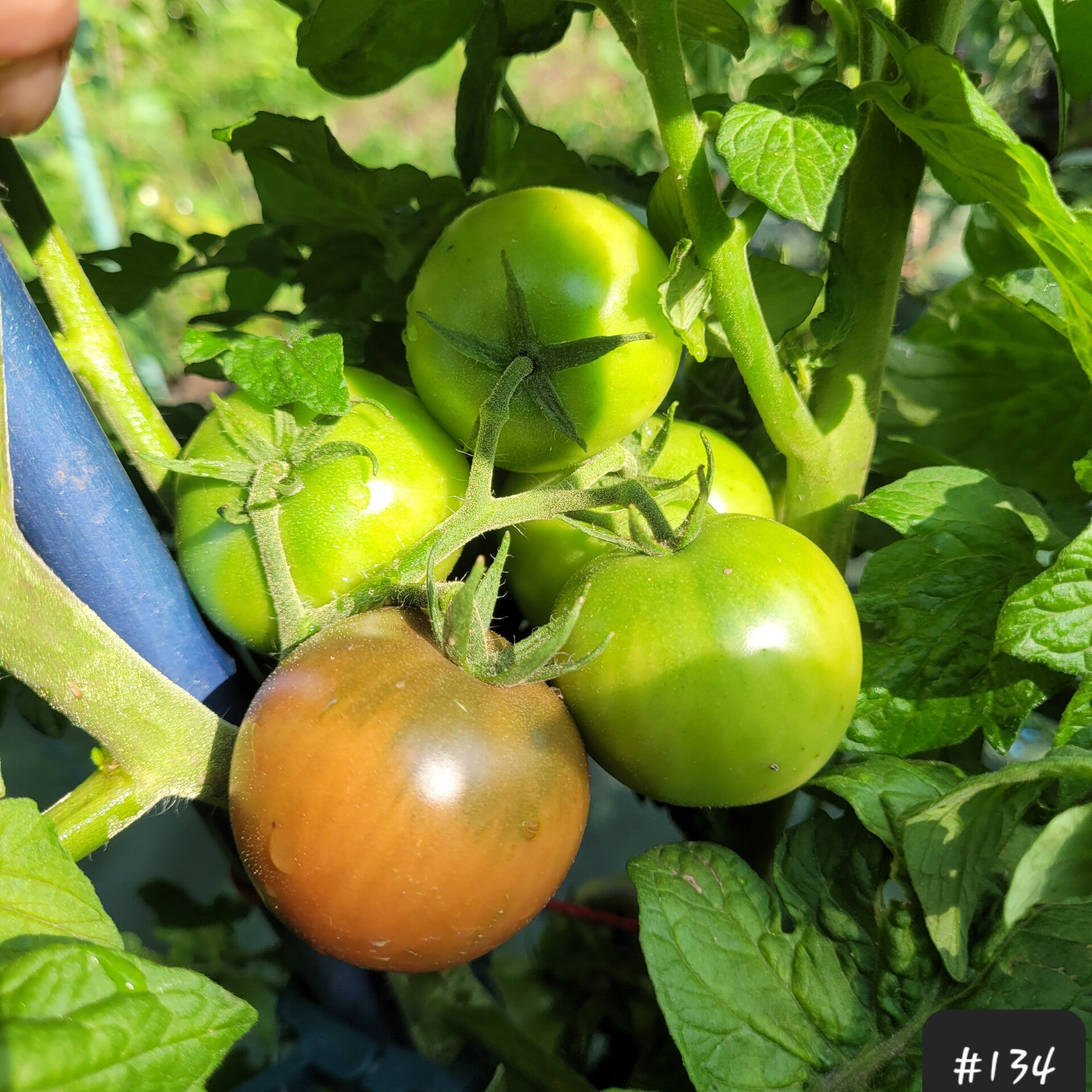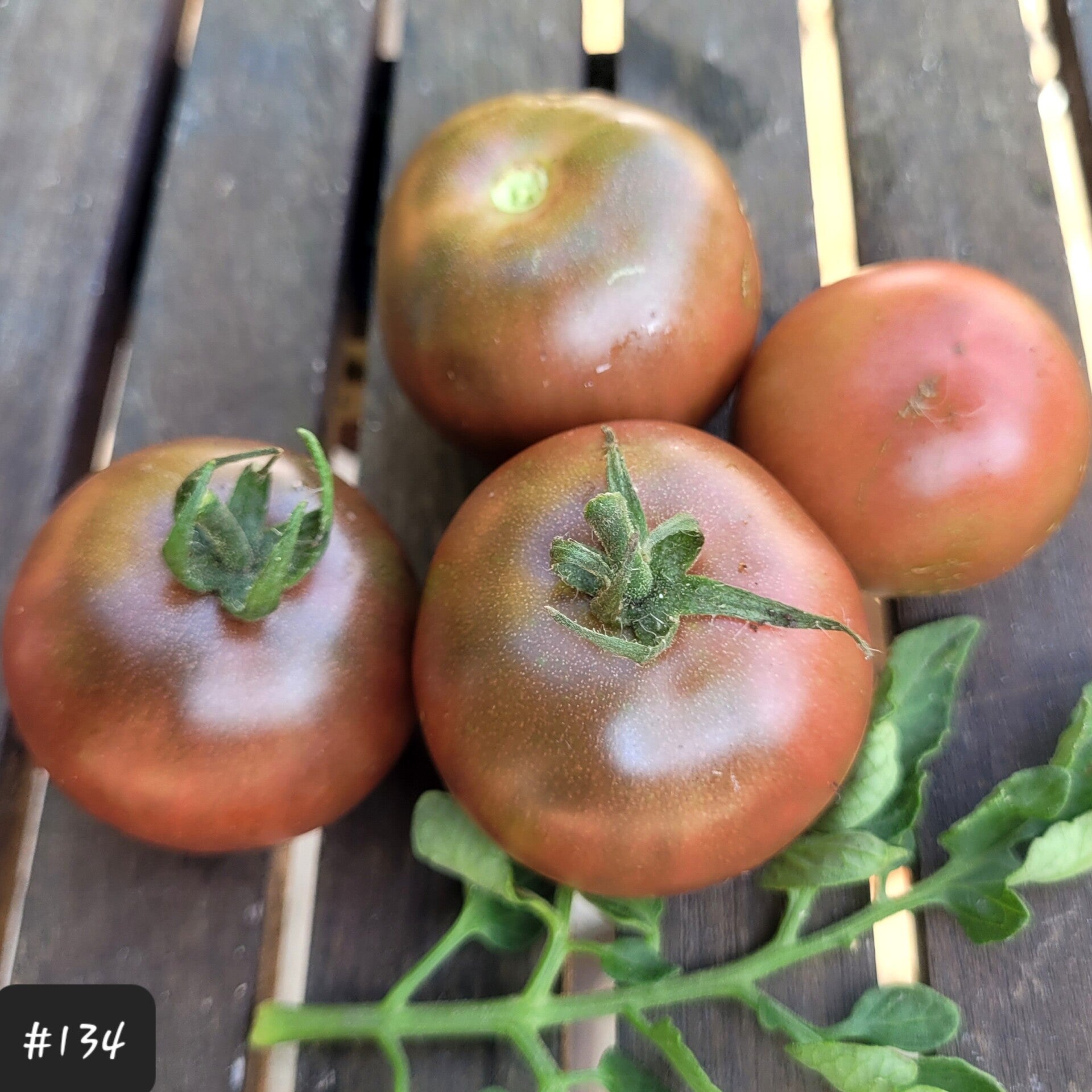 Eine runde dunkle Cocktailtomate, bräunlich mit einer dunklen Schulter. Das Fruchtfleisch ist ebenfalls bräunlich. Bei der Reifung wird sie von der Unterseite her eher weinrot.