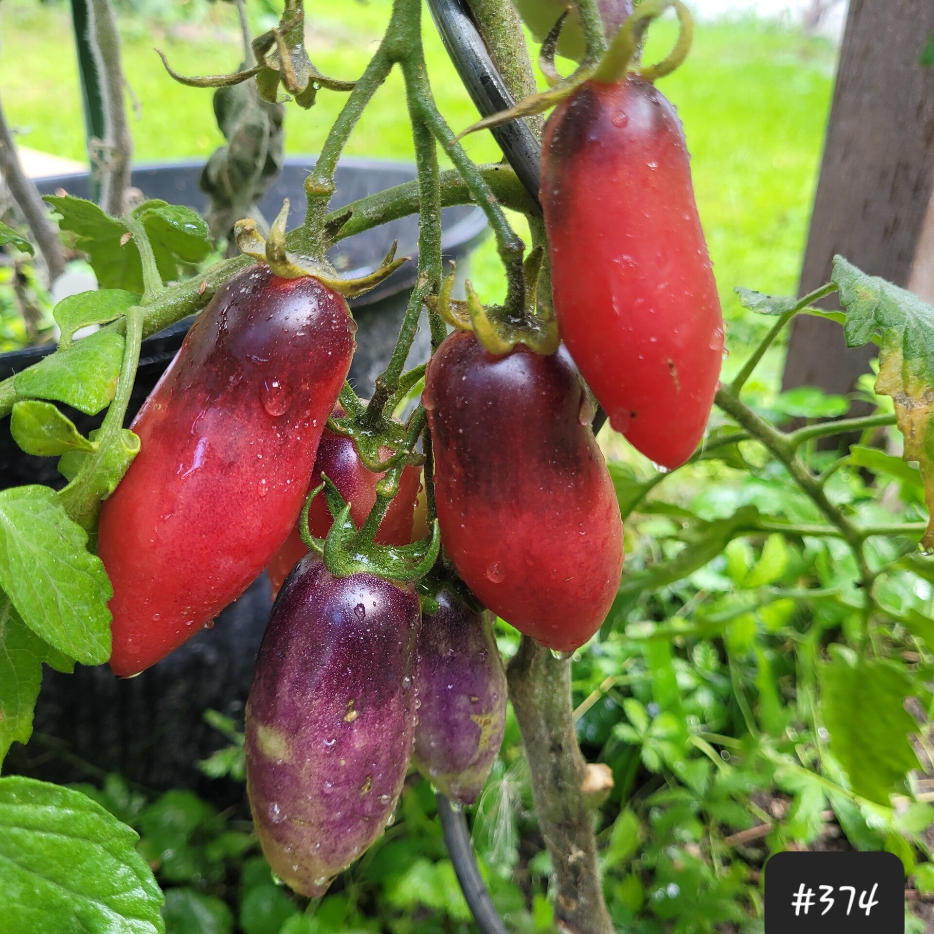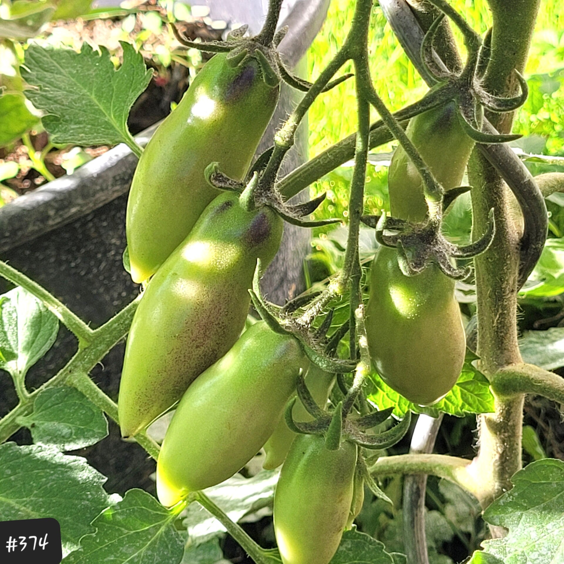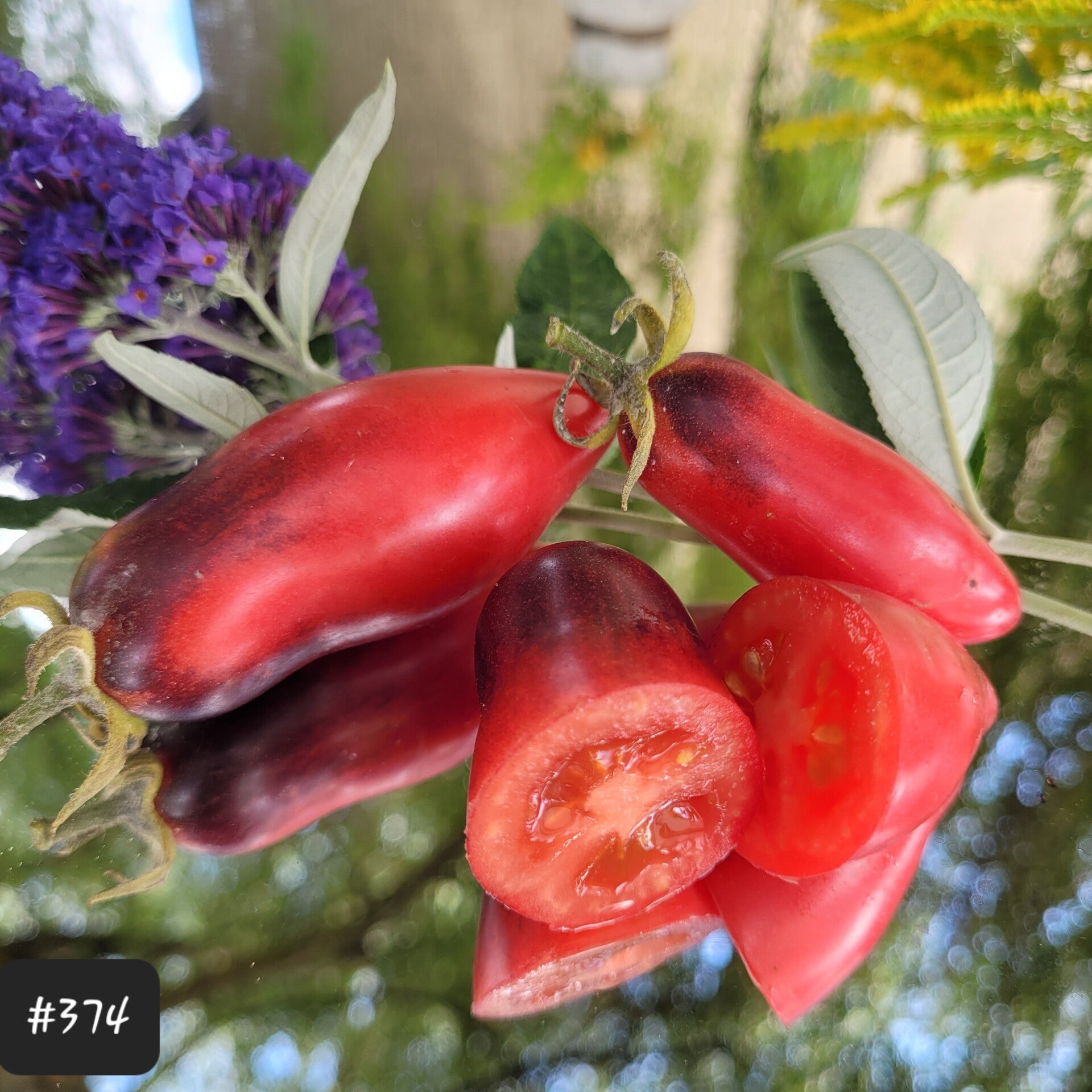 Eine wunderschöne längliche Salattomate, spitz, leuchtend rot mit einer dunklen Schulter. Je nach Sonneneinstrahlung ist die dunkle Färbung (Anthocyanin) mehr oder weniger ausgeprägt und verläuft sich in zarten Streifen zur Spitze hin.