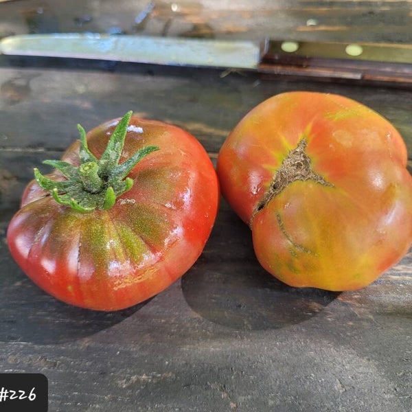 Bei dieser mehrfarbigen Fleischtomate ist von ocker, gelb, rötlich, braun, dunkelgrün mit dunkler Schulter ein großes Farbspektrum vertreten. Bei der Reifung kommen mehr Rosa- und Rottöne hinzu. Manchmal sieht sie auch etwas fleckig aus, aber das gehört alles dazu und macht sie wirklich spannend.