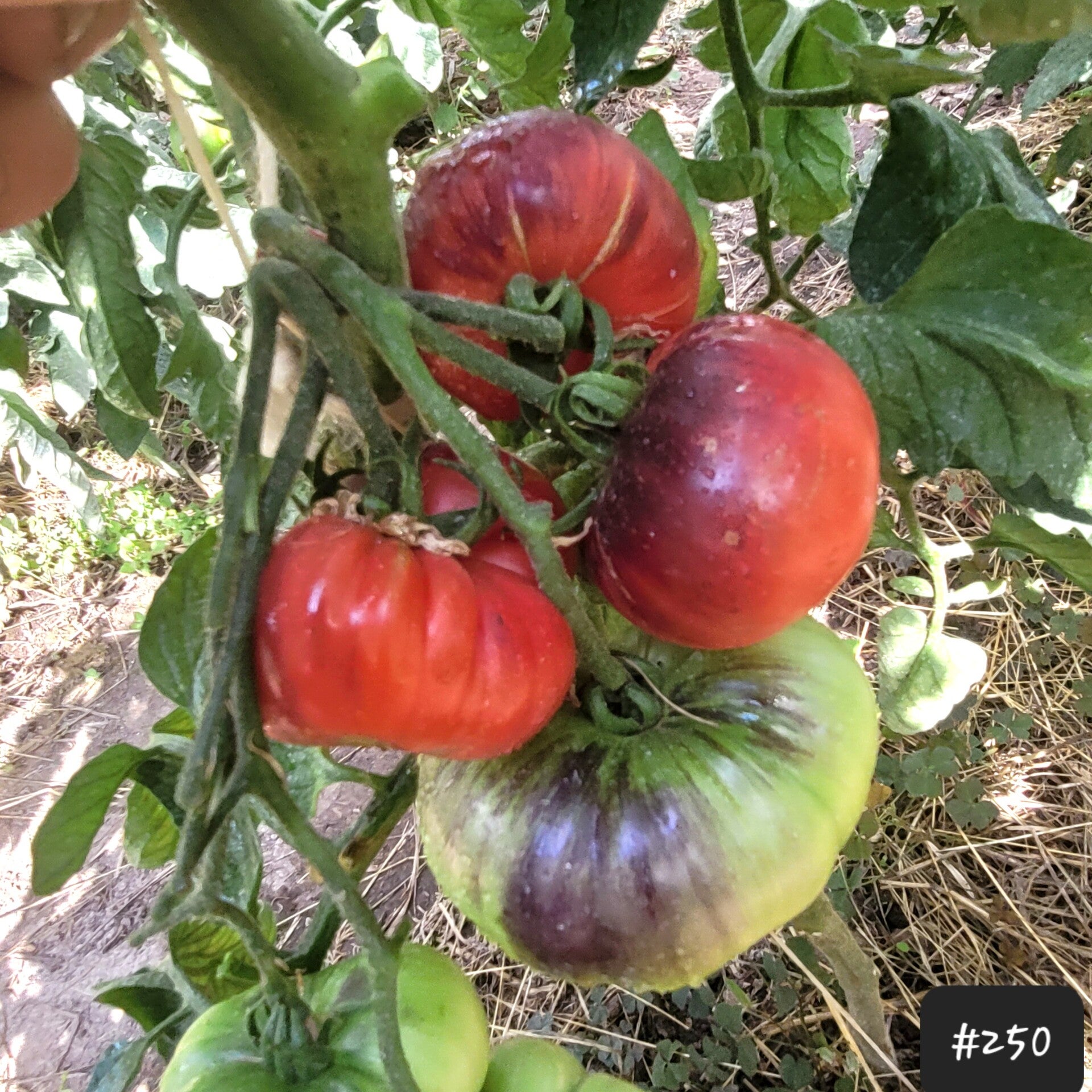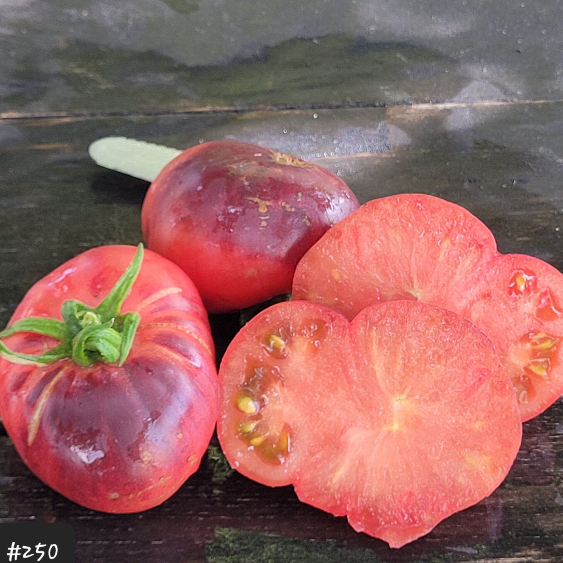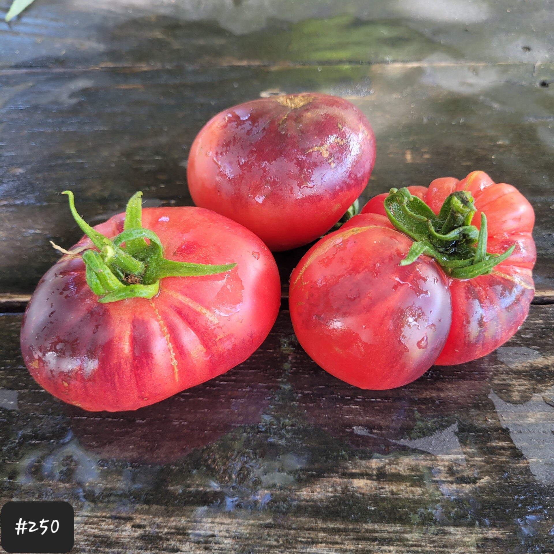Eine wunderschöne, leuchtend rote Fleischtomate, flachrund und leicht gerippt und mit einer deutlich ausgeprägten dunklen Schulter. Diese kommt vom hohen Anthocyanin-Gehalt.