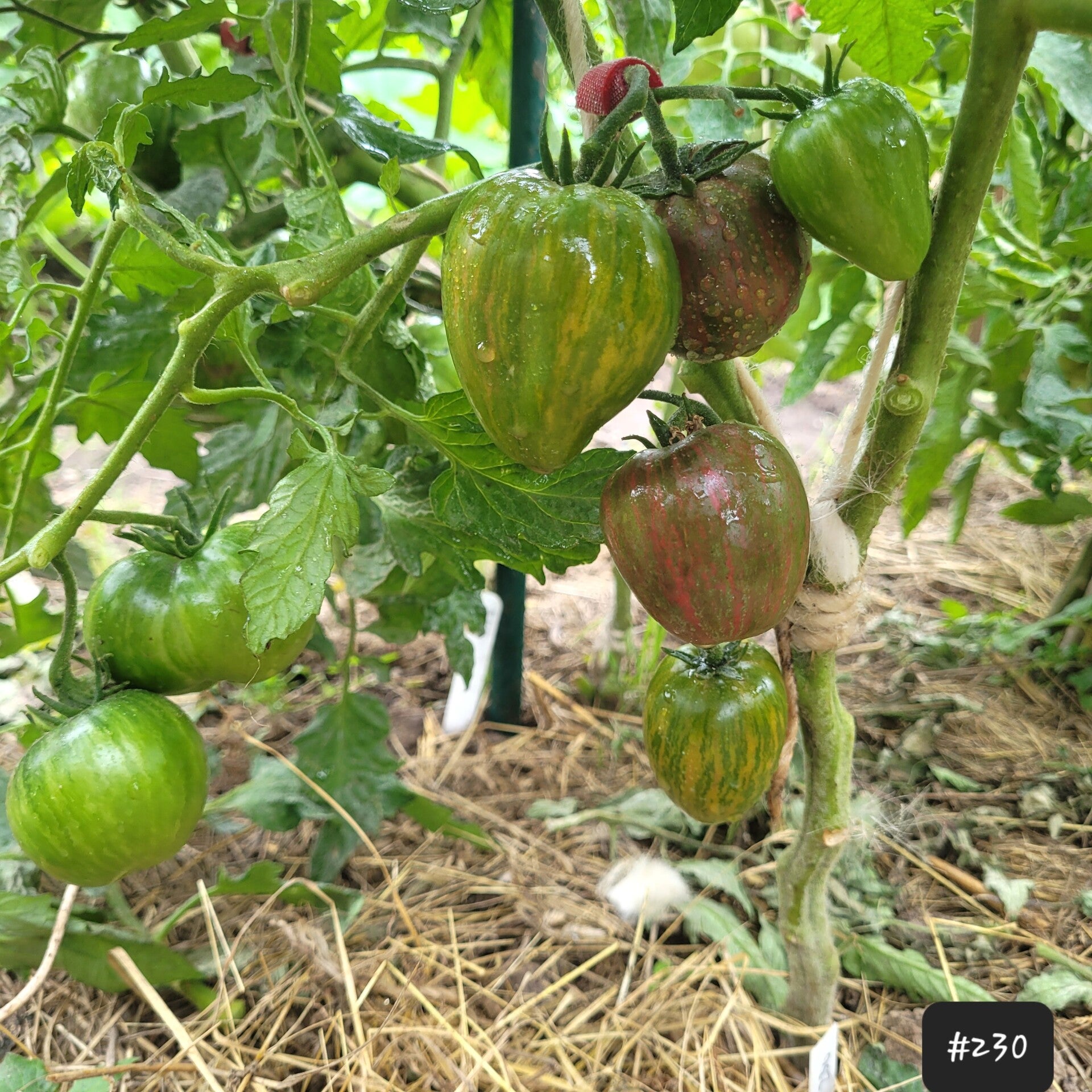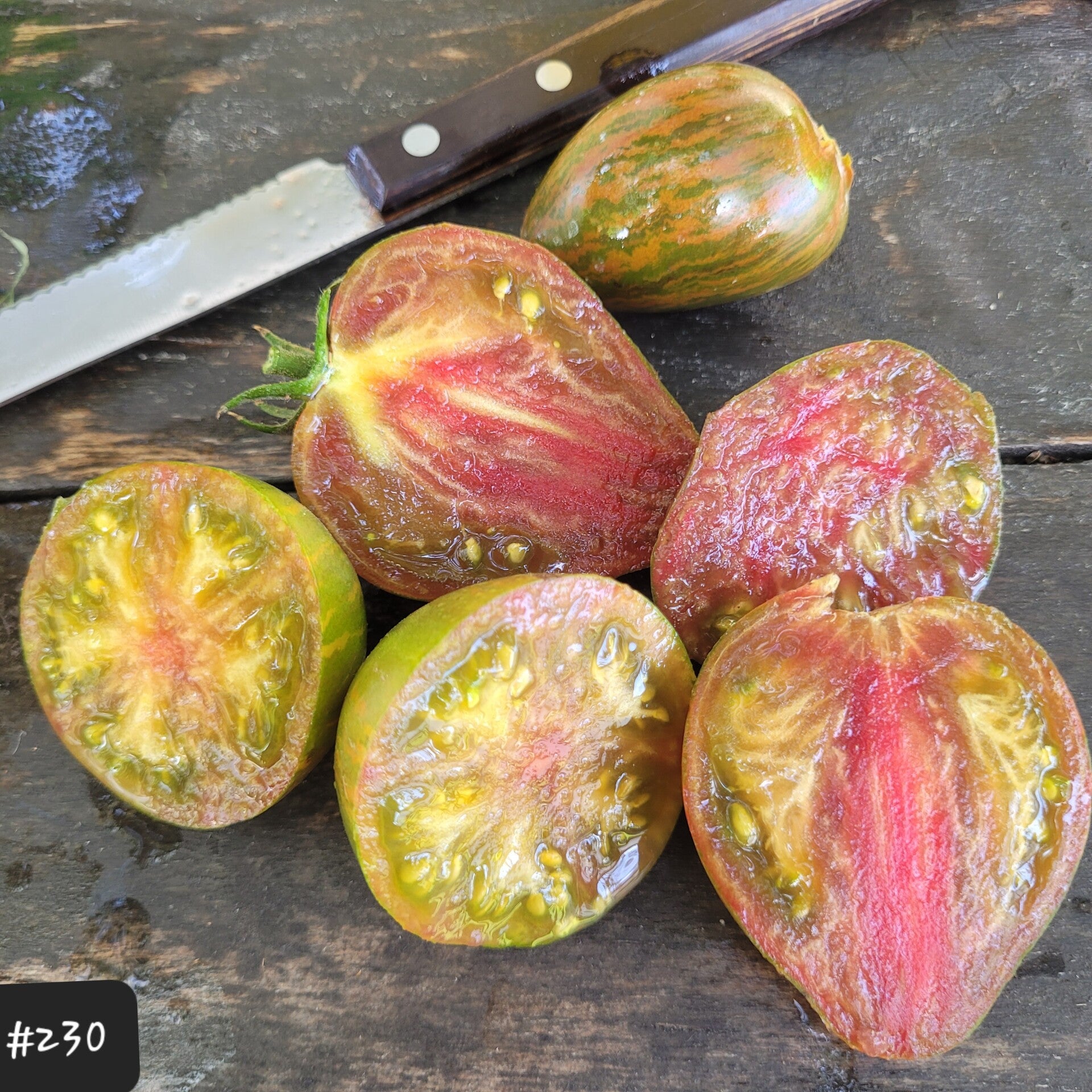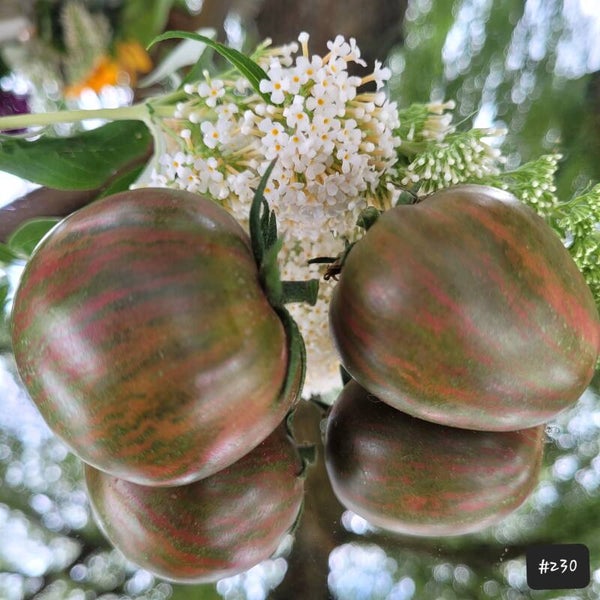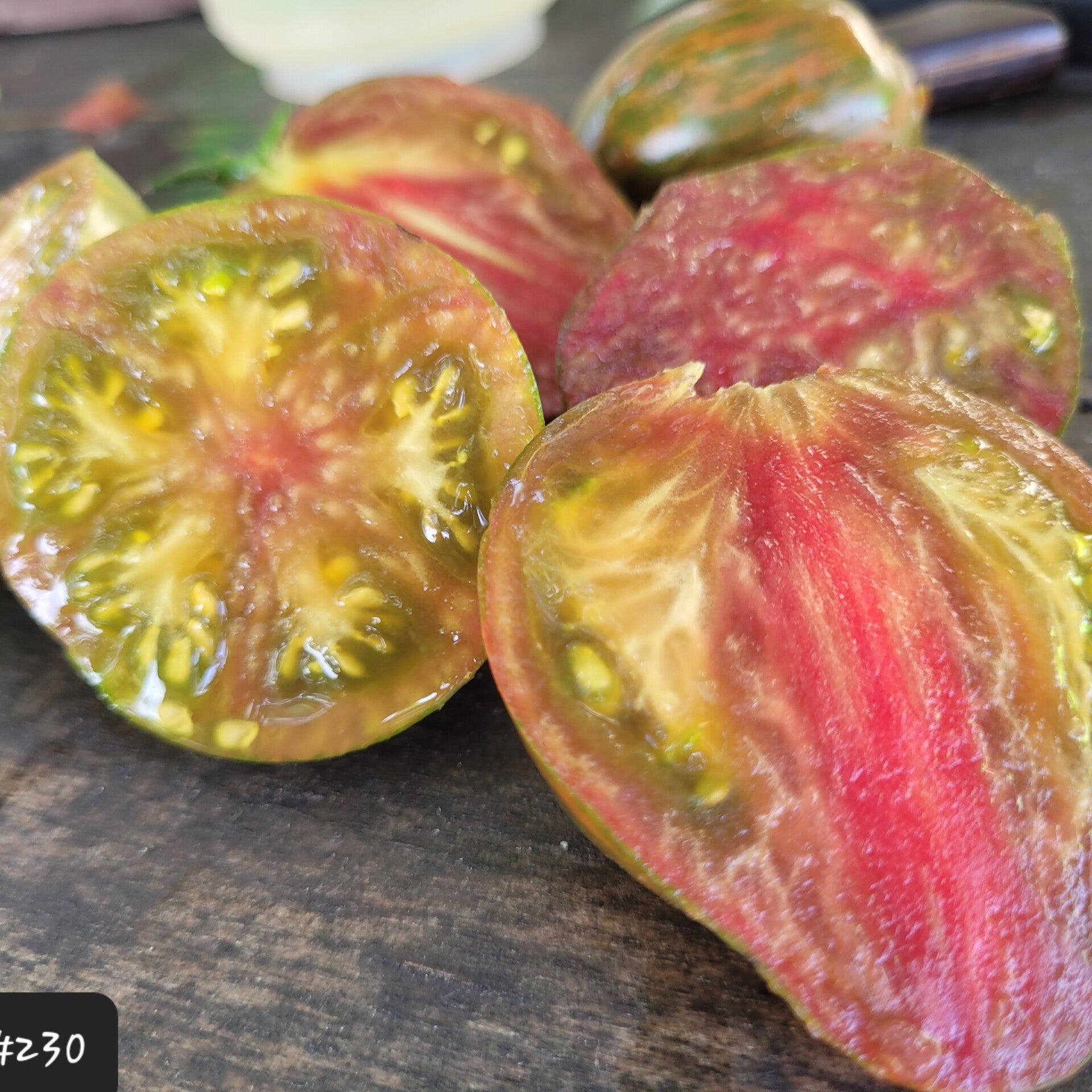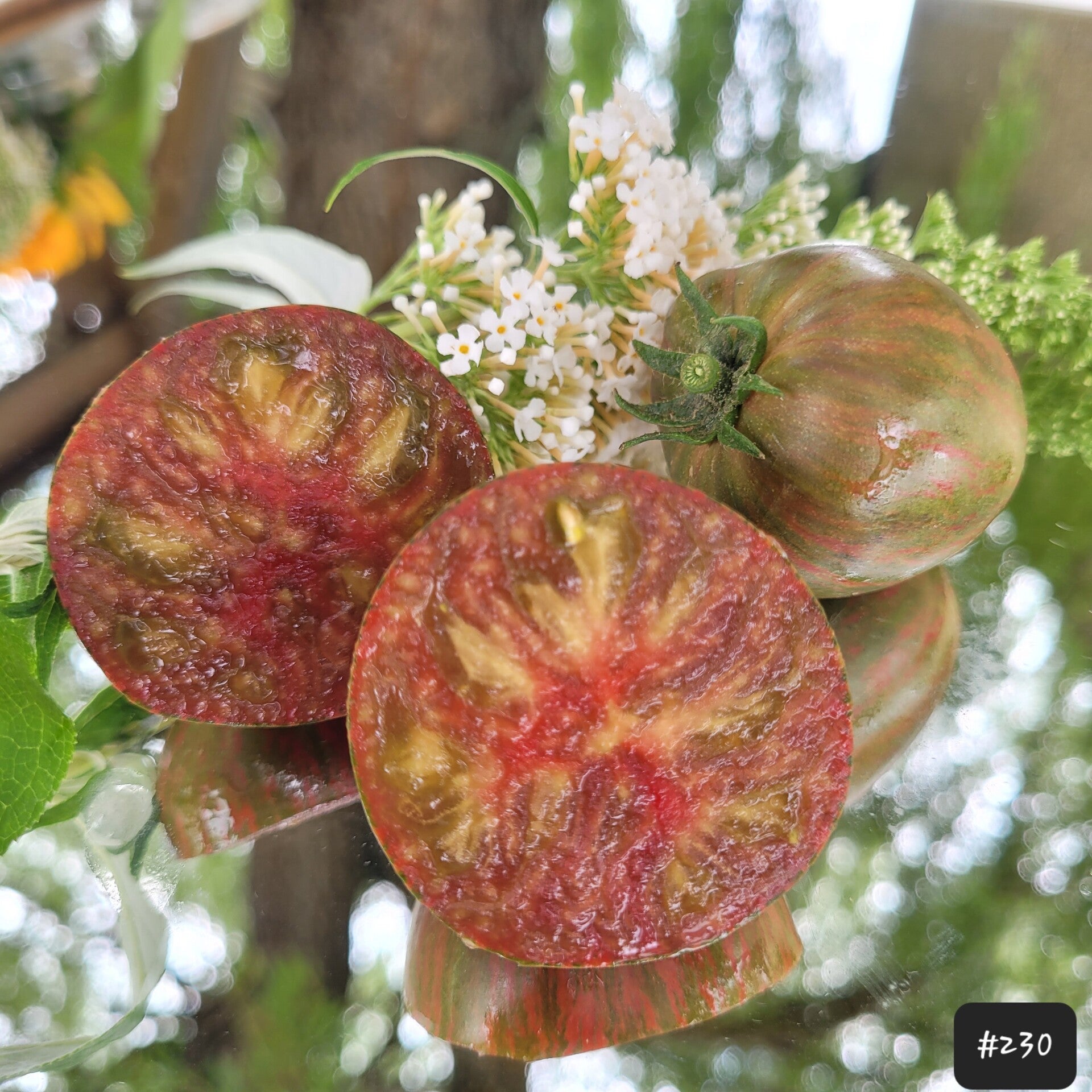 Eine mehrfarbige Fleischtomate, von der Ferne bräunlich anmutend, doch beim genauen Hinschauen eine orange, ocker bis dunkelrote Frucht mit dunkelgrünen Streifen. Das Fruchtfleisch ist ebenfalls mehrfarbig, von senfgelb über ocker bis hin zu blutrot.