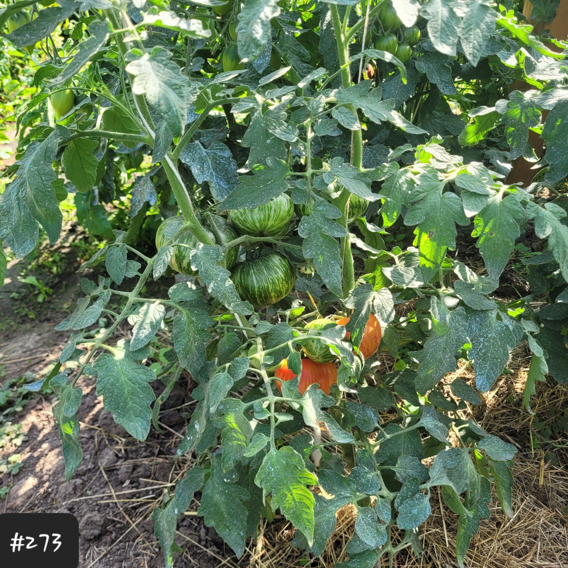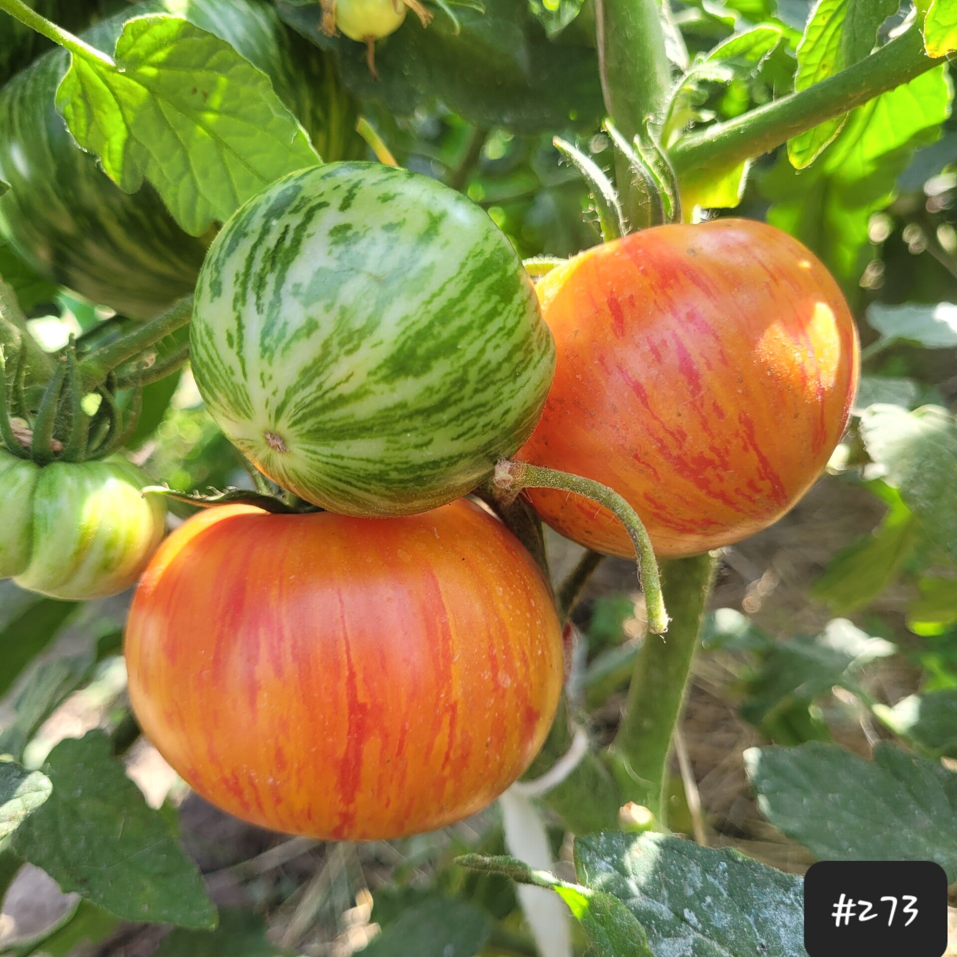 Eine große flachrunde Fleischtomate, deren gelbe Haut wunderschön mit roten Streifen überzogen ist. Und auch das Fruchtfleisch ist mehrfarbig, gelb-orange und zur Mitte hin rötlich.