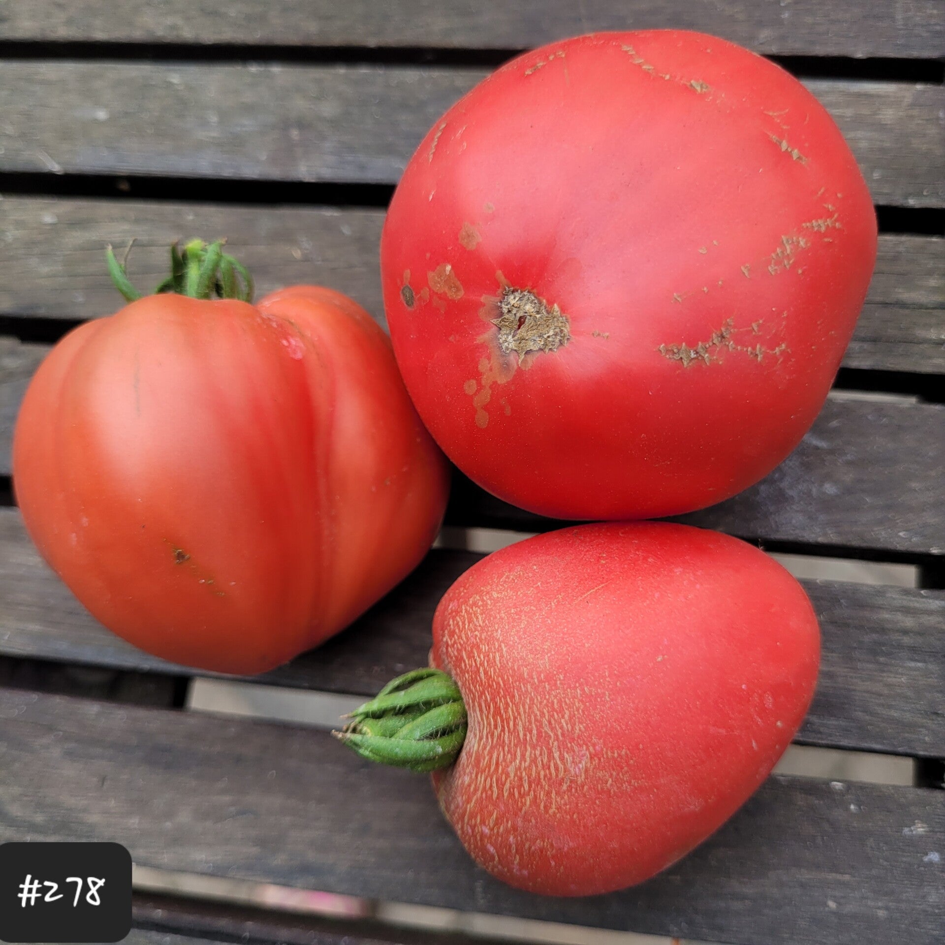 Eine große rote Ochsenherz-Fleischtomate, herz- bzw. erdbeerförmig und teilweise leicht gerippt. Die Tomaten sind sehr fleischig und haben wenig Gallerte. Das Fruchtfleisch ist dicht und nicht mehlig.