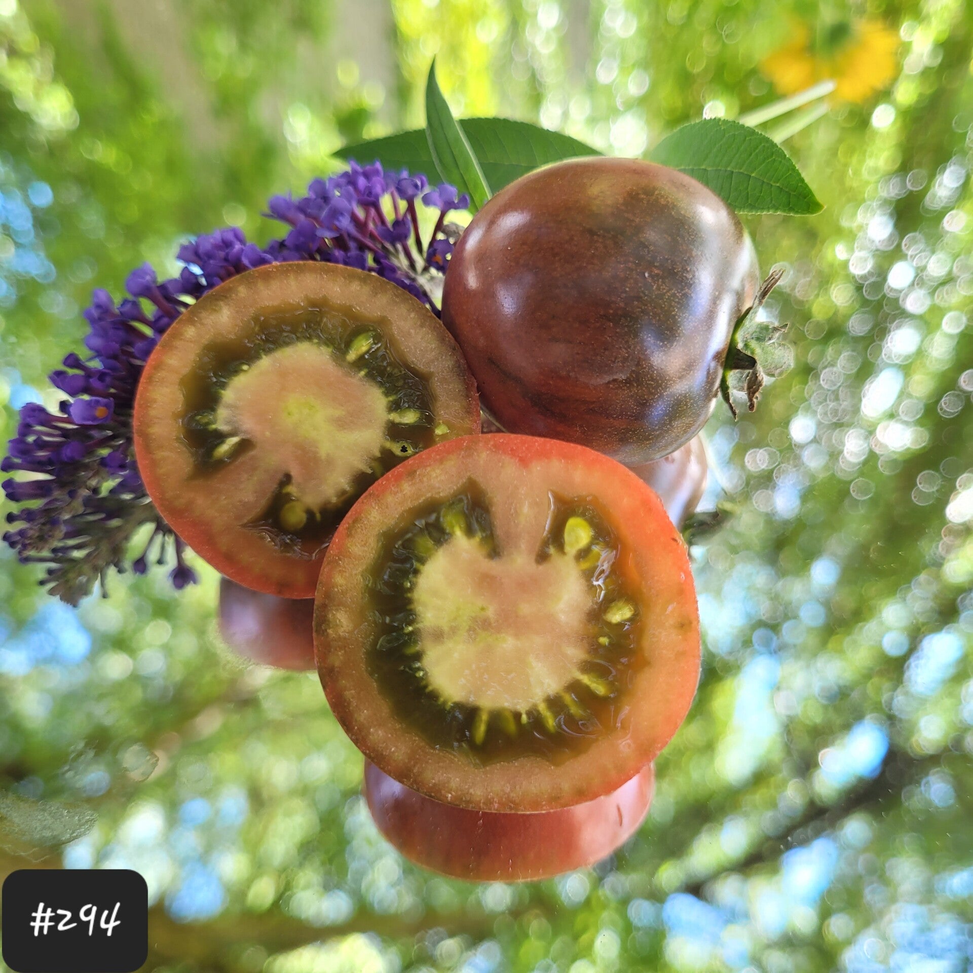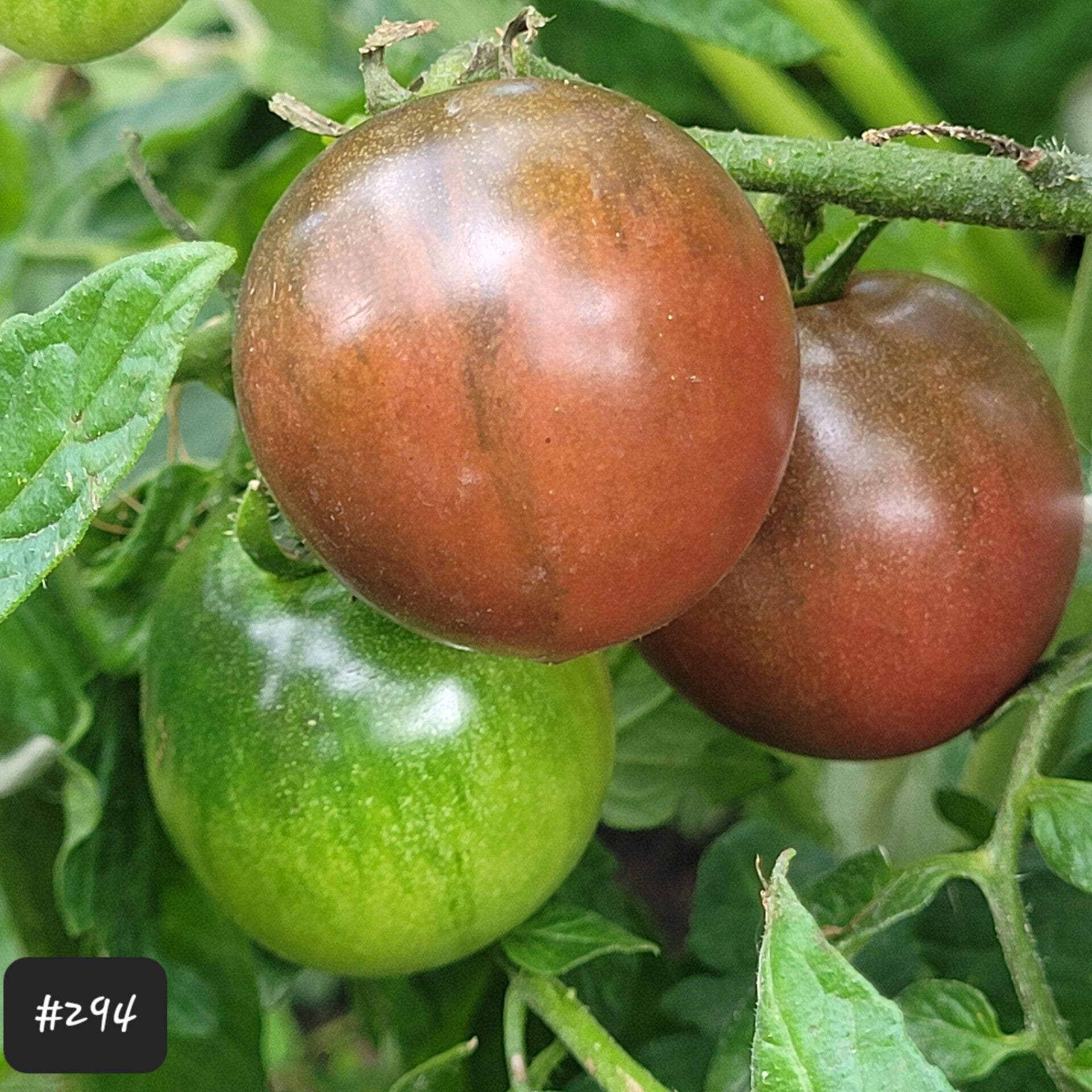 Eine glänzende braune runde Cocktailtomate mit dunkler Schulter. Sie ist platzfest, saftig und fleischig. Sie ist süß mit einem "reichen dunklen" Aroma.