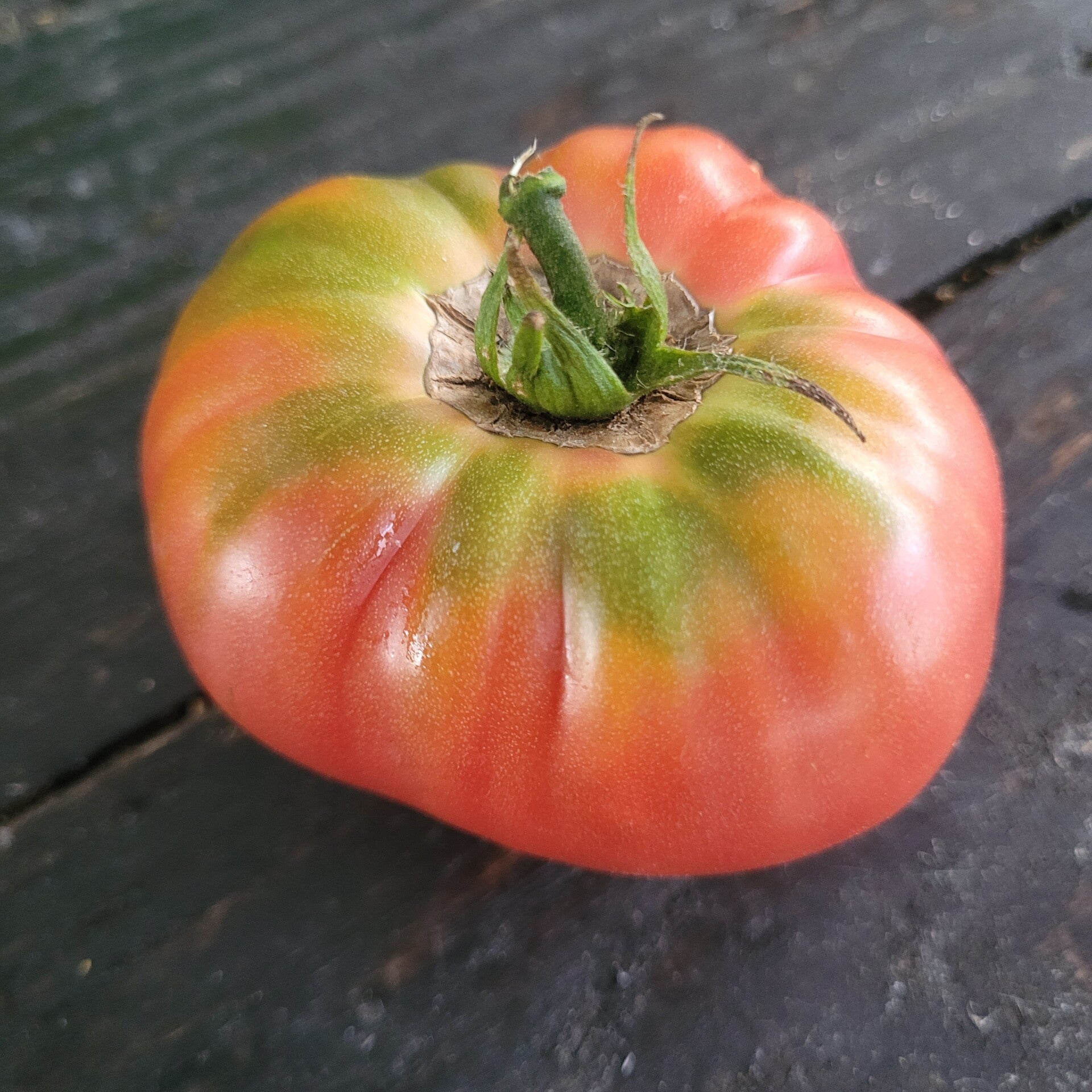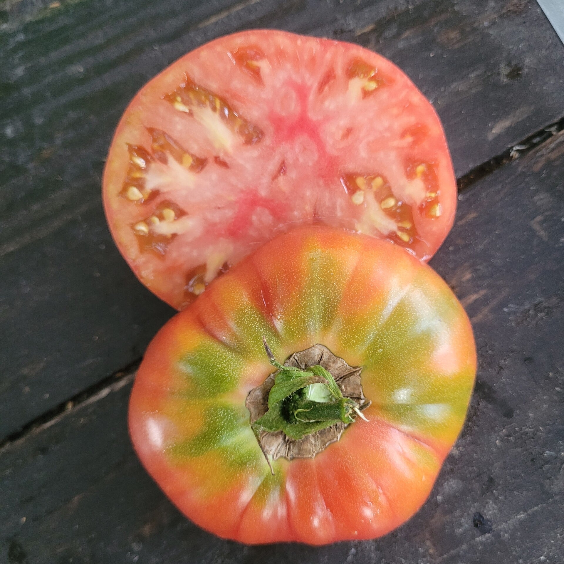 Eine rote bzw. dunkelrosa leicht herzförmige Fleischtomate. Diese alte Sorte aus Kanada ist festfleischig und total platzfest. Sie ist manchmal leicht gerippt.