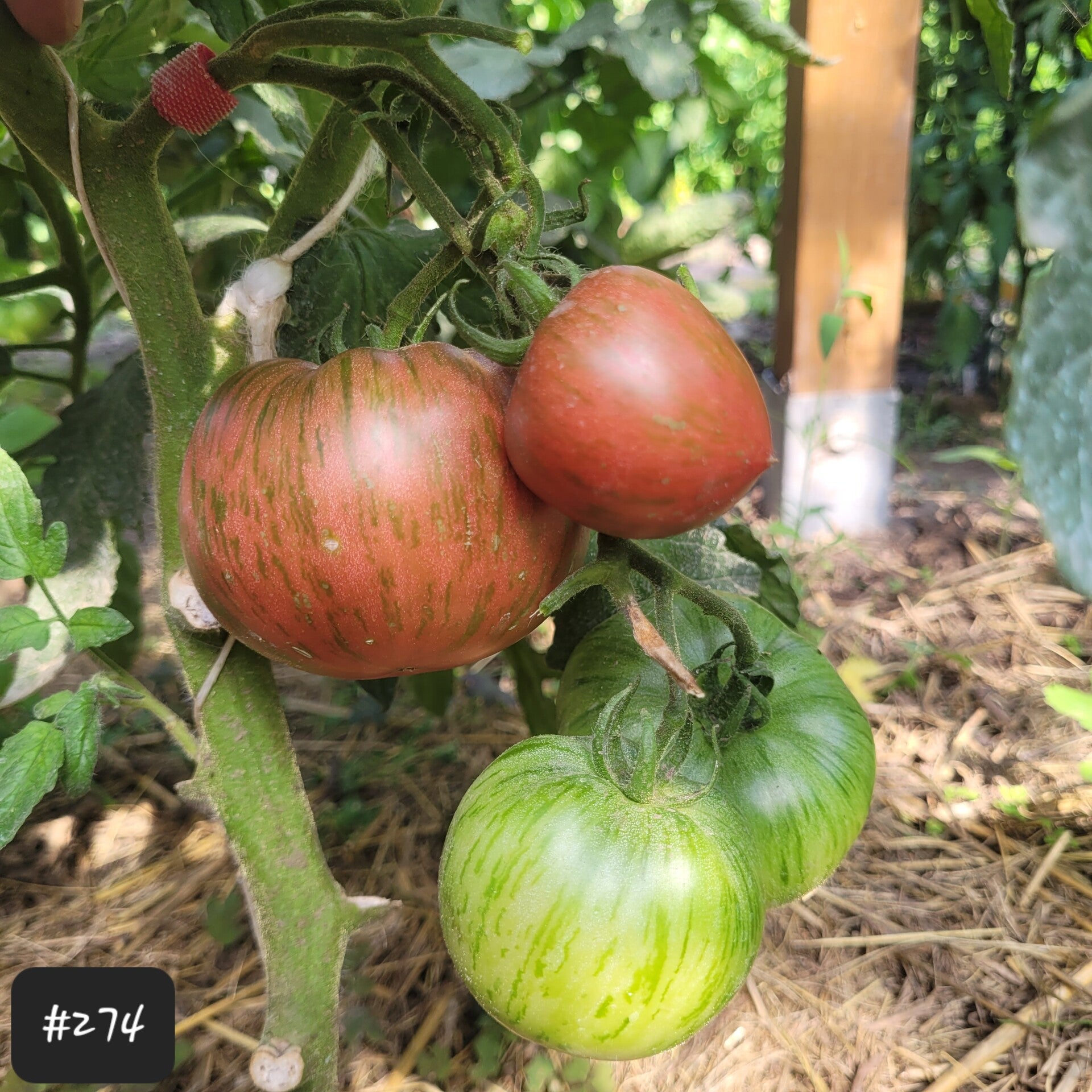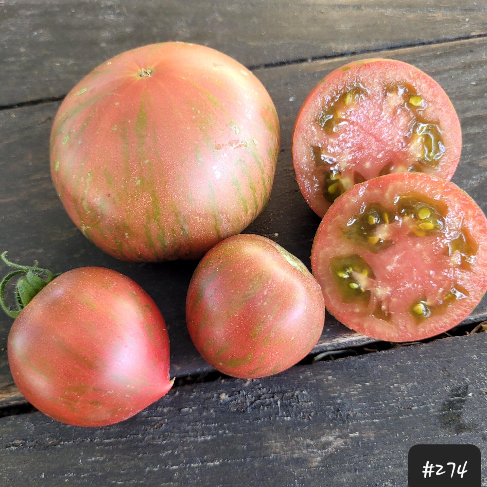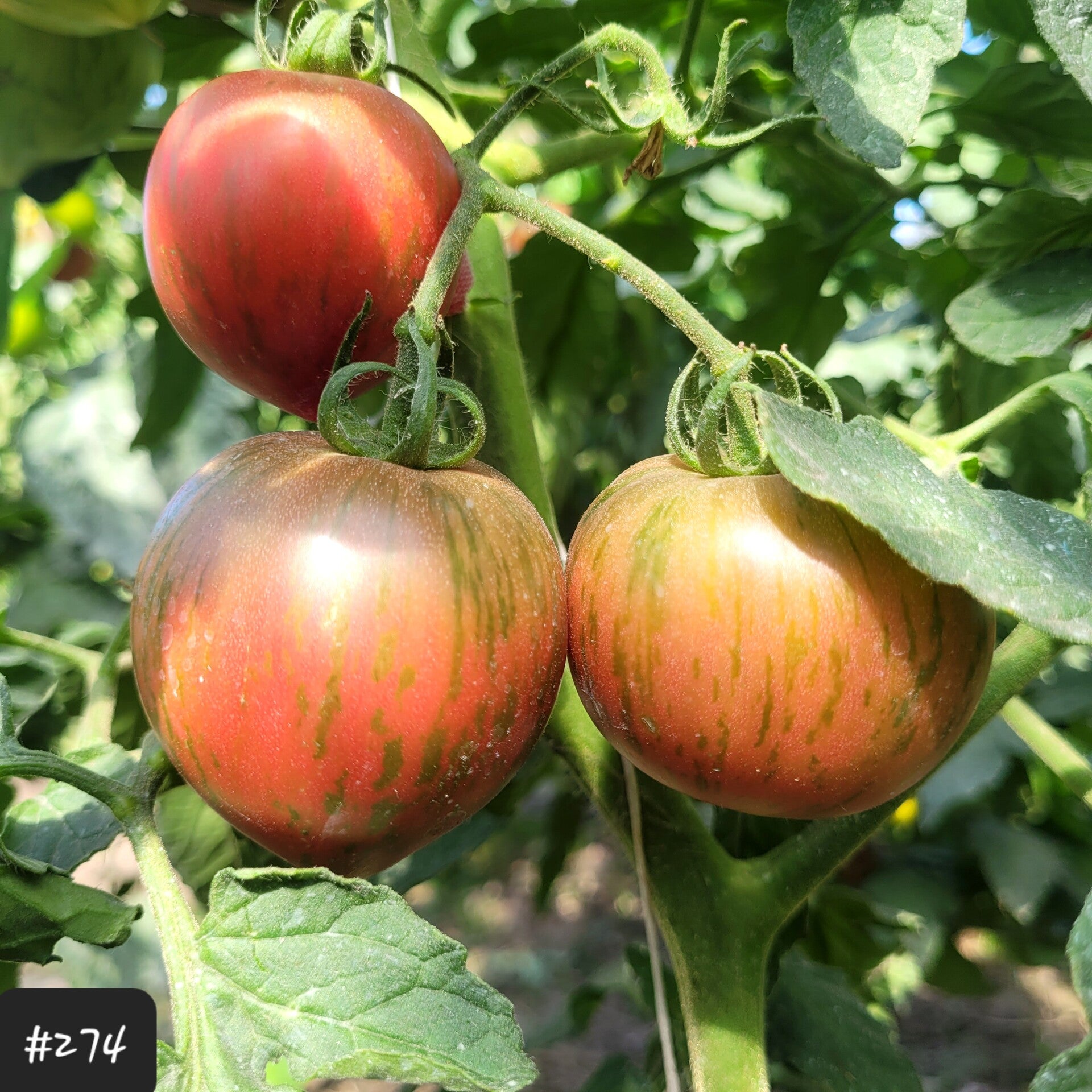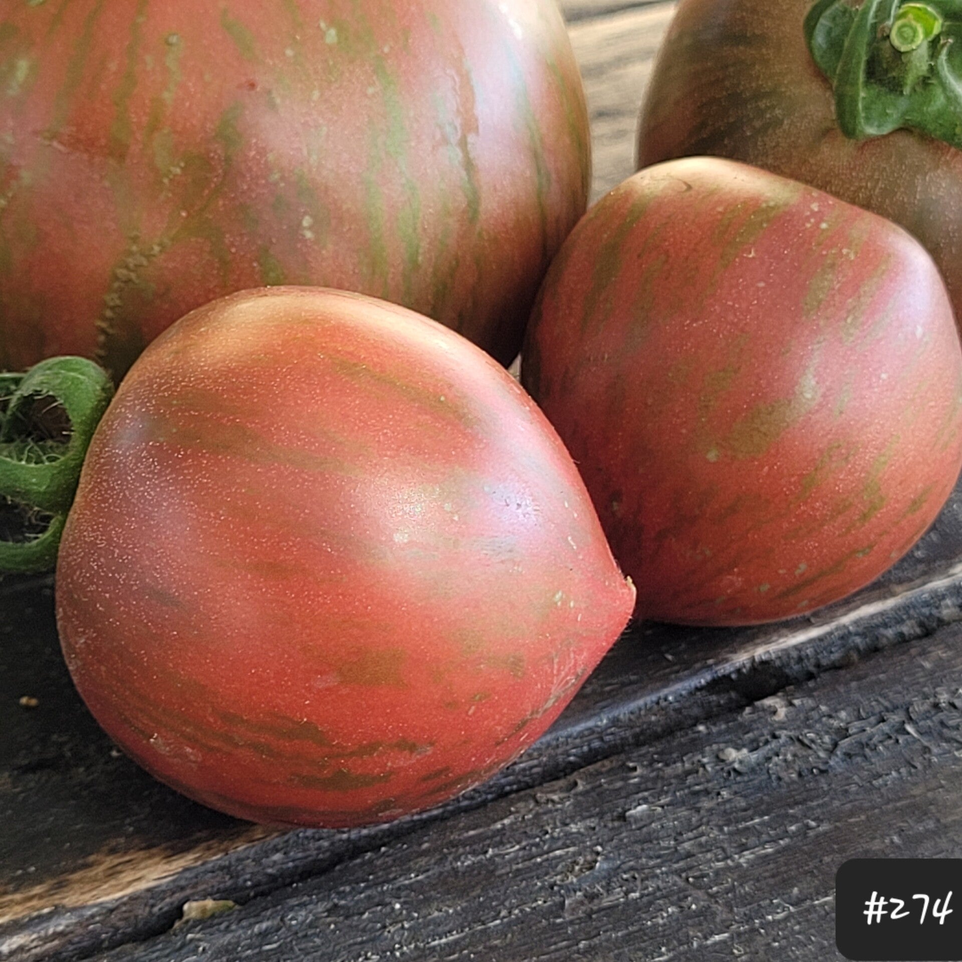 Eine wunderschöne dunkelrote bzw. burgunderfarbene Fleischtomate mit dunkelgrünen Streifen. Die Tomaten sind mittelgroß, rund und oft mit einer ausgeformten kleinen Spitze.