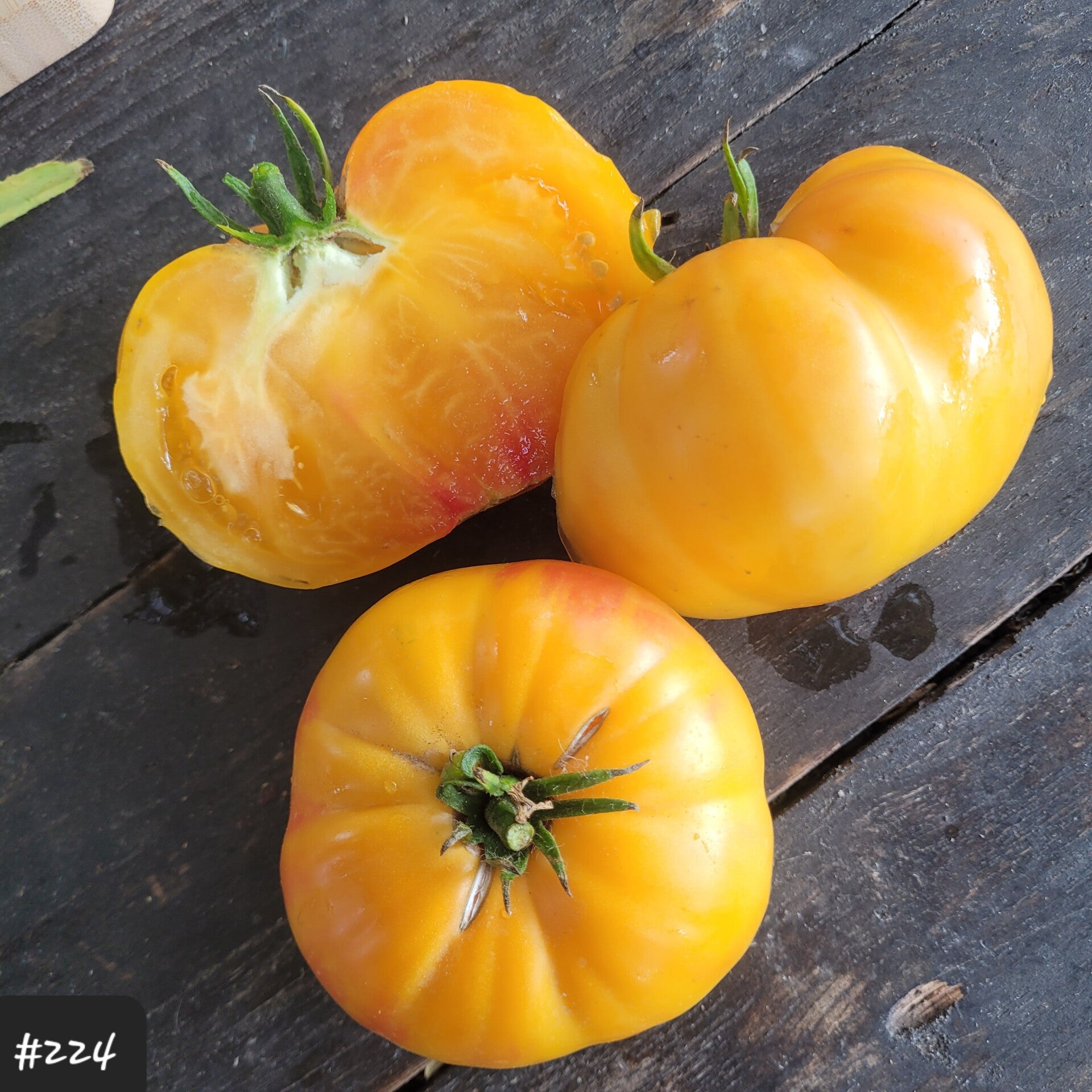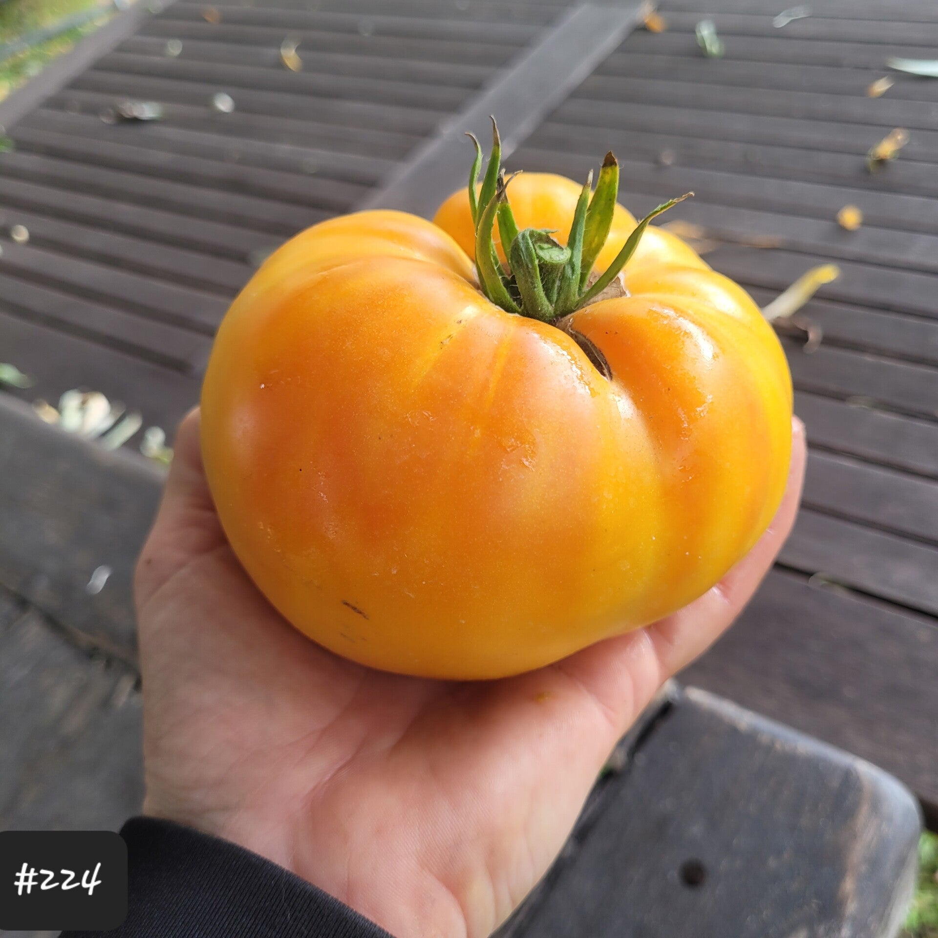 Eine große, teilweise riesige Fleischtomate. Sie ist flachrund und teilweise leicht gerippt.