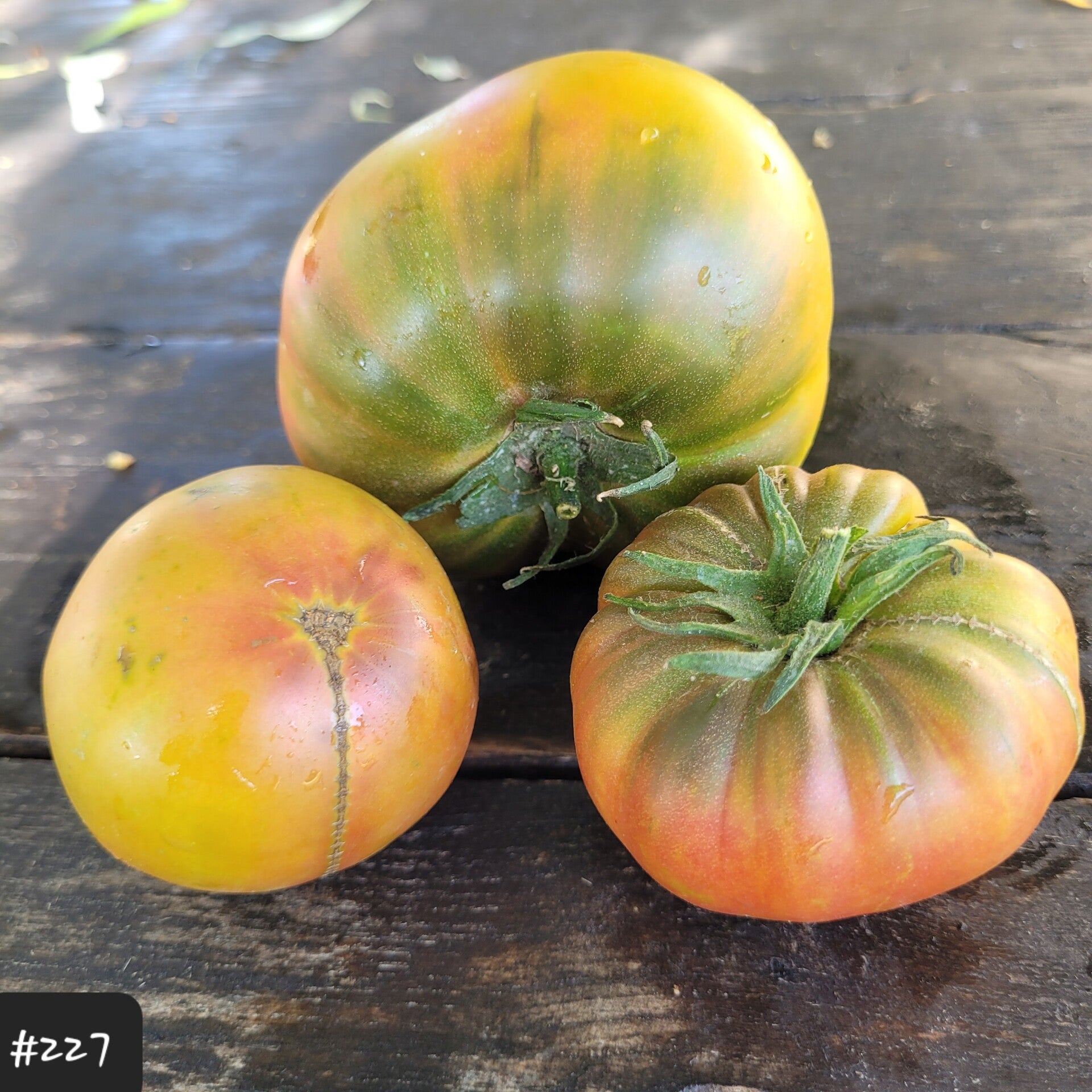 Die Tomaten sind mehrfarbig, ockergelb und rosa-rot mit einer grünen Schulter. Es handelt sich hier nicht um einen Grünkragen, sondern sie gehört sortenspezifisch dazu. Das Fruchtfleisch ist ebenfalls mehrfarbig. Grün-gelblich zum Rand hin und in der Mitte rosa durchfärbt.