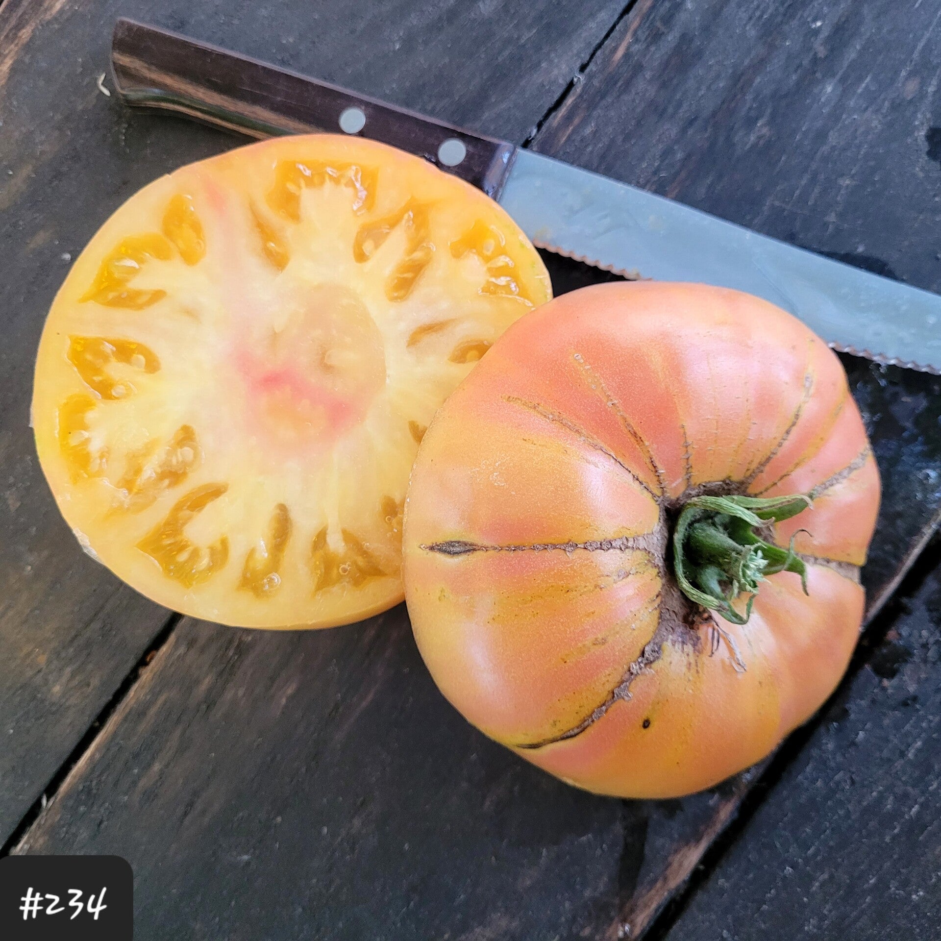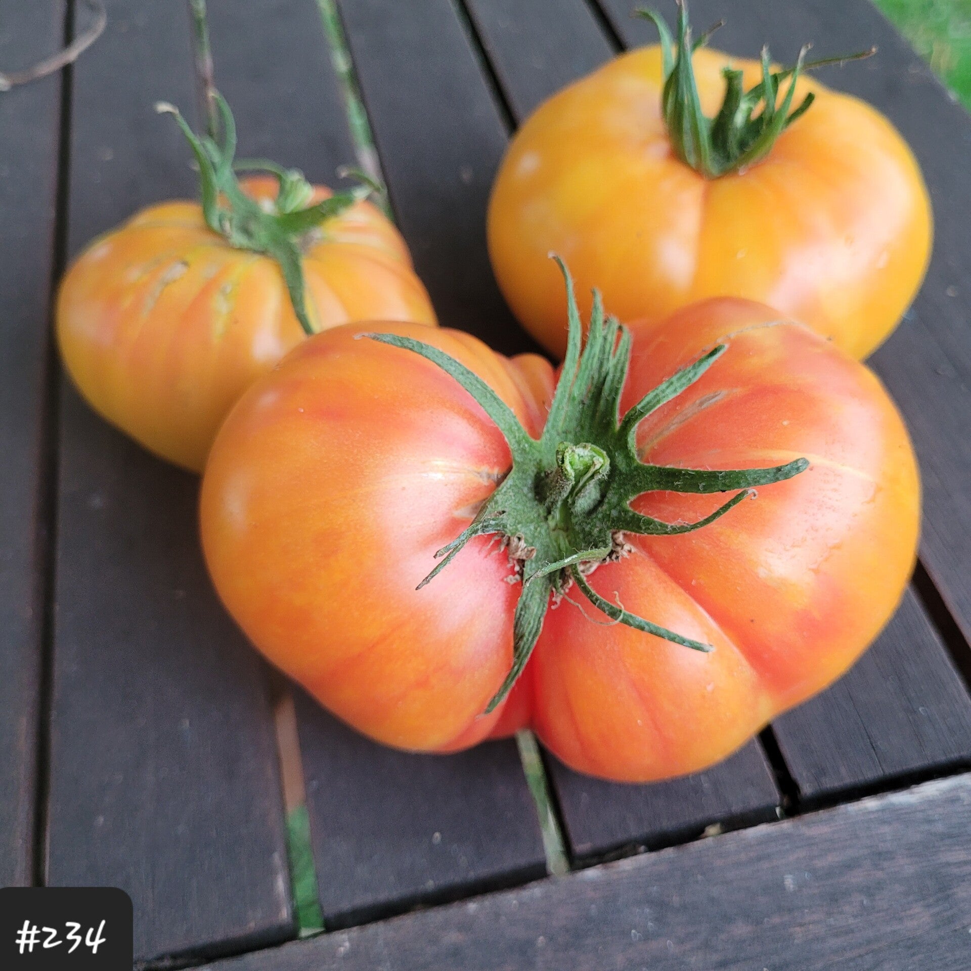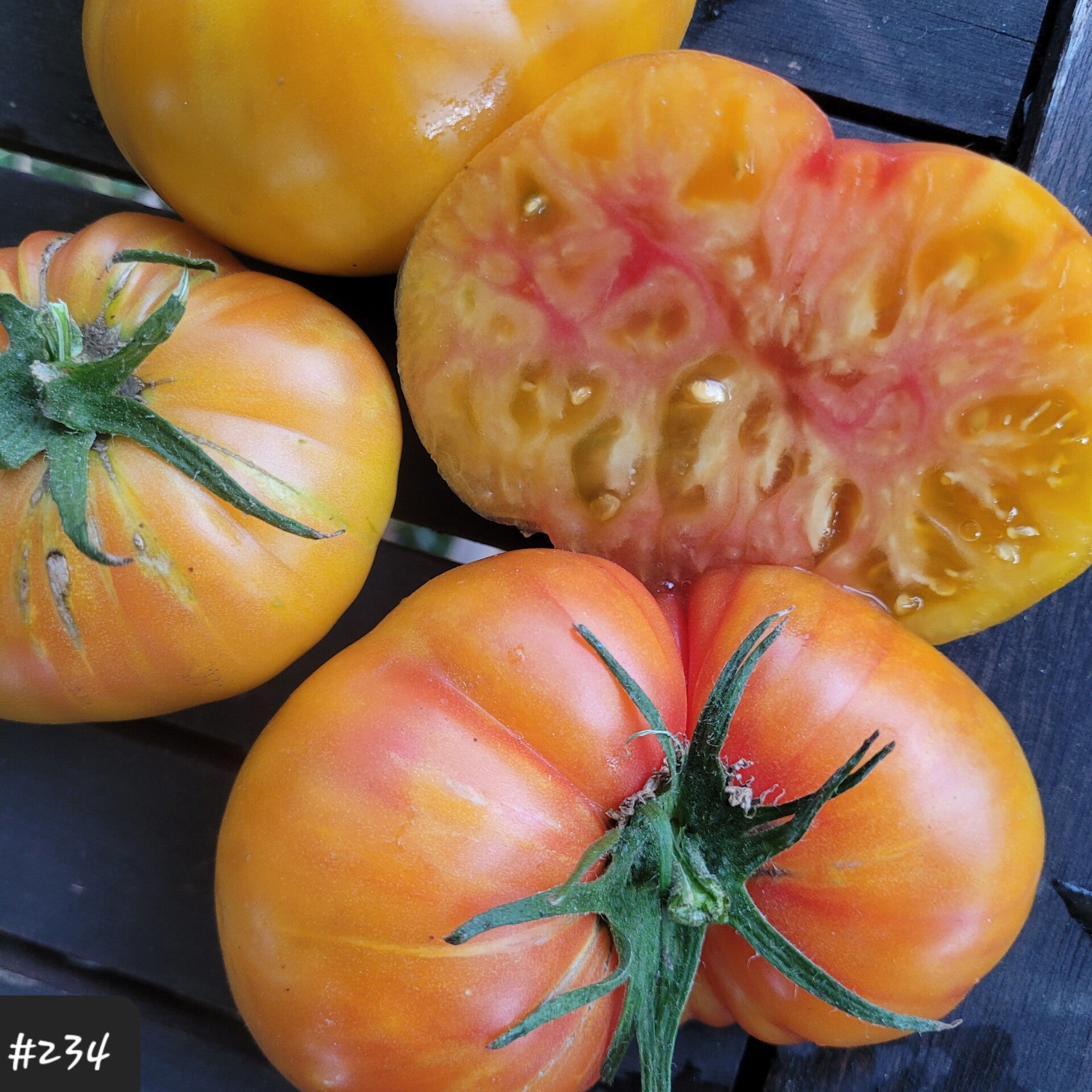Die große Fleischtomate ist gelb-rot, flachrund und leicht gerippt. Manche Früchte können riesig werden.