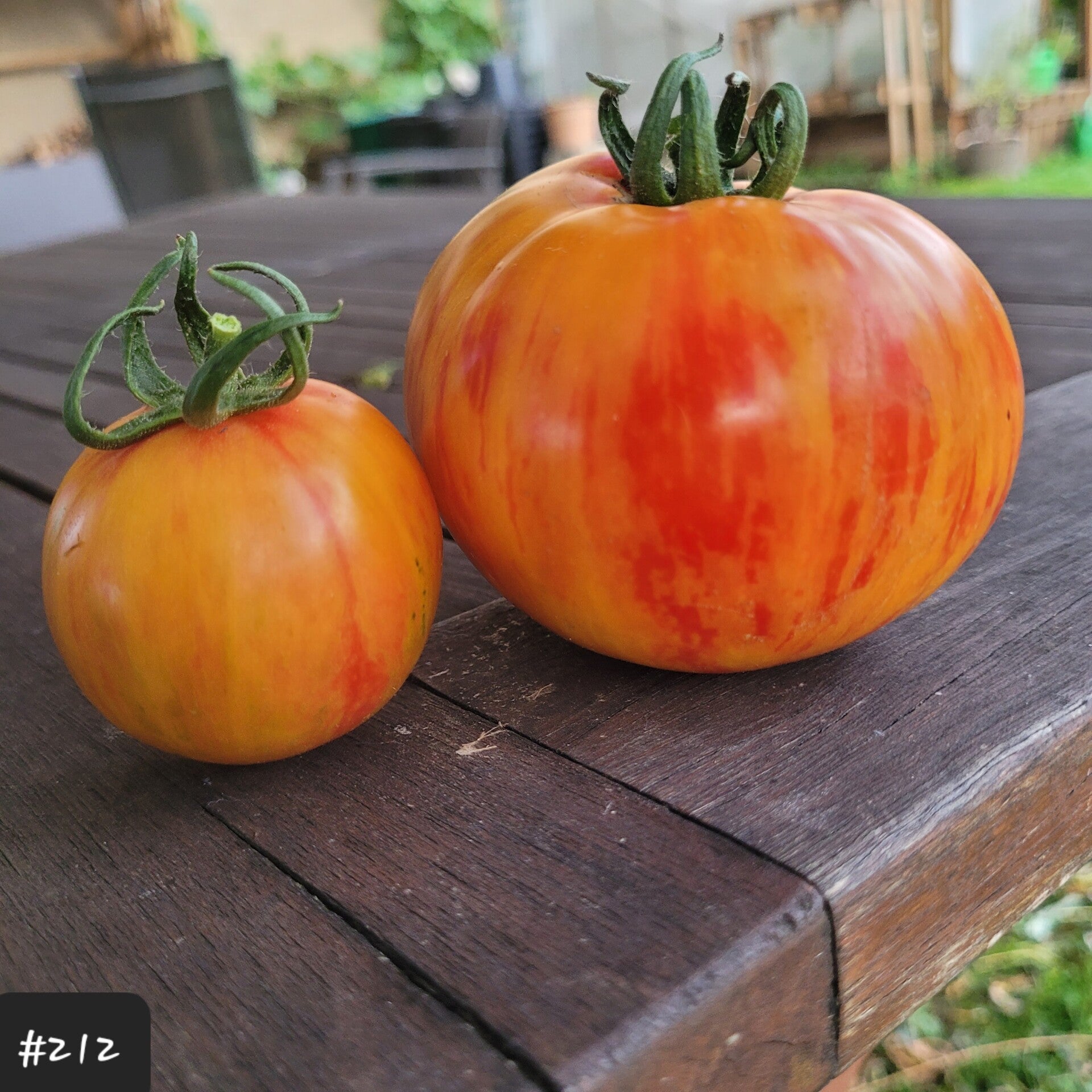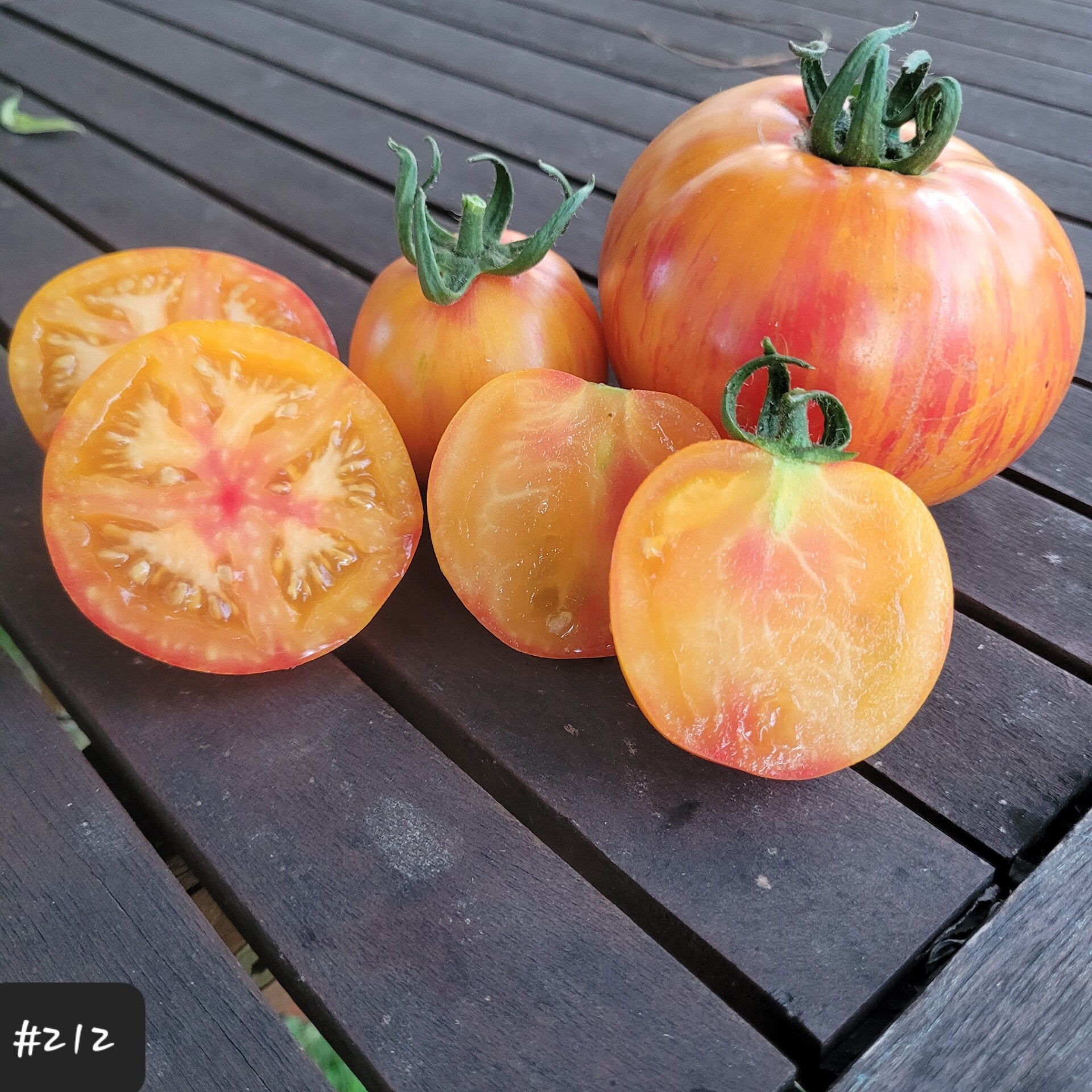 Eine schöne zweifarbige Fleischtomate. Sie ist gelb und überzogen mit roten Streifen von der Schulter bis zur Spitze (oder vielleicht auch andersherum :)