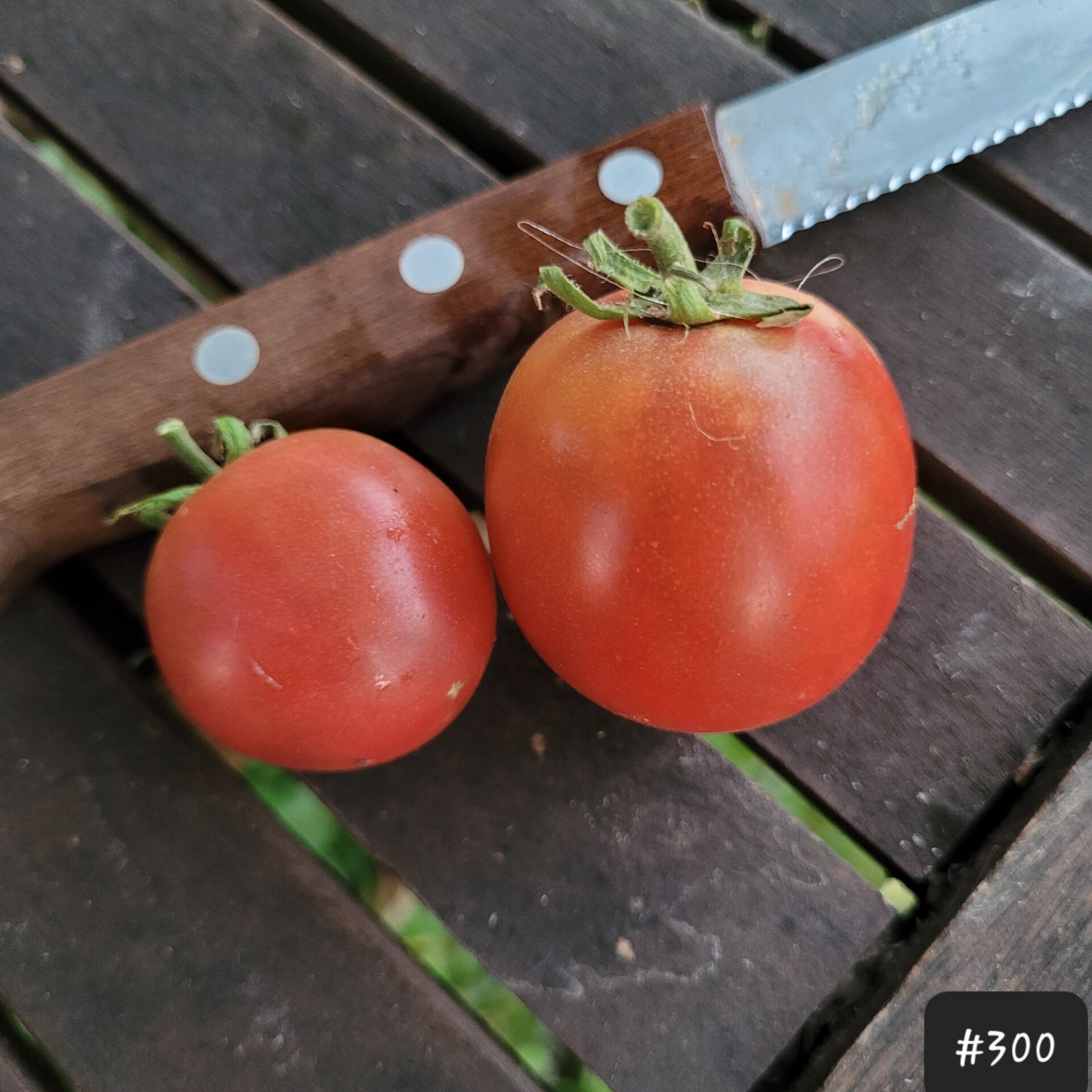 Eine schöne dunkelrote, bzw. burgunderfarbene kleinere Fleischtomate. Sie ist rund und hat teilweise eine leicht dunklere Schulter.