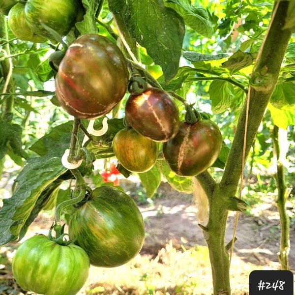 Eine wüchsige Stabtomate mit guter Produktion und schönen Früchten. Die Tomaten sind oval, beutelförmig und manchmal flachrund. Sie sehen sehr schön mehrfarbig aus. Sie sind glänzend rosarot mit vielen dunkelgrünen Streifen überzogen.