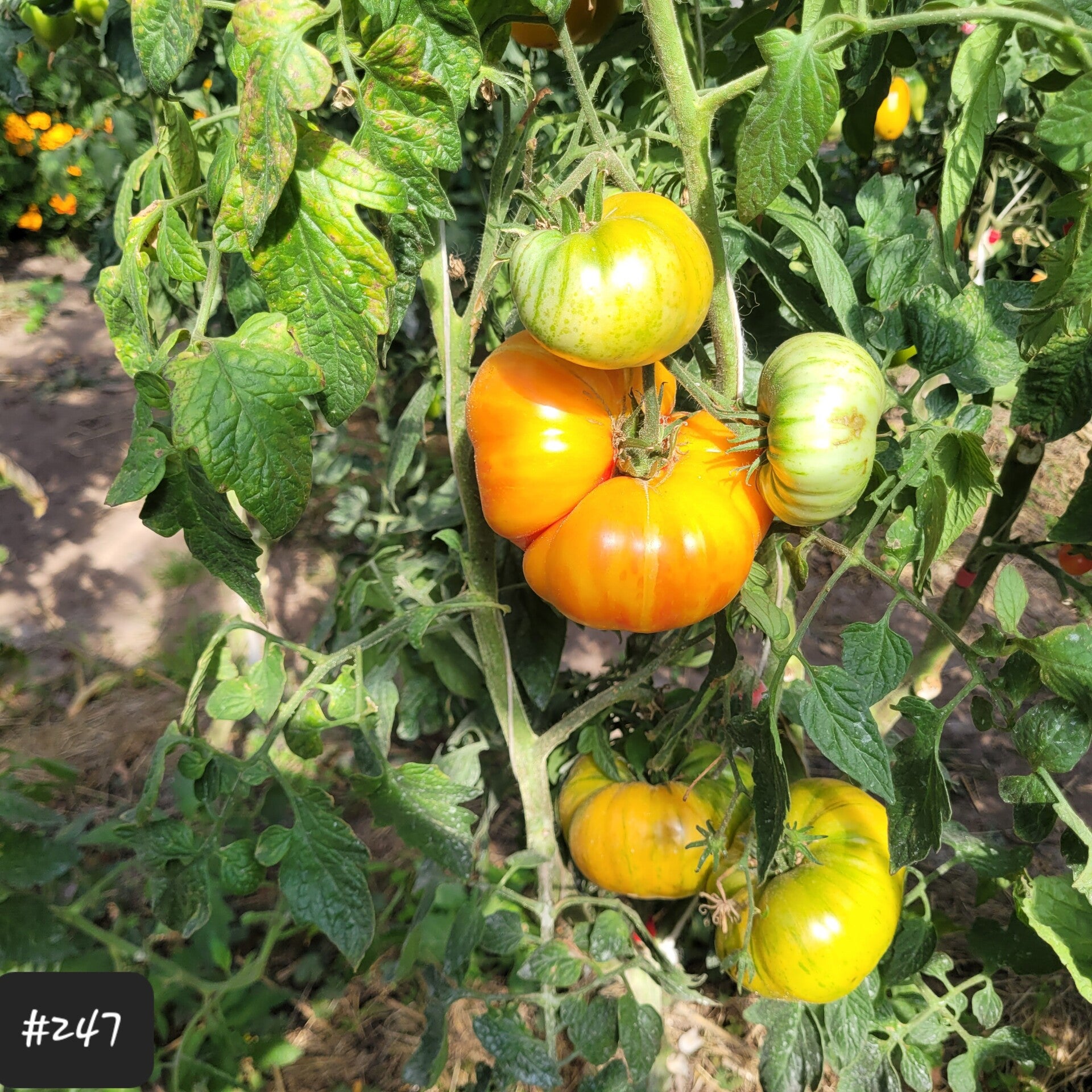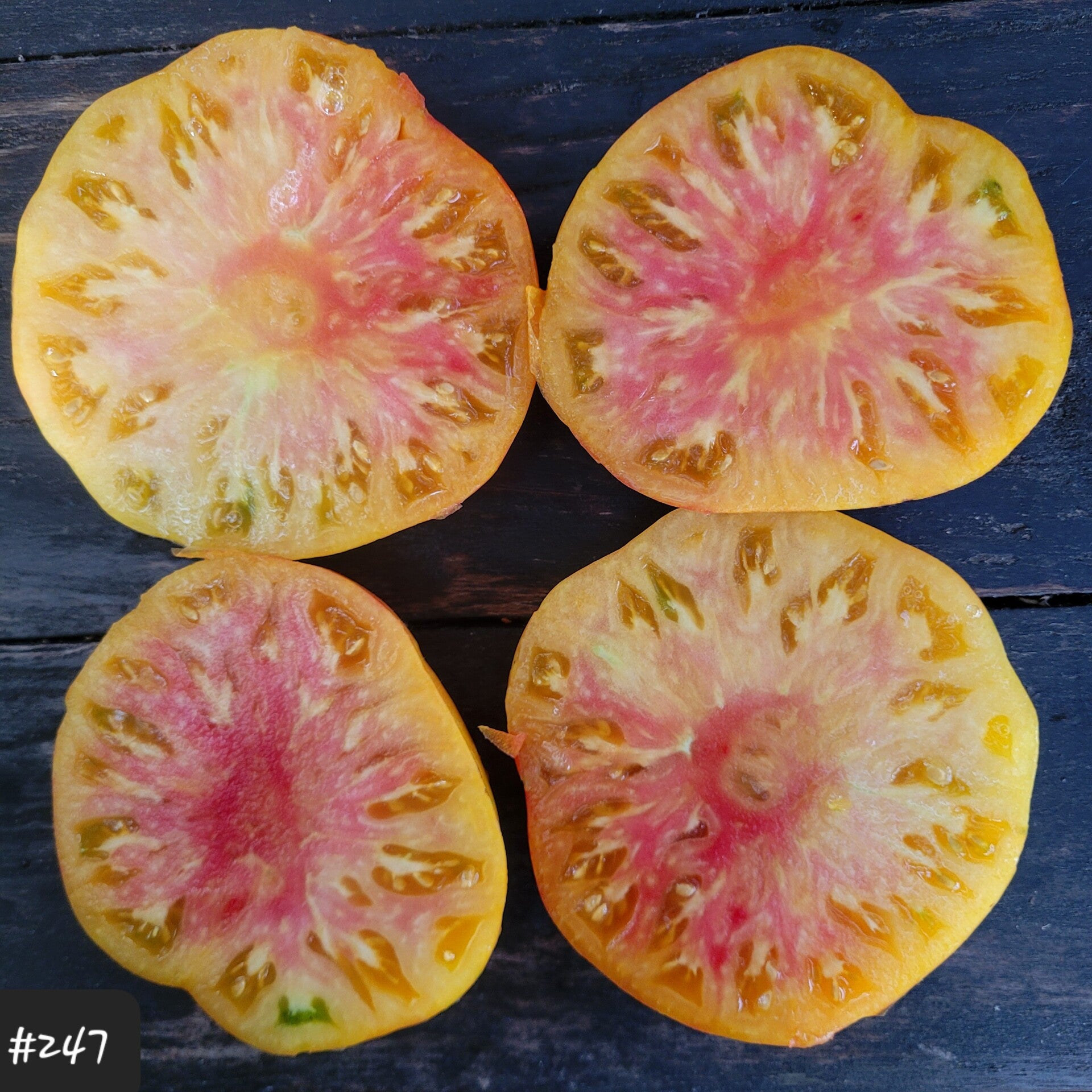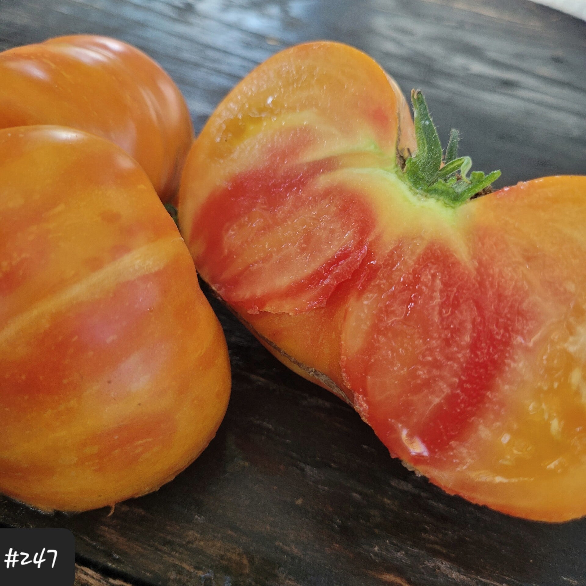 Die teilweise riesigen Fleischtomaten vom Typ Beefsteak sind sehr schön anzusehen. Sie sind gelb-orange mit roten Streifen, bzw. Bereichen. Besonders zum Boden hin ist sie eher rosarot durchfäbrt.