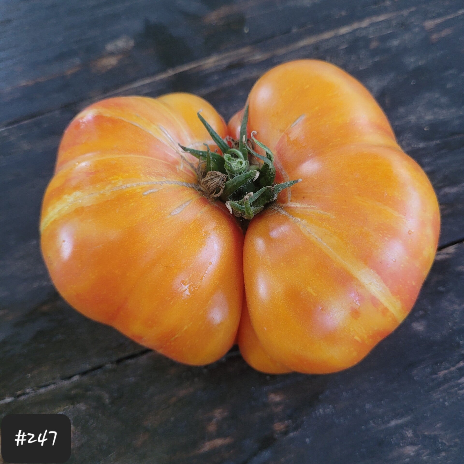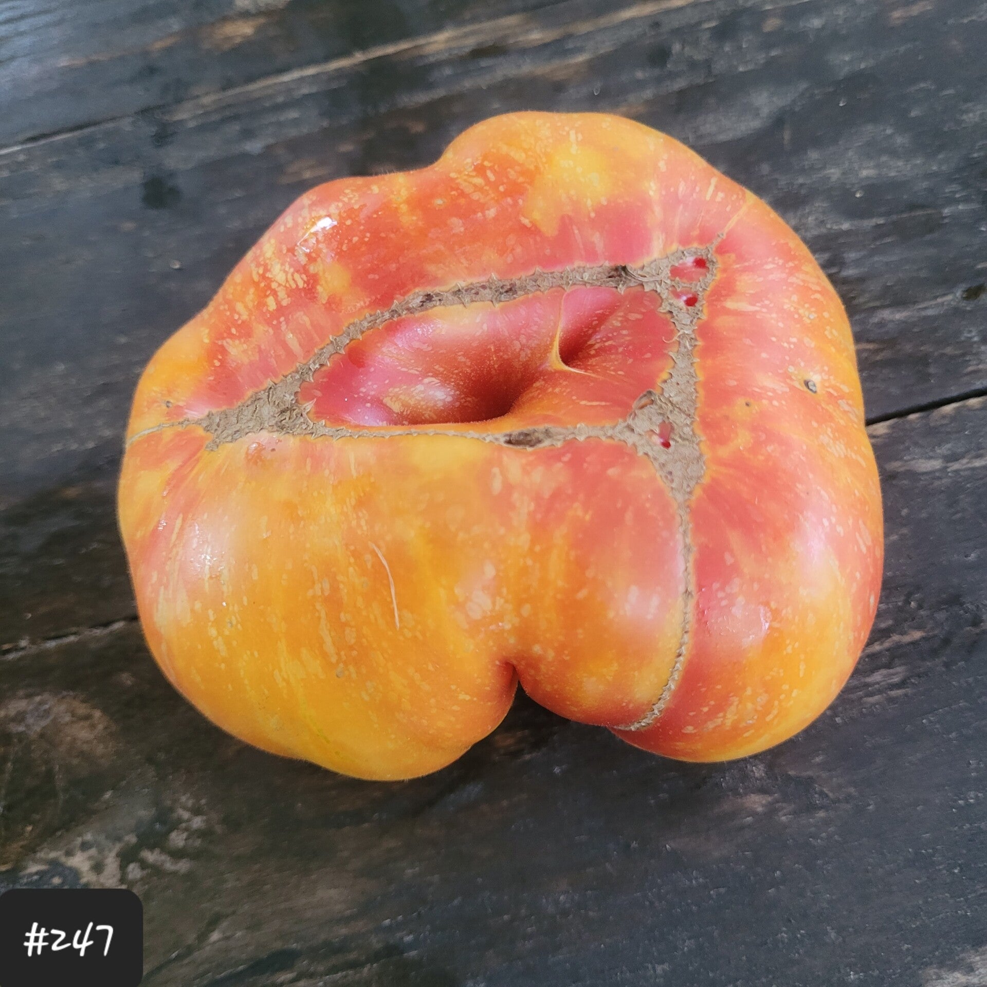 Sie ist flachrund und gerippt. Die Schale ist zart, Das FRuchtfleisch ist dicht. Aber nicht nur die Optik macht was her, auch der Geschmack ist prima. Ähnlich wie eine Ananas-Tomate schmeckt sie süß-fruchtig. Sie hat wenig Gallerte, daher ist die Säure eher hintergründig.