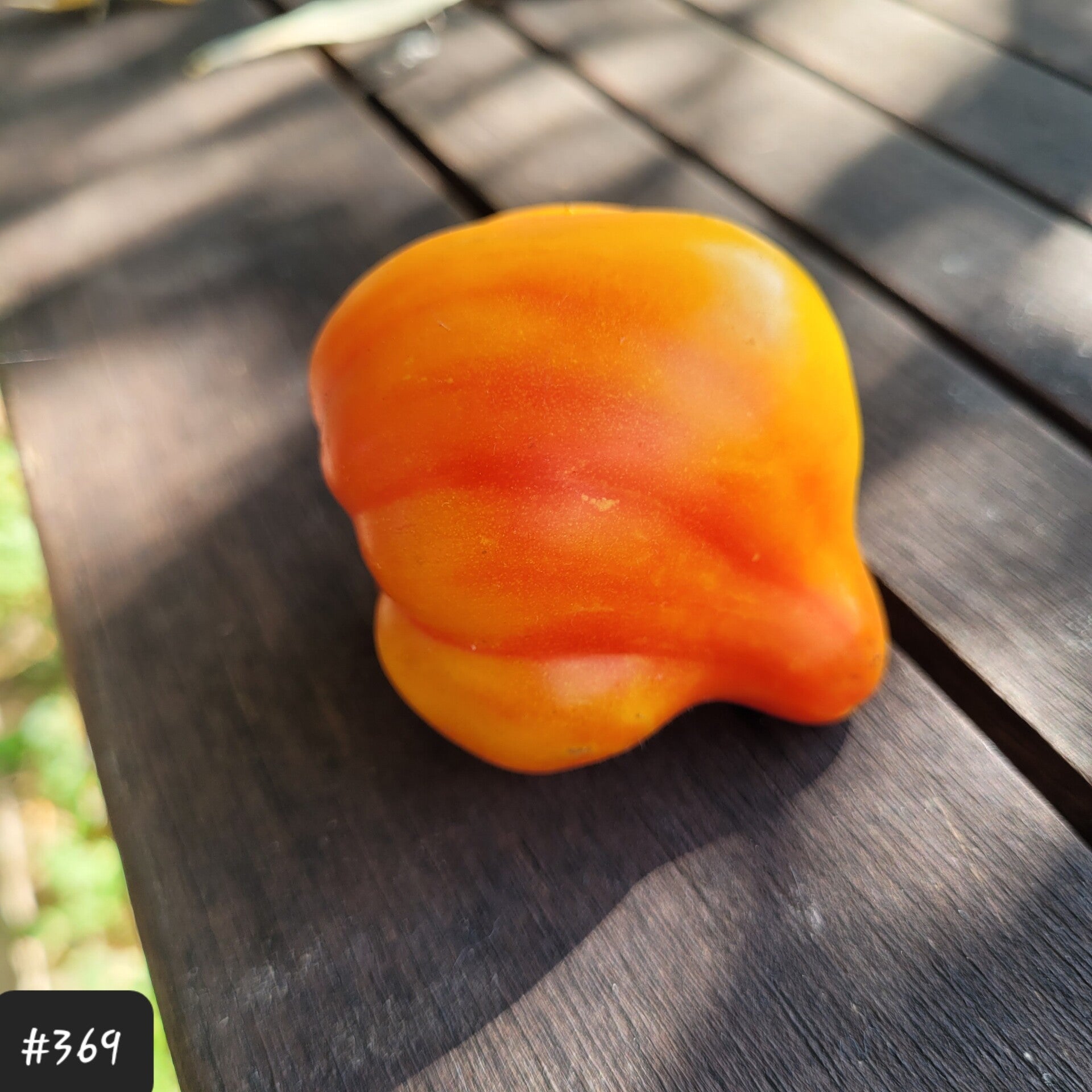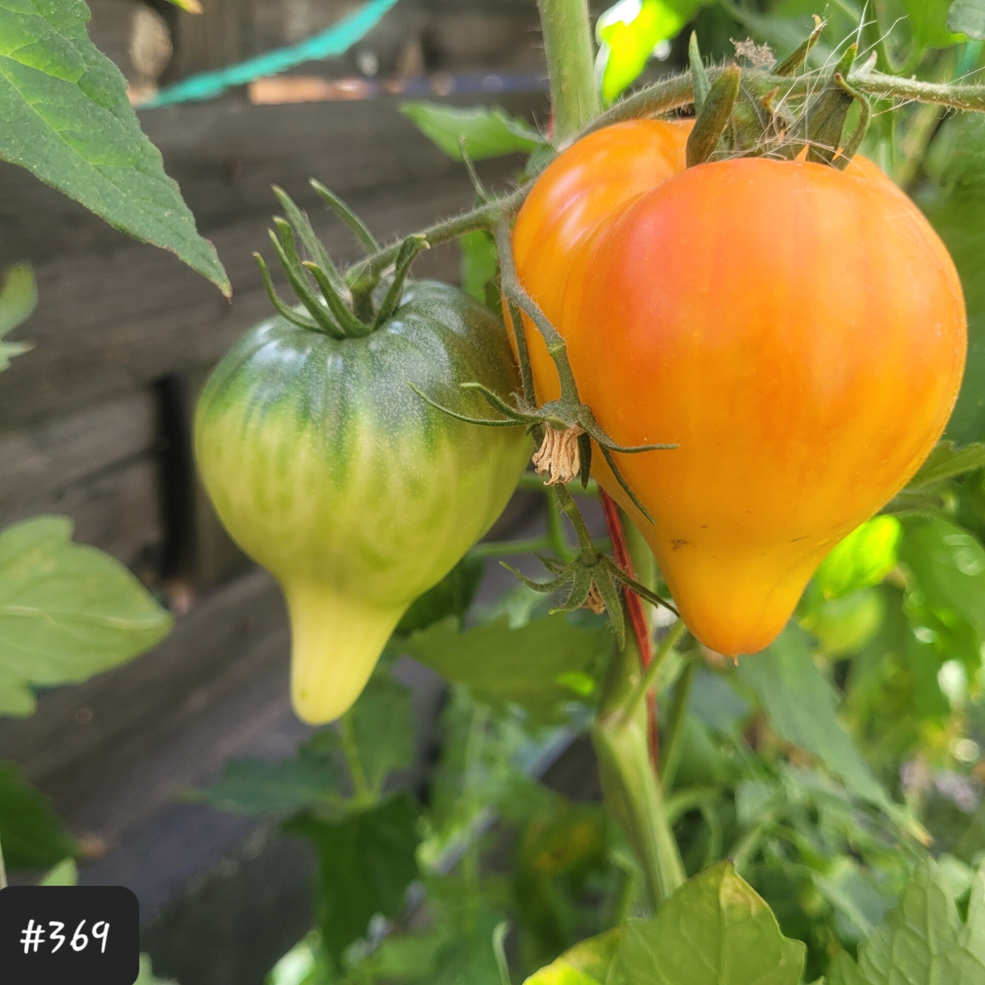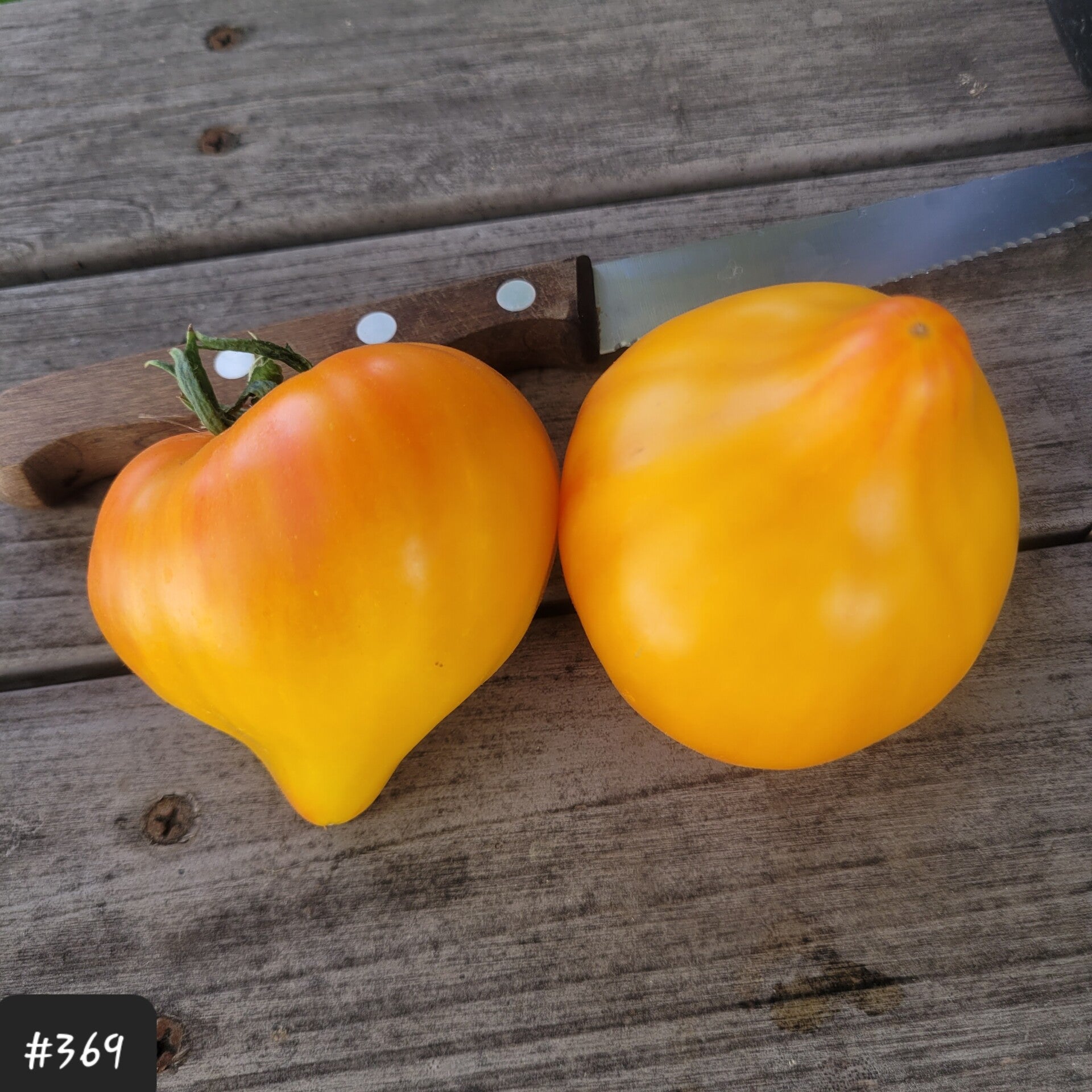 Eine sehr schöne herzförmige Fleischtomate mit ausgeprägter, aber abgeflachter Spitze. Die Früchte sind gelb-orange mit mehr oder weniger ausgeprägten rötlichen Bereichen.
