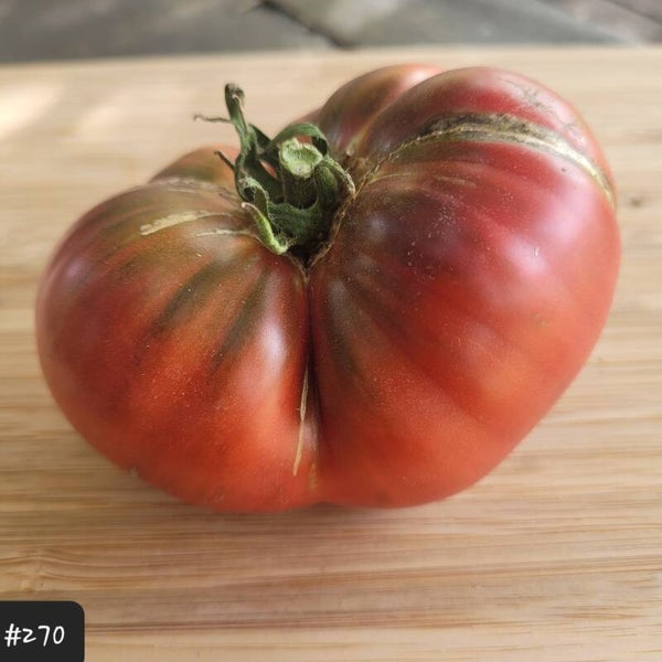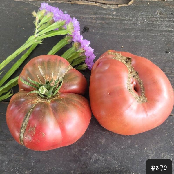 Die Tomaten sind flachrund, leicht gerippt und haben eine dunkle Schulter. Sie haben festes burgunderfarbenes Fleisch und sind trotzdem saftig und gar nicht mehlig. Sie sollen bis zu 500g schwer werden können, bei mir waren sie jedoch kleiner, um die 170g.