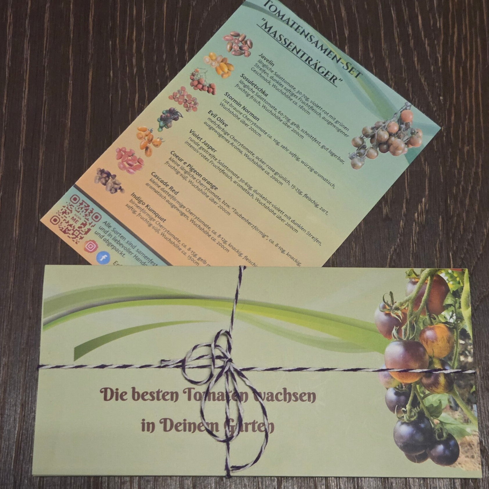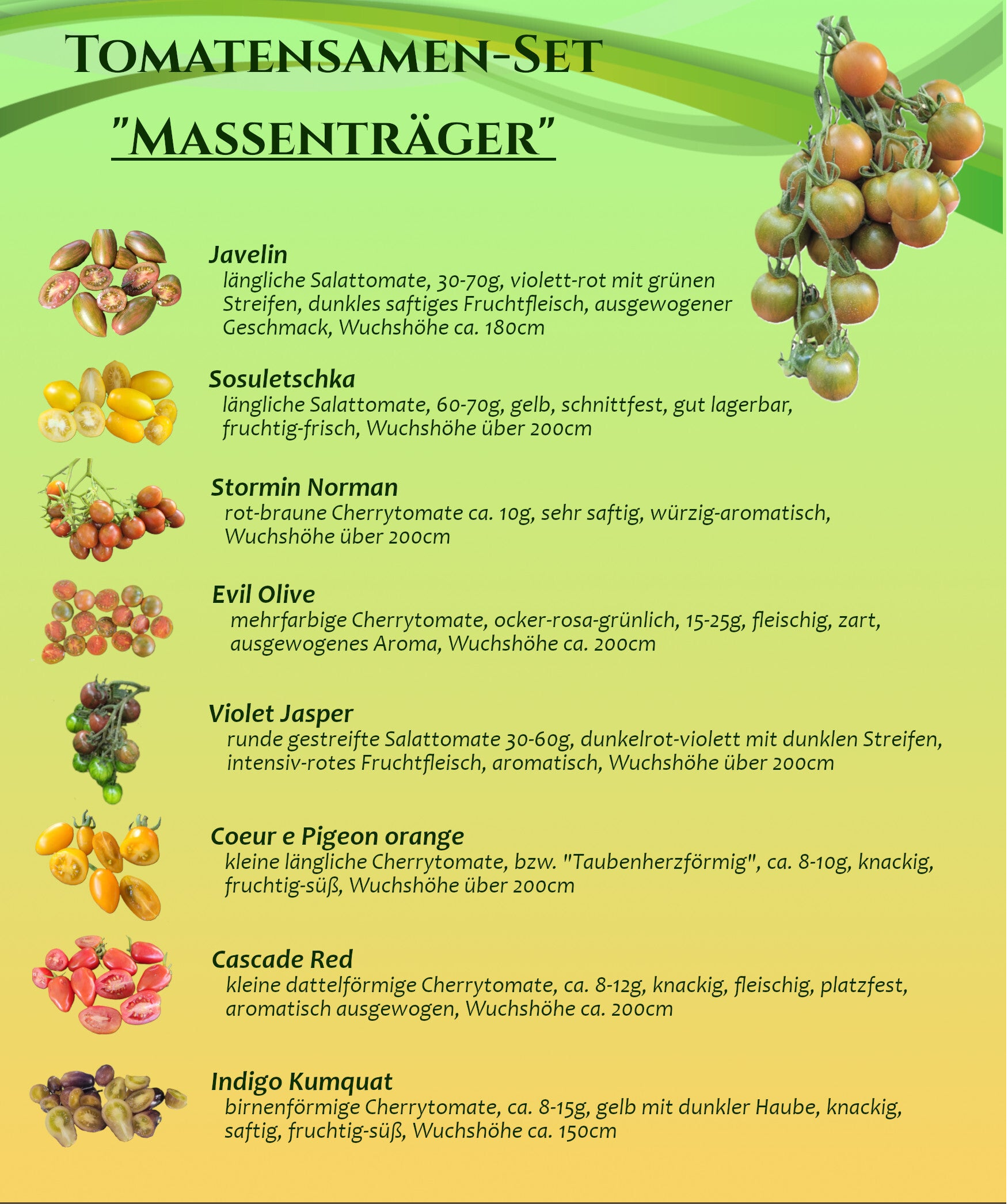 Dieses Set beinhaltet Tomatensorten, die wahre Kraftwerke in ihrer Produktivität sind. Sie produzieren eine Unmenge an Früchten. Eine schöne bunte Mischung an kleinen knackigen Cherrytomaten, aber auch mittelgroßen Salattomaten. So ist eine reiche Ernte von Beginn des Sommers bis in den frühen Herbst hinein garantiert.